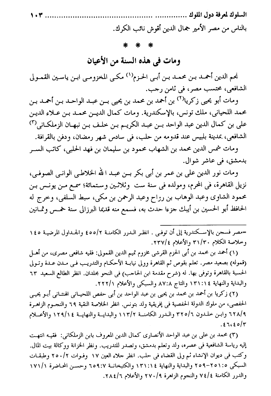 بِالنَّاسِ من مصر الْأَمِير جمال الدّين أقوش نَائِب الكرك. وَمَات فِي هَذِه السّنة من الْأَعْيَان نجم الدّين أَحْمد بن مُحَمَّد بن أبي الحزم مكي المَخْزُومِي ابْن ياسين الْقَمُولِيّ الشَّافِعِي محتسب مصر فِي ثامن رَجَب. وَمَات أَبُو يحيى زَكَرِيَّا بن أَحْمد بن مُحَمَّد بن يحيى بن عبد الْوَاحِد بن أَحْمد بن مُحَمَّد اللحياني ملك تونس بالإسكندرية. وَمَات كَمَال الدّين مُحَمَّد بن عَلَاء الدّين عَليّ بن كَمَال الدّين عبد الْوَاحِد بن عبد الْكَرِيم بن خلف بن نَبهَان الزملكاني الشَّافِعِي بِمَدِينَة بلبيسي عِنْد قدومه من حلب فِي سادس شهر رَمَضَان وَدفن بالقرافة. وَمَات شمس الدّين مُحَمَّد بن الشهَاب مَحْمُود بن سُلَيْمَان بن فَهد الْحلَبِي كَاتب السِّرّ بِدِمَشْق فِي عَاشر شَوَّال. وَمَات نور الدّين عَليّ بن عمر بن أبي بكر بن عبد الله الخلاطي الواني الصُّوفِي نزيل الْقَاهِرَة فِي الْمحرم ومولده فِي سنة سِتّ وَثَلَاثِينَ وسِتمِائَة سمع من يُونُس بن مَحْمُود الشاوي وَعبد الْوَهَّاب بن رواح وَعبد الرَّحْمَن بن مكي سبط السلَفِي وَخرج لَهُ الْحَافِظ أَبُو الْحُسَيْن بن أيبك جُزْءا حدث بِهِ فَسمع مِنْهُ قَدِيما البرزالي سنة خمس وَثَمَانِينَ