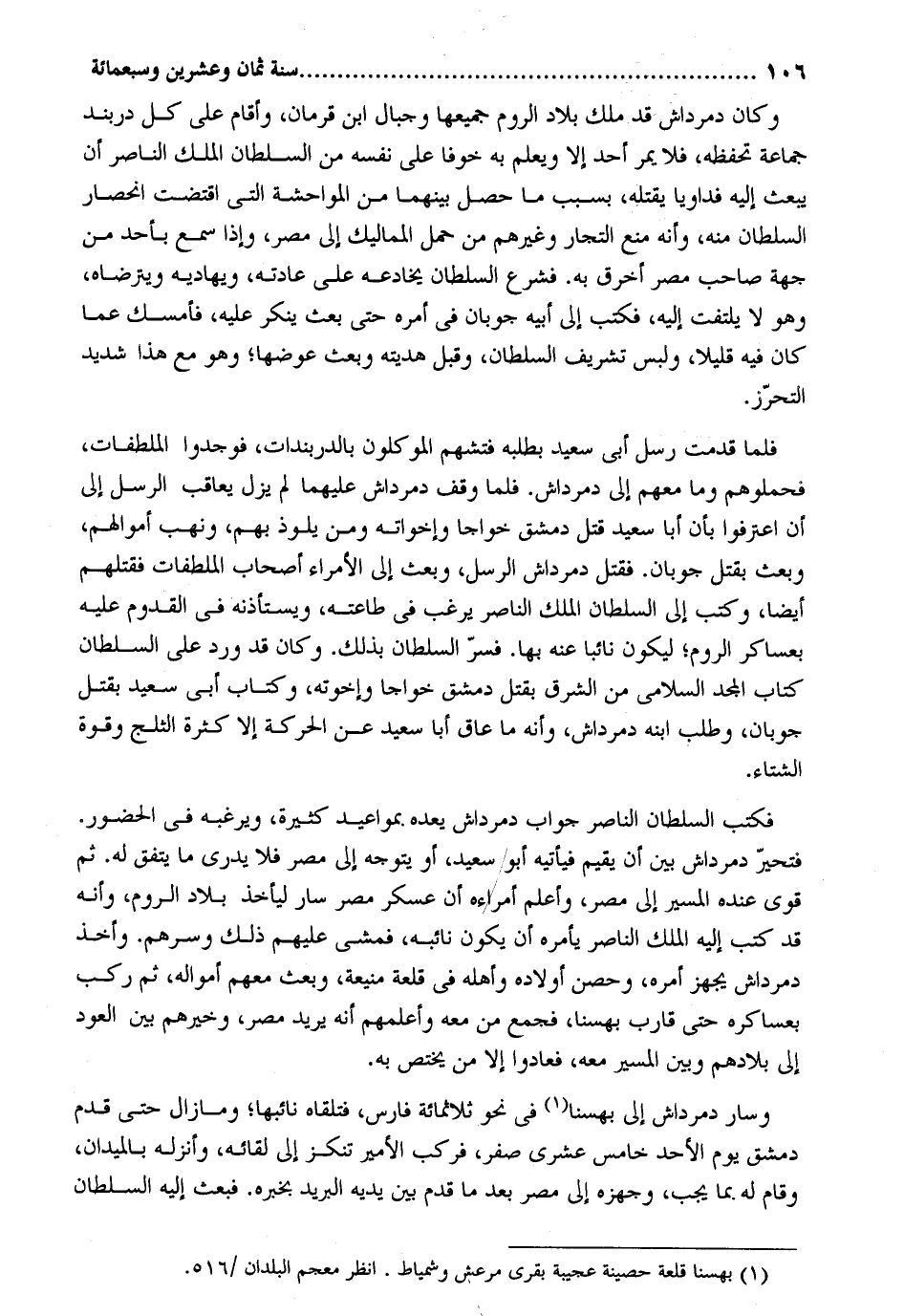 وَكَانَ دمرداش قد ملك بِلَاد الرّوم جَمِيعهَا وجبال ابْن قرمان وَأقَام على كل دربند جمَاعَة تحفظه فَلَا يمر أحد إِلَّا وَيعلم بِهِ خوفًا على نَفسه من السُّلْطَان الْملك النَّاصِر أَن يبْعَث إِلَيْهِ فداويا يقْتله بِسَبَب مَا حصل بَينهمَا من المواحشة الَّتِي اقْتَضَت انحصار السُّلْطَان مِنْهُ وَأَنه منع التُّجَّار وَغَيرهم من حمل المماليك إِلَى مصر وَإِذا سمع بِأحد من جِهَة صَاحب مصر أخرق بِهِ. فشرع السُّلْطَان يخادعه على عَادَته ويهاديه ويترضاه وَهُوَ لَا يلْتَفت إِلَيْهِ فَكتب إِلَى أَبِيه جوبان فِي أمره حَتَّى بعث يُنكر عَلَيْهِ فَأمْسك عَمَّا كَانَ فِيهِ قَلِيلا وَلبس تشريف السُّلْطَان وَقبل هديته وَبعث عوضهَا وَهُوَ مَعَ هَذَا شَدِيد التَّحَرُّز. فَلَمَّا قدمت رسل أبي سعيد بِطَلَبِهِ فتشهم الموكلون بالدربندات فوجدوا الملطفات فحملوهم وَمَا مَعَهم إِلَى دمرداش. فَلَمَّا وقف دمرداش عَلَيْهِمَا لم يزل يُعَاقب الرُّسُل إِلَى أَن اعْتَرَفُوا بِأَن أَبَا سعيد قتل دمشق خواجا وإخواته وَمن يلوذ بهم وَنهب أَمْوَالهم وَبعث بقتل جوبان. فَقتل دمرداش الرُّسُل وَبعث إِلَى الْأُمَرَاء أَصْحَاب الملطفات فَقَتلهُمْ أَيْضا وَكتب إِلَى السُّلْطَان الْملك النَّاصِر يرغب فِي طَاعَته ويستأذنه فِي الْقدوم عَلَيْهِ بعساكر الرّوم ليَكُون نَائِبا عَنهُ بهَا. فسر السُّلْطَان بذلك. وَكَانَ قد ورد على السُّلْطَان كتاب الْمجد السلَامِي من الشرق بقتل دمشق خواجا واخوته وَكتاب أبي سعيد بقتل جوبان وَطلب ابْنه دمرداش وَأَنه مَا عَاق أَبَا سعيد عَن الْحَرَكَة إِلَّا كَثْرَة الثَّلج وَقُوَّة الشتَاء. فَكتب السُّلْطَان النَّاصِر جَوَاب دمرداش يعده بمواعيد كَثِيرَة ويرعبه فِي الْحُضُور. فتحير دمرداش بَين أَن يُقيم فيأتيه أَبُو سعيد أَو يتَوَجَّه إِلَى مصر فَلَا يدْرِي مَا يتَّفق لَهُ. ثمَّ قوي عِنْده الْمسير إِلَى مصر وَأعلم أمراءه أَن عَسْكَر مصر سَار ليَأْخُذ بِلَاد الرّوم وَأَنه قد كتب إِلَيْهِ الْملك النَّاصِر يَأْمُرهُ أَن يكون نَائِبه فَمشى عَلَيْهِم ذَلِك وسرهم. وَأخذ دمرداش يُجهز أمره وحصن أَوْلَاده وَأَهله فِي قلعة منيعة وَبعث مَعَهم أَمْوَاله ثمَّ ركب بعساكره حَتَّى قَارب بهسنا فَجمع من مَعَه وأعلمهم أَنه يُرِيد مصر وَخَيرهمْ بَين الْعود إِلَى بِلَادهمْ وَبَين الْمسير مَعَه فعادوا إِلَّا من يخْتَص بِهِ. وَسَار دمرداش إِلَى بهسنا فِي نَحْو ثَلَاثمِائَة فَارس فَتَلقاهُ نائبها ومازال حَتَّى قدم دمشق يَوْم الْأَحَد خَامِس عشرى صفر فَركب الْأَمِير تنكز إِلَى لِقَائِه وأنزله بالميدان وَقَامَ لَهُ بِمَا يجب وجهزه إِلَى مصر بعد مَا قدم بَين يَدَيْهِ الْبَرِيد بِخَبَرِهِ. فَبعث إِلَيْهِ السُّلْطَان