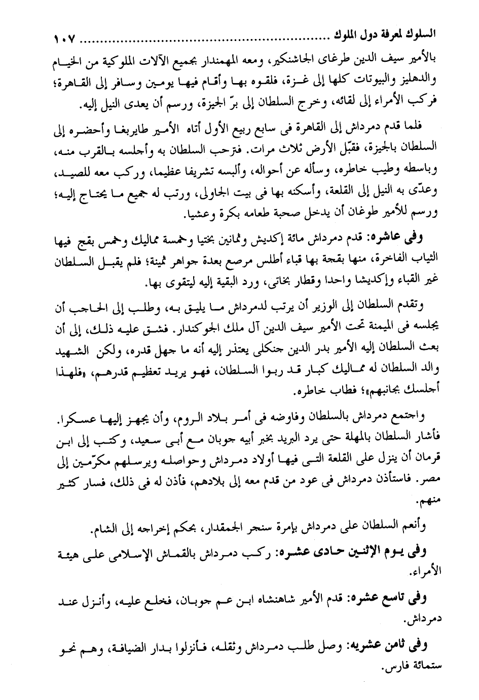 بالأمير سيف الدّين طرغاي الجاشنكير وَمَعَهُ المهمندار بِجَمِيعِ الْآلَات الملوكية من الْخيام والدهليز والبيوتات كلهَا إِلَى غَزَّة فَلَقوهُ بهَا وَأقَام فِيهَا يَوْمَيْنِ وسافر إِلَى الْقَاهِرَة فَركب الْأُمَرَاء إِلَى لِقَائِه وَخرج السُّلْطَان إِلَى بر الجيزة ورسم أَن يعدي النّيل إِلَيْهِ. فَلَمَّا قدم دمرداش إِلَى الْقَاهِرَة فِي سَابِع ربيع الأول أَتَاهُ الْأَمِير طايربغا وأحضره إِلَى السُّلْطَان بالجيزة فَقبل الأَرْض ثَلَاث مَرَّات. فترحب السُّلْطَان بِهِ وَأَجْلسهُ بِالْقربِ مِنْهُ وباسطه وَطيب خاطره وَسَأَلَهُ عَن أَحْوَاله وَألبسهُ تَشْرِيفًا عَظِيما وَركب مَعَه للصَّيْد وعدى بِهِ النّيل إِلَى القلعة وَأَسْكَنَهُ بهَا فِي بَيت الجاولي ورتب لَهُ جَمِيع مَا يحْتَاج إِلَيْهِ ورسم للأمير طوغان أَن يدْخل صُحْبَة طَعَامه بكرَة وعشيا. وَفِي عاشره: قدم دمرداش مائَة إكديش وَثَمَانِينَ بختيا وَخَمْسَة مماليك وَخمْس بقج فِيهَا الثِّيَاب الفاخرة مِنْهَا بقجة بهَا قبَاء أطلس مرصع بعدة جَوَاهِر ثمينة فَلم يقبل السُّلْطَان غير القباء وإكديشاً وَاحِدًا وقطار بخات ورد البقيه إِلَيْهِ ليتقوى بهَا. وَتقدم السُّلْطَان إِلَى الْوَزير أَن يرتب لدمرداش مَا يَلِيق بِهِ وَطلب إِلَى الْحَاجِب أَن يجلسه فِي الميمنة تَحت الْأَمِير سيف الدّين آل ملك الجوكندار. فشق عَلَيْهِ ذَلِك إِلَى أَن بعث السُّلْطَان إِلَيْهِ الْأَمِير بدر الدّين جنكلي يعْتَذر إِلَيْهِ أَنه مَا جهل قدره وَلَكِن الشَّهِيد وَالِد السُّلْطَان لَهُ مماليك كبار قد ربوا السُّلْطَان فَهُوَ يُرِيد تَعْظِيم قدرهم فَلهَذَا أجلسك بجانبهم فطاب خاطره. وَاجْتمعَ دمرداش بالسلطان وفاوضه فِي أَمر بِلَاد الرّوم وَأَن يُجهز إِلَيْهَا عسكراً. فَأَشَارَ السُّلْطَان بالمهلة حَتَّى يرد الْبَرِيد بِخَبَر أَبِيه جوبان مَعَ أبي سعيد وَكتب إِلَى ابْن قرمان أَن ينزل على القلعة الَّتِي فِيهَا أَوْلَاد دمرداش وحواصله ويرسلهم مكرمين إِلَى مصر. فَاسْتَأْذن دمرداش فِي عود من قدم مَعَه إِلَى بِلَادهمْ فَأذن لَهُ فِي ذَلِك فَسَار كثير مِنْهُم. وَهِي يَوْم الْإِثْنَيْنِ حادي عشره: ركب دمرداش بالقماش الإسلامي على هَيْئَة الْأُمَرَاء. وَفِي تَاسِع عشره: قدم الْأَمِير شاهنشاه ابْن عَم جوبان فَخلع عَلَيْهِ وَأنزل عِنْد دمرداش. وَفِي ثامن عشريه: وصل طلب دمرداش وَثقله فأنزلوا بدار الضِّيَافَة وهم نَحْو سِتّمائَة فَارس.