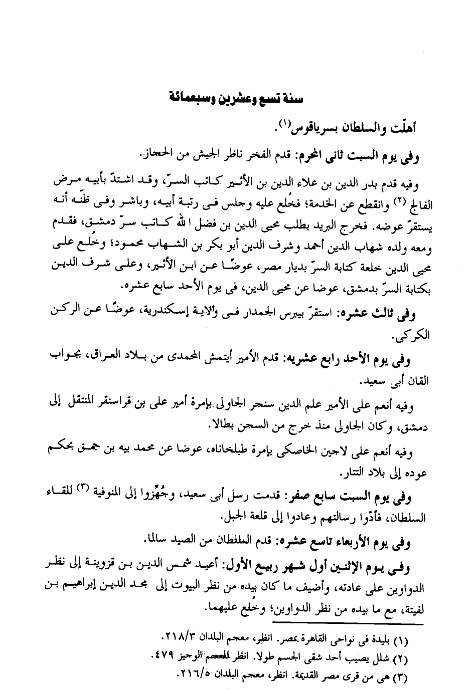 أهلت وَالسُّلْطَان بسرياقوس. وَفِي يَوْم السبت ثَانِي الْمحرم: قدم الْفَخر نَاظر الْجَيْش من الْحجاز. وَفِيه قدم بدر الدّين بن عَلَاء الدّين بن الْأَثِير كَاتب السِّرّ وَقد اشْتَدَّ بِأَبِيهِ مرض الفالج وَانْقطع عَن الْخدمَة فَخلع عَلَيْهِ وَجلسَ فِي رُتْبَة أَبِيه وباشر وَفِي ظَنّه أَنه يسْتَقرّ عوضه. فَخرج الْبَرِيد بِطَلَب محيي الدّين بن فضل الله كَاتب سر دمشق فَقدم وَمَعَهُ وَلَده شهَاب الدّين أَحْمد وَشرف الدّين أَبُو بكر بن الشهَاب مَحْمُود وخلع على محيي الدّين خلعة كِتَابَة السِّرّ بديار مصر عوضا عَن ابْن الْأَثِير وعَلى شرف الدّين بِكِتَابَة السِّرّ بِدِمَشْق عوضا عَن محيي الدّين فِي يَوْم الْأَحَد سَابِع عشره. وَفِي ثَالِث عشره: اسْتَقر بيبرس الجمدار فِي ولَايَة إسكندربة عوضا عَن الرُّكْن الكركي. وَفِي يَوْم الْأَحَد رَابِع عشريه: قدم الْأَمِير أيتمش المحمدي من بِلَاد الْعرَاق بِجَوَاب القان أبي سعيد. وَفِيه أنعم على الْأَمِير علم الدّين سنجر الجاولي بإمرة أَمِير عَليّ بن قراسنقر الْمُنْتَقل إِلَى دمشق وَفِيه أنعم على لاحين الخاصكي بإمرة طبلخاناه عوضا عَن مُحَمَّد بيه بن جمق بِحكم عوده إِلَى بِلَاد التتار. وَفِي يَوْم السبت سَابِع صفر: قدمت رسل أبي سعيد وجهزوا إِلَى المنوفية للقاء السُّلْطَان فأدوا رسالتهم وعادوا إِلَى قلعة الْجَبَل. وَفِي يَوْم الْأَرْبَعَاء تَاسِع عشره: قدم السللطان من الصَّيْد سالما. وَفِي يَوْم الْإِثْنَيْنِ أول شهر ربيع الأول: أُعِيد شمس الدّين بن قزوينة إِلَى نظر الدَّوَاوِين على عَادَته وأضيف مَا كَانَ بِيَدِهِ من نظر الْبيُوت إِلَى مجد الدّين إِبْرَاهِيم بن لفيتة مَعَ مَا بِيَدِهِ من نظر الدَّوَاوِين وخلع عَلَيْهِمَا.