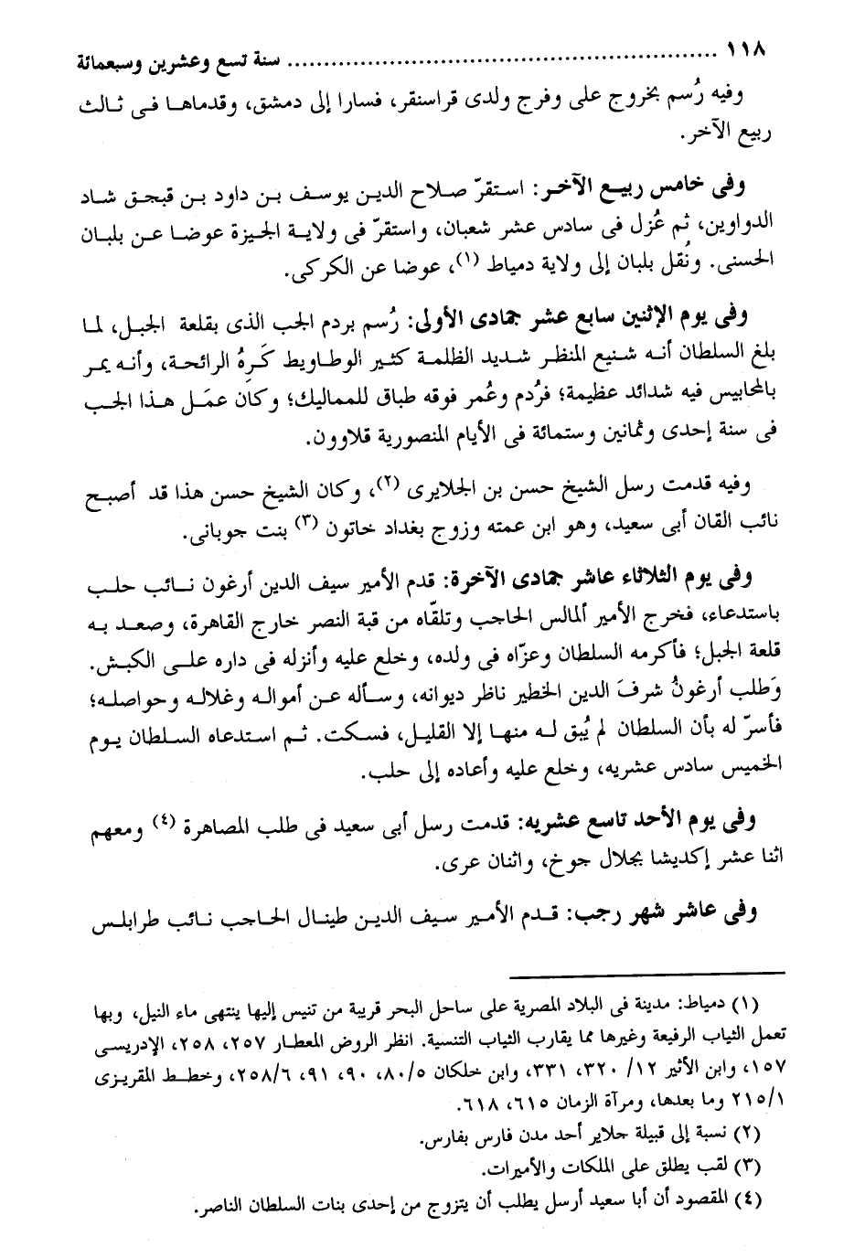 وَفِيه رسم بِخُرُوج عَليّ وَفرج وَلَدي قراسنقر فسارا إِلَى دمشق وقدماها فِي ثَالِث ربيع الآخر. وَفِي خَامِس ربيع الآخر: اسْتَقر صَلَاح الدّين يُوسُف بن دَاوُد بن قبجق شاد الدَّوَاوِين ثمَّ عزل فِي سادس عشر شعْبَان وَاسْتقر فِي ولَايَة الجيزة عوضا عَن بلبان الحسني. وَنقل بلبان إِلَى ولَايَة دمياط عوضا عَن الكركي. وَفِي يَوْم الْإِثْنَيْنِ سَابِع عشر جُمَادَى الأولى: رسم بردم الْجب الَّذِي بقلعة الْجَبَل لما بلغ السُّلْطَان أَنه شنيع المنظر شَدِيد الظلمَة كثير الوطاويط كره الرَّائِحَة وَأَنه يمر بالمحابيس فِيهِ شَدَائِد عَظِيمَة فردم وَعمر فَوْقه طباق للمماليك وَكَانَ عمل هَذَا الْجب فِي سنة احدى وَثَمَانِينَ وسِتمِائَة فِي الْأَيَّام المنصورية قلاوون. وَفِيه قدمت رسل الشَّيْخ حسن بن الجلايري وَكَانَ الشَّيْخ حسن هَذَا قد أصبح نَائِب القان أبي سعيد وَهُوَ ابْن عمته وَزوج بَغْدَاد خاتون بنت جوباني. وَفِي يَوْم الثُّلَاثَاء عَاشر جُمَادَى الْآخِرَة: قدم الْأَمِير سيف الدّين أرغون نَائِب حلب باستدعاء مخرج الْأَمِير ألمالس الْحَاجِب وتلقاه من قبَّة النَّصْر خَارج الْقَاهِرَة وَصعد بِهِ قلعة الْجَبَل فَأكْرمه السُّلْطَان وَعَزاهُ فِي وَلَده وخلع عَلَيْهِ وأنزله فِي دَاره على الْكَبْش. وَطلب أرغون شرف الدّين الخطير نَاظر ديوانه وَسَأَلَهُ عَن أَمْوَاله وغلاله وحواصله فَأسر لَهُ بِأَن السُّلْطَان لم يبْق لَهُ مِنْهَا إِلَّا الْقَلِيل فَسكت ثمَّ استدعاه السُّلْطَان يَوْم الْخَمِيس سادس عشريه وخلع عَلَيْهِ وَأَعَادَهُ إِلَى حلب. وَفِي يَوْم الْأَحَد تَاسِع عشريه: قدمت رسل أبي سعيد فِي طلب الْمُصَاهَرَة وَمَعَهُمْ اثْنَا عشر إكديشاً بِجلَال جوخ وَاثْنَانِ عري. وَفِي عَاشر شهر رَجَب: قدم الْأَمِير سيف الدّين طينال الْحَاجِب نَائِب طرابلس