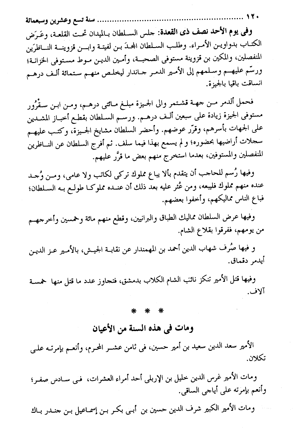 وَفِي يَوْم الْأَحَد نصف ذِي الْقعدَة: جلس السُّلْطَان بالميدان تَحت القلعة وَعرض الْكتاب بدواوين الْأُمَرَاء. وَطلب السُّلْطَان الْمجد بن لفيتة وَابْن قزوينة الناظرين المنفصلين والمكين بن قزوينة مُسْتَوْفِي الصُّحْبَة وَأمين الدّين موط مُسْتَوْفِي الخزانة ورسم عَلَيْهِم وسلمهم إِلَى الْأَمِير الدمر حاندار ليخلص مِنْهُم سِتّمائَة ألف دِرْهَم انساقت بَاقِيا بالجيزة. فَحمل ألدمر من جِهَة قشتمر وَالِي الجيزة مبلغ مِائَتي دِرْهَم وَمن ابْن سقرور مُسْتَوْفِي الجيزة زِيَادَة على سبعين ألف دِرْهَم. ورسم السُّلْطَان بِقطع أخباز المشدين على الْجِهَات بأسرهم وَقرر عوضهم. وأحضر السُّلْطَان مَشَايِخ الجيزة وَكتب عَلَيْهِم سجلات أراضيها بِحُضُورِهِ وَلم يسمع بِهَذَا فِيمَا سلف. ثمَّ أفرج السُّلْطَان عَن الناظرين المنفصلين والمستوفين بَعْدَمَا استخرج مِنْهُم بعض مَا قرر عَلَيْهِم. وفيهَا رسم للحاجب أَن يتَقَدَّم بألا يُبَاع مَمْلُوك تركي لكاتب وَلَا عَامي وَمن وجد عِنْده مِنْهُم مَمْلُوك فليبعه وَمن عثر عَلَيْهِ بعد ذَلِك أَن عِنْده مَمْلُوكا طولع بِهِ السُّلْطَان فَبَاعَ النَّاس مماليكهم وأخفوا بَعضهم. وفيهَا عرض السُّلْطَان مماليك الطاق والبرانيين وَقطع مِنْهُم مائَة وَخمسين وأخرجهم من يومهم ففرقوا بقلاع الشَّام. وفيهَا صرف شهَاب الدّين أَحْمد بن المهمندار عَن نقابة الْجَيْش بالأمير عز الدّين أيدمر دقماق. وفيهَا قتل الْأَمِير تنكز نَائِب الشَّام الْكلاب بِدِمَشْق فَتَجَاوز عدد مَا قتل مِنْهَا خَمْسَة الْأَمِير سعد الدّين سعيد بن أَمِير حُسَيْن فِي ثامن عشر الْمحرم وأنعم بإمرته على تكلان. وَمَات الْأَمِير غرس الدّين خَلِيل بن الإربدي أحد أُمَرَاء العشرات فِي سادس صفر وأنعم بإمرته على أياجي الساقي. وَمَات الْأَمِير الْكَبِير شرف الدّين حُسَيْن بن أبي بكر بن إِسْمَاعِيل بن جندو باك