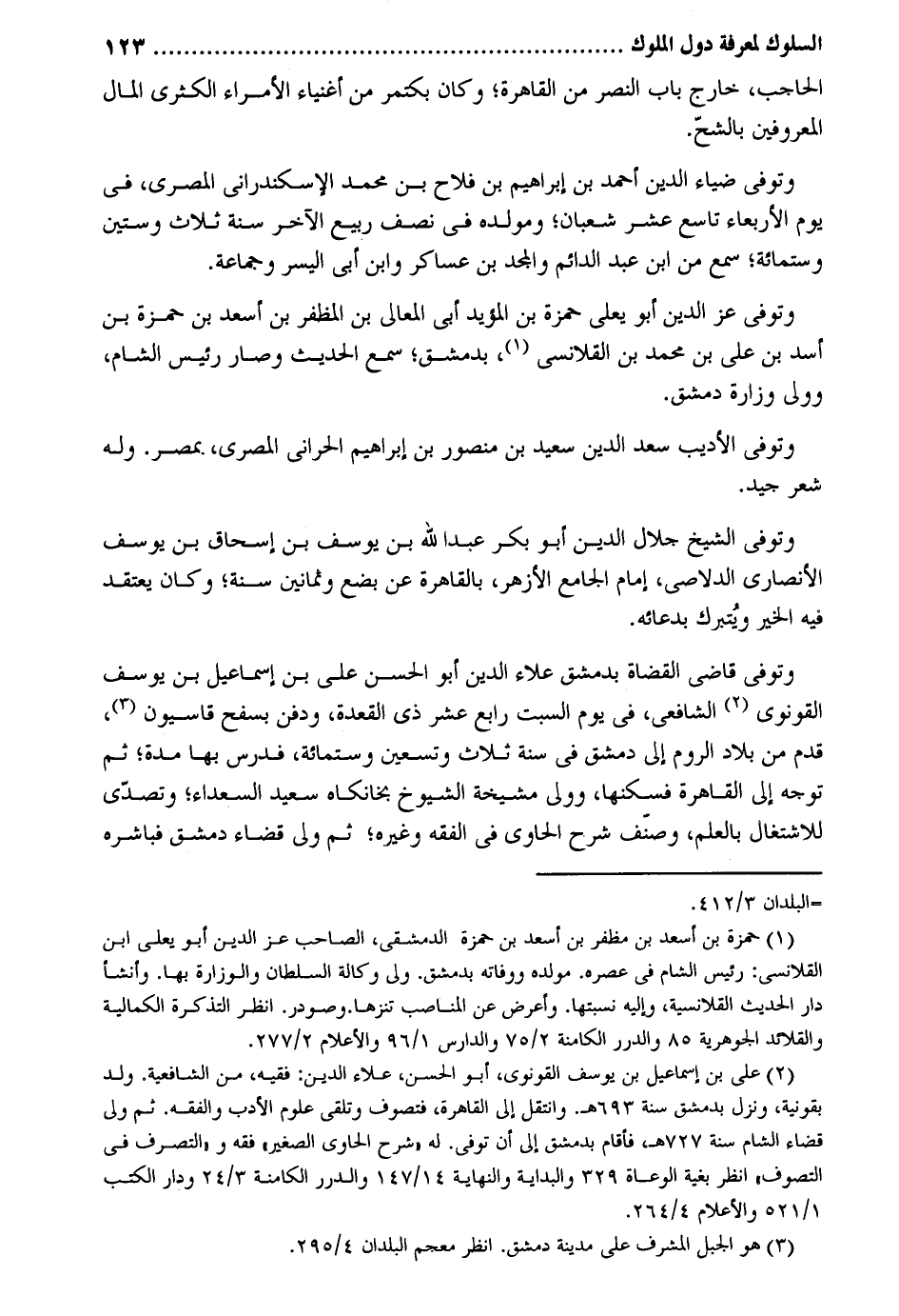الْحَاجِب خَارج بَاب النَّصْر من الْقَاهِرَة وَكَانَ بكتمر من أَغْنِيَاء الْأُمَرَاء الكثري المَال المعروفين بالشح. وَتُوفِّي ضِيَاء الدّين أَحْمد بن إِبْرَاهِيم بن فلاح بن مُحَمَّد الإسْكَنْدراني الْمصْرِيّ فِي يَوْم الْأَرْبَعَاء تَاسِع عشر شعْبَان ومولده فِي نصف ربيع الآخر سنة ثَلَاث وَسِتِّينَ وسِتمِائَة سمع من ابْن عبد الدَّائِم وَالْمجد بن عَسَاكِر وَابْن أبي الْيُسْر وَجَمَاعَة. وَتُوفِّي عز الدّين أَبُو يعلى حَمْزَة بن الْمُؤَيد أبي الْمَعَالِي بن المظفر بن أسعد بن حمزه بن أَسد بن عَليّ بن مُحَمَّد بن القلانسي بِدِمَشْق سمع الحَدِيث وَصَارَ رَئِيس الشَّام وَولى وزارة دمشق. وَتُوفِّي الأديب سعد الدّين سعيد بن مَنْصُور بن إِبْرَاهِيم الْحَرَّانِي الْمصْرِيّ بِمصْر وَله شعر جيد. وَتُوفِّي الشَّيْخ جلال الدّين أَبُو بكر عبدا لله بن يُوسُف بن إِسْحَاق بن يُوسُف الْأنْصَارِيّ الدلاصي إِمَام الْجَامِع الْأَزْهَر بِالْقَاهِرَةِ عَن بضع وَثَمَانِينَ سنة وَكَانَ يعْتَقد فِيهِ الْخَيْر ويتبرك بدعائه. وَتُوفِّي قَاضِي الْقُضَاة بِدِمَشْق عَلَاء الدّين أَبُو الْحسن عَليّ بن إِسْمَاعِيل بن يُوسُف القونوي الشَّافِعِي فِي يَوْم السبت رَابِع عشر ذِي الْقعدَة وَدفن بسفح قاسيون قدم من بِلَاد الرّوم إِلَى دمشق فِي سنة ثَلَاث وَتِسْعين وسِتمِائَة فدرس بهَا مُدَّة ثمَّ توجه إِلَى الْقَاهِرَة فسكنها وَولي مشيخة الشُّيُوخ بخانكاه سعيد السُّعَدَاء وتصدى للاشتغال بِالْعلمِ وصنف شرح الْحَاوِي فِي الْفِقْه وَغَيره ثمَّ ولي قَضَاء دمشق فباشره