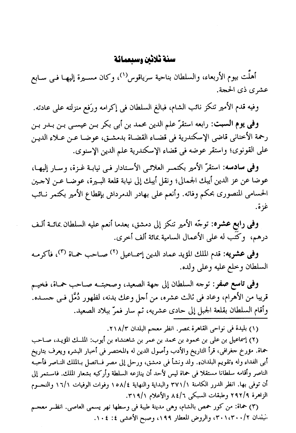 سنة ثَلَاثِينَ وَسَبْعمائة أهلت بِيَوْم الْأَرْبَعَاء وَالسُّلْطَان بِنَاحِيَة سرياقوس وَكَانَ مسيرَة إِلَيْهَا فِي سَابِع عشرى ذِي الْحجَّة. وَفِيه قدم الْأَمِير تنكز نَائِب الشَّام فَبَالغ السُّلْطَان فِي إكرامه وَرفع مَنْزِلَته على عَادَته وَفِي يَوْم السبت: رابعه اسْتَقر علم الدّين مُحَمَّد بن أبي بكر بن عِيسَى بن بدر بن رَحْمَة الأخناني قَاضِي الْإسْكَنْدَريَّة فِي قَضَاء الْقُضَاة بِدِمَشْق عوضا عَن عَلَاء الدّين على القونوي وَاسْتقر عوضه فِي قَضَاء الْإسْكَنْدَريَّة علم الدّين الْإِسْنَوِيّ. وَفِي سادسه: اسْتَقر الْأَمِير بكتمر العلائي الأستادار فِي نِيَابَة غَزَّة وَسَار إِلَيْهَا عوضا عَن عز الدّين أيبك الجمالي وَنقل أيبك إِلَى نِيَابَة قلعة البيرة عوضا عَن لاجين الحسامي المنصوري بِحكم وَفَاته. وأنعم على بهادر الدمرداش بإقطاع الْأَمِير بكتمر نَائِب غَزَّة. وَفِي رَابِع عشره: توجه الْأَمِير تنكز إِلَى دمشق بَعْدَمَا أنعم عَلَيْهِ السُّلْطَان بِمِائَة ألف دِرْهَم وَكتب لَهُ على الْأَعْمَال السامية بِمِائَة ألف أُخْرَى. وَفِي عشريه: قدم الْملك الْمُؤَيد عماد الدّين إِسْمَاعِيل صَاحب حماة فَأكْرمه السُّلْطَان وخلع عَلَيْهِ وعَلى وَلَده. وَفِي تَاسِع صفر: توجه السُّلْطَان إِلَى جِهَة الصَّعِيد وصحبته صَاحب حماة فخيم قَرِيبا من الأهرام وَعَاد فِي ثَالِث عشره من أجل وعك بدنه لظُهُور دمل فِي جسده. وَأقَام السُّلْطَان بقلعة الْجَبَل إِلَى حادي عشريه ثمَّ سَار فَمر بِبِلَاد الصَّعِيد.