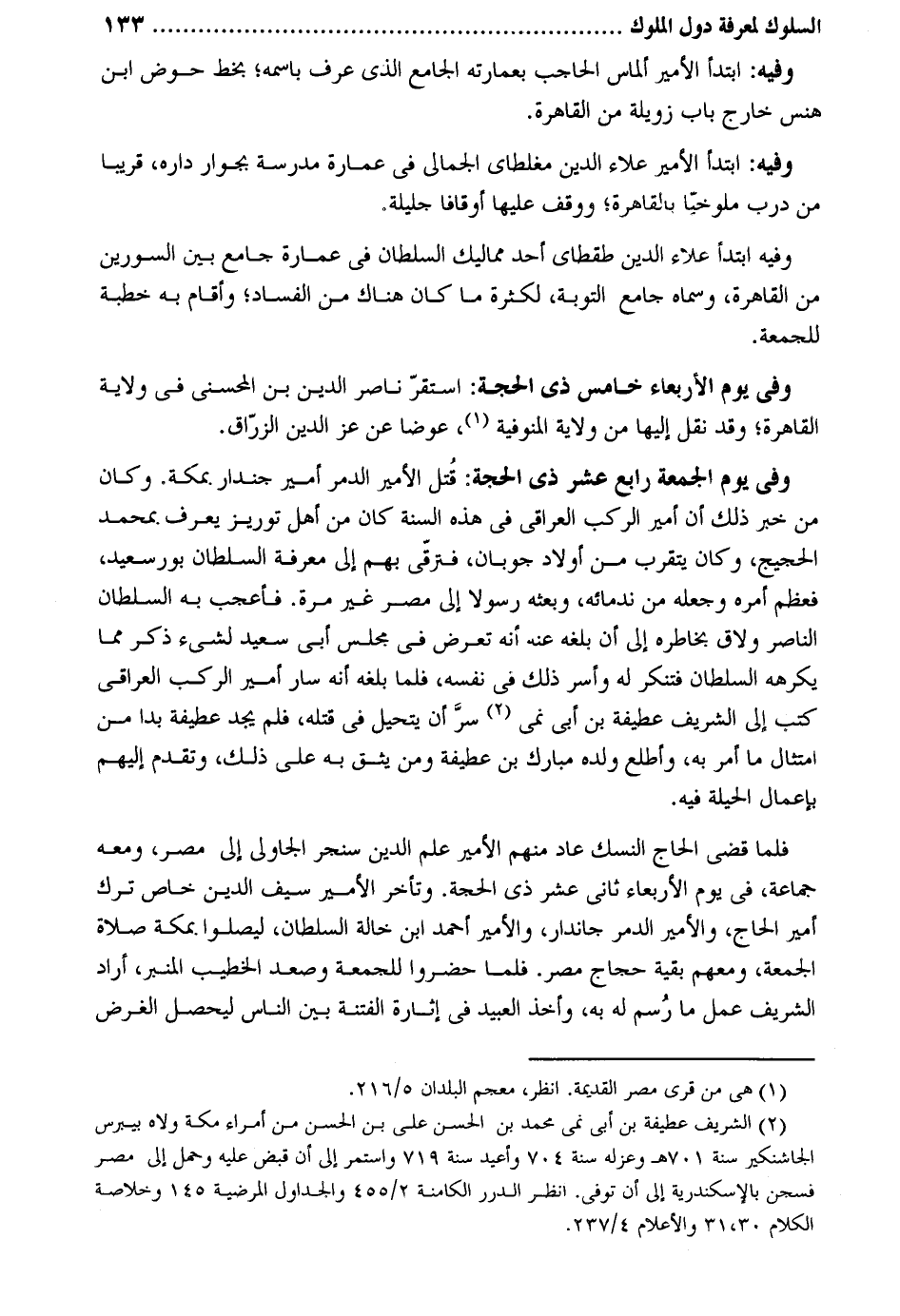وَفِيه: ابْتَدَأَ الْأَمِير ألماس الْحَاجِب بعمارته الْجَامِع الَّذِي عرف باسمه بِخَط حَوْض ابْن هنس خَارج بَاب زويلة من الْقَاهِرَة. وَفِيه: ابْتَدَأَ الْأَمِير عَلَاء الدّين مغلطاي الجمالي فِي عمَارَة مدرسة بجوار دَاره قَرِيبا من درب ملوخيا بِالْقَاهِرَةِ ووقف عَلَيْهَا أوقافاً جليلة. وَفِيه ابتدا عَلَاء الدّين طقطاي أحد مماليك السُّلْطَان فِي عمَارَة جَامع بَين السورين من الْقَاهِرَة وَسَماهُ جَامع التَّوْبَة لِكَثْرَة مَا كَانَ هُنَاكَ من الْفساد وَأقَام بِهِ خطْبَة للْجُمُعَة. وَفِي يَوْم الْأَرْبَعَاء خَامِس ذِي الْحجَّة: اسْتَقر نَاصِر الدّين بن المحسني فِي ولَايَة القاهره وَقد نقل إِلَيْهَا من ولَايَة المنوفية عوضا عَن عز الدّين الزراق. وَفِي يَوْم الْجُمُعَة رَابِع عشر ذِي الْحجَّة قتل الْأَمِير الدمر أَمِير جندار بِمَكَّة وَكَانَ من خبر ذَلِك أَن أَمِير الركب الْعِرَاقِيّ فِي هَذِه السّنة كَانَ من أهل توريز يعرف بِمُحَمد الحجيج وَكَانَ يتَقرَّب من أَوْلَاد جوبان فترقى بهم إِلَى معرفَة السُّلْطَان بورسعيد فَعظم أمره وَجعله من ندمائه وَبَعثه رَسُولا إِلَى مصر غير مرّة. فأعجب بِهِ السُّلْطَان النَّاصِر ولاق بخاطره إِلَى أَن بلغه عَنهُ أَنه تعرض فِي مجْلِس أبي سعيد لشَيْء ذكر مِمَّا يكرههُ السُّلْطَان فتنكر لَهُ وَأسر ذَلِك فِي نَفسه فَلَمَّا بلغه أَنه سَار أَمِير الركب الْعِرَاقِيّ كتب إِلَى الشريف عطفة بن أبي نمى سر ان يتحيل فِي قَتله فَلم يجد عطيفة بدا من امْتِثَال مَا أَمر بِهِ وأطلع وَلَده مبارك بن عطيفة وَمن يَثِق بِهِ على ذَلِك وَتقدم إِلَيْهِم بأعمال الْحِيلَة فِيهِ. فَلَمَّا قضى الْحَاج النّسك عَاد مِنْهُم الْأَمِير علم الدّين سنجر الجاولي إِلَى مصر وَمَعَهُ جمَاعَة فِي يَوْم الْأَرْبَعَاء ثَانِي عشر ذِي الْحجَّة. وَتَأَخر الْأَمِير سيف الدّين خَاص ترك أَمِير الْحَاج والأمير الدمر جاندار والأمير أَحْمد ابْن خَالَة السُّلْطَان ليصلوا بِمَكَّة صَلَاة الْجُمُعَة وَمَعَهُمْ بَقِيَّة حجاج مصر. فَلَمَّا حَضَرُوا للْجُمُعَة وَصعد الْخَطِيب الْمِنْبَر أَرَادَ الشريف عمل مَا رسم لَهُ بِهِ وَأخذ العبيد فِي إثارة الْفِتْنَة بَين النَّاس ليحصل الْغَرَض