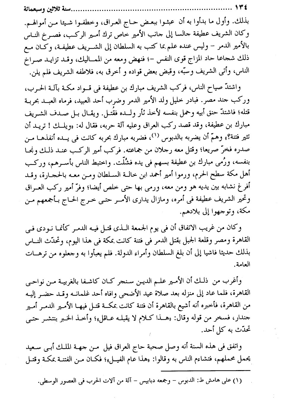 بذلك. وَأول مَا بدأوا بِهِ أَن عبثوا بِبَعْض حَاج الْعرَاق وخطفوا شَيْئا من أَمْوَالهم. وَكَانَ الشريف عطيفة جَالِسا إِلَى جَانب الْأَمِير خَاص ترك أَمِير الركب فَصَرَخَ النَّاس بالأمير ألدمر وَلَيْسَ عِنْده علم بِمَا كتب بِهِ السُّلْطَان إِلَى الشريف عطيفة وَكَانَ مَعَ ذَلِك شجاعاً حاد المزاج قوي النَّفس فَنَهَضَ وَمَعَهُ من المماليك وَقد تزايد صُرَاخ النَّاس وأتى الشريف وسبه وَقبض بعض قواده وأخرق بِهِ فلاطفه الشريف فَلم يلن. وَاشْتَدَّ صياح النَّاس فَركب الشريف مبارك بن عطيفة فِي قواد مَكَّة بِآلَة الْحَرْب وَركب جند مصر. فبادر خَلِيل ولد الْأَمِير ألدمر وَضرب أحد العبيد فَرَمَاهُ العَبْد بِحَرْبَة قَتله فَاشْتَدَّ حنق أَبِيه وَحمل بِنَفسِهِ لأخذ ثأر وَلَده فَقتل. وَيُقَال بل صدف الشريف مبارك بن عطيفة وَقد قصد ركب الْعرَاق وَعَلِيهِ آلَة حربه فَقَالَ لَهُ. وَيلك تُرِيدُ أَن تثير فتْنَة وهم أَن يضْربهُ بالدبوس فَضَربهُ مبارك بِحَرْبَة كَانَت فِي يَده أنفذها من صَدره فَخر صَرِيعًا وَقتل مَعَه رجلَانِ من جماعته. فَركب أَمِير الركب عِنْد ذَلِك وَنَجَا بِنَفسِهِ وَرمي مبارك بن عطيفة بِسَهْم فِي يَده فشلت. واختبط النَّاس بأسرهم وَركب أهل مَكَّة سطح الْحرم ورموا أَمِير أَحْمد ابْن خَالَة السُّلْطَان وَمن مَعَه بِالْحِجَارَةِ وَقد أفرغ نشابه بَين يَدَيْهِ هُوَ وَمن مَعَه وَرمي بهَا حَتَّى خلص أَيْضا وفر أَمِير ركب الْعرَاق وتحير الشريف عطيفة فِي أمره ومازال يُدَارِي الْأَمر حَتَّى خرج الْحَاج بأجمعهم من مَكَّة وتوجهوا إِلَى بِلَادهمْ. وَكَانَ من غَرِيب الِاتِّفَاق أَن فِي يَوْم الْجُمُعَة الَّذِي قتل فِيهِ ألدمر كَأَنَّمَا نُودي فِي الْقَاهِرَة ومصر وقلعة الْجَبَل بقتل ألدمر فِي فتْنَة كَانَت بِمَكَّة فِي هَذَا الْيَوْم وتحدث النَّاس بذلك حَدِيثا فاشياً إِلَى أَن بلغ السُّلْطَان وأمراء الدولة. فَلم يعبأوا بِهِ وجعلوه من ترهات الْعَامَّة. وَأغْرب من ذَلِك أَن الْأَمِير علم الدّين سنجر كَانَ كاشفاً بالغربية من نواحي الْقَاهِرَة فَلَمَّا عَاد منزله بعد صَلَاة عيد الْأَضْحَى وافاه أحد غلمانه وَقد حضر اإيه من الْقَاهِرَة فَأخْبرهُ أَنه أشيع بِالْقَاهِرَةِ أَن فتْنَة كَانَت بِمَكَّة قتل فِيهَا الْأَمِير ألدمر أَمِير جندار فَسخرَ من قَوْله وَقَالَ: هَذَا كَلَام لَا يقبله عَاقل وَأخذ الْخَبَر ينتشي حَتَّى تحدث بِهِ كل أحد. وَاتفقَ فِي هَذِه السّنة أَنه وصل صُحْبَة حَاج الْعرَاق فيل من جِهَة الْملك أبي سعيد يحمل محملهم فتشاءم النَّاس بِهِ وَقَالُوا: هَذَا عَام الْفِيل فَكَانَ من الْفِتْنَة بِمَكَّة وَقتل