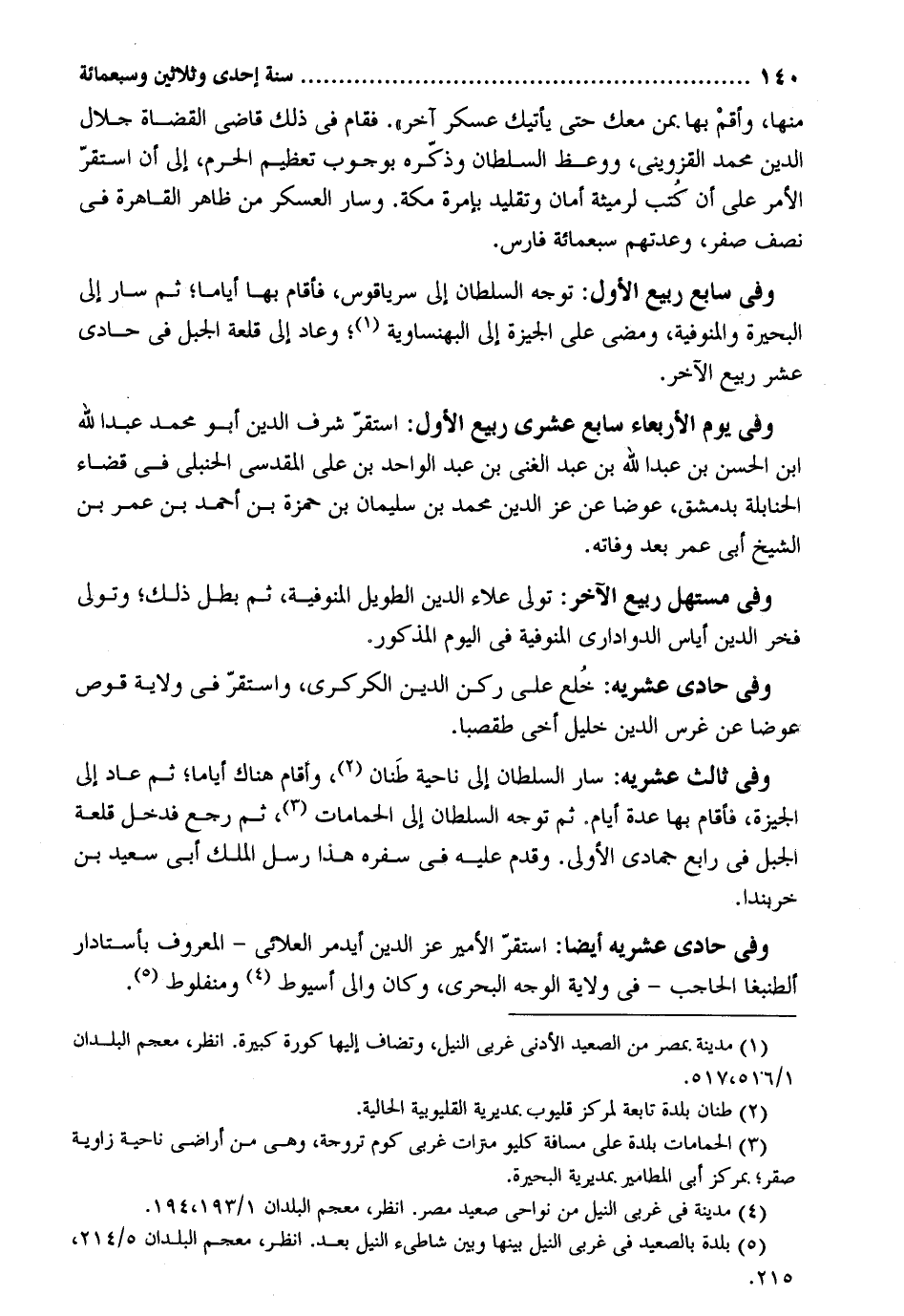 مِنْهَا وأقم بهَا بِمن مَعَك حَتَّى يَأْتِيك عَسْكَر أخر. فَقَامَ فِي ذَلِك قَاضِي الْقُضَاة جلال الدّين مُحَمَّد الْقزْوِينِي وَوعظ السُّلْطَان وَذكره بِوُجُوب تَعْظِيم الْحرم إِلَى أَن اسْتَقر الْأَمر على أَن كتب لرميثة أَمَان وتقليد بإمرة مَكَّة. وَسَار الْعَسْكَر من ظَاهر الْقَاهِرَة فِي نصف صفر وعدتهم سَبْعمِائة فَارس. وَفِي سَابِع ربيع الأول: توجه السُّلْطَان إِلَى سرياقوس فَأَقَامَ بهَا أَيَّامًا ثمَّ سَار إِلَى الْبحيرَة والمنوفية وَمضى على الجيزة إِلَى البهنساوية وَعَاد إِلَى قلعة الْجَبَل فِي حادي عشر ربيع الآخر. وَفِي يَوْم الْأَرْبَعَاء سَابِع عشرى ربيع الأول. اسْتَقر شرف الدّين أَبُو مُحَمَّد عبد الله ابْن الْحسن بن عبد الله بن عبد الْغَنِيّ بن عبد الْوَاحِد بن عَليّ الْمَقْدِسِي الْحَنْبَلِيّ فِي قَضَاء الْحَنَابِلَة بِدِمَشْق وَفِي مستهل ربيع الآخر: تولى عَلَاء الدّين الطَّوِيل المنوفية ثمَّ بَطل ذَلِك وَتَوَلَّى فَخر الدّين أياس الدواداري المنوفية فِي الْيَوْم الْمَذْكُور. وَفِي جُمَادَى عشريه: خلع على ركن الدّين الكركر وَاسْتقر فِي ولَايَة قوص عوضا عَن غرس الدّين خَلِيل أخي طقصبا. وَفِي ثَالِث عشريه: سَار السُّلْطَان إِلَى نَاحيَة طنان وَأقَام هُنَاكَ أَيَّامًا ثمَّ عَاد إِلَى الجيزة فَأَقَامَ بهَا عدَّة أَيَّام. ثمَّ توجه السُّلْطَان إِلَى الحمامات ثمَّ رَجَعَ فَدخل قلعة الْجَبَل فِي رَابِع جُمَادَى الأولى. وَقدم عَلَيْهِ فِي سَفَره هَذَا رسل الْملك أبي سعيد بن خربندا. وَفِي حادي عشريه أَيْضا: اسْتَقر الْأَمِير عز الدّين أيدمر العلائي الْمَعْرُوف بأستادار ألطبغا الْحَاجِب فِي ولَايَة الْوَجْه البحري وَكَانَ وَالِي أسيوط ومنفلوط.