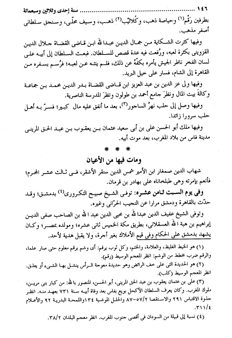 بطرفين رقم وحياصة ذهب وكلاليب ذهب وَسيف محلى وسنحق سلطاني أصفر مَذْهَب. وفيهَا كثرت الشكاية من جمال الدّين عبدا لله ابْن قَاضِي الْقُضَاة جلال الدّين الْقزْوِينِي بِكَثْرَة لعبه وَرفعت فِيهِ عدَّة قصَص للسُّلْطَان. فَبعث السُّلْطَان إِلَى أَبِيه على لِسَان الْفَخر نَاظر الْجَيْش يَأْمُرهُ بكفه عَن ذَلِك فَلم ينْتَه عَن لعبه فرسم بِسَفَرِهِ من الْقَاهِرَة إِلَى الشَّام فَسَار على خيل الْبَرِيد. وفيهَا ولي عز الدّين بن عبد الْعَزِيز ابْن قَاضِي القضاه بدر الدّين مُحَمَّد بن جمَاعَة وكَالَة بَيت المَال وَنظر جَامع أَحْمد بن طولون وَنظر الْمدرسَة الناصرية. وفيهَا وصل إِلَى حلب نهر الساجور بعد مَا أنْفق عَلَيْهِ مَال كَبِير فسر بِهِ أهل حلب سُرُورًا زَائِدا. وفيهَا ملك أَبُو الْحسن عَليّ بن أبي سعيد عُثْمَان بن يَعْقُوب بن عبد الْحق المريني مَدِينَة فاس من بِلَاد الْمغرب بعد موت أَبِيه. وَمَات فِيهَا من الْأَعْيَان شهَاب الدّين صمغار ابْن الْأَمِير شمس الدّين سنقر الْأَشْقَر فِي ثَالِث عشر الْمحرم فأنعم بإمرته وَهِي طبلخاناه على بهادر بن قرمان. وَفِي يَوْم السبت ثامن عشره: توفّي الشَّيْخ صبيح التكروري بِدِمَشْق وَقد حدث بِالْقَاهِرَةِ ودمشق مرَارًا عَن النجيب الْحَرَّانِي وَغَيره. وَتُوفِّي الشَّيْخ عفيف الدّين عبد الله بن محيي الدّين عبد الله بن الصاحب صفي الدّين إِبْرَاهِيم بن هبة الله الْعَسْقَلَانِي بطرِيق مَكَّة الْخَمِيس ثَانِي عشره ومولده بِمصْر وَكَانَ يشْهد بِدِمَشْق على الْحُكَّام وَفِي الْأَمْلَاك بِغَيْر أُجْرَة وَلَا يقبل هَدِيَّة لأحد.