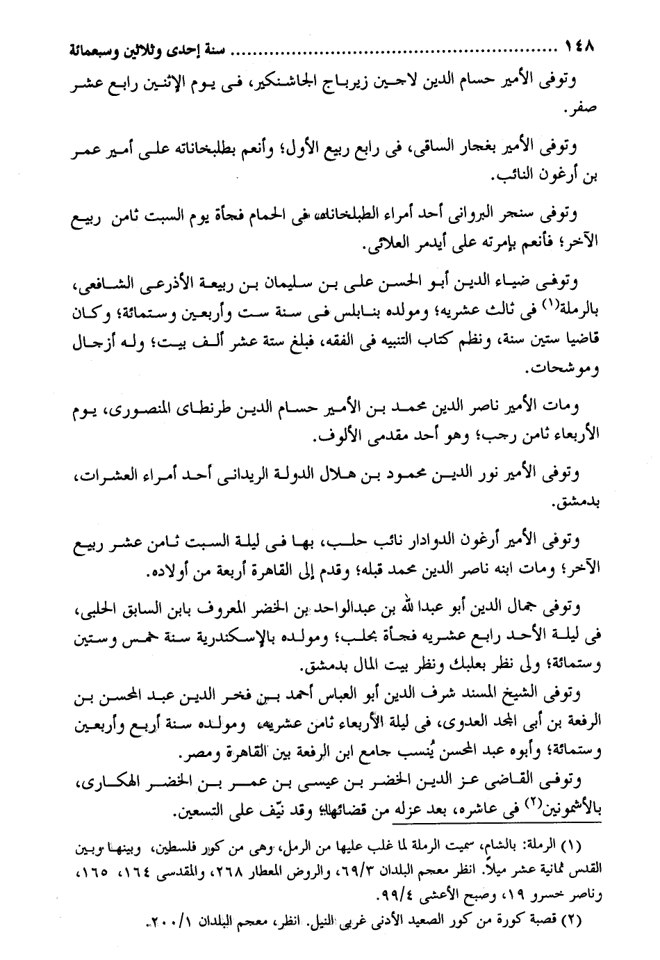 وَتُوفِّي الْأَمِير حسام الدّين لاجين زيرباج الجاشنكير فِي يَوْم الْإِثْنَيْنِ رَابِع عشر صفر. وَتُوفِّي الْأَمِير بغجار الساقي فِي رَابِع ربيع الأول وأنعم بطلبخاناته على أَمِير عمر بن أرغون النَّائِب. وَتُوفِّي سنجر البرواني أحد أُمَرَاء الطبلخاناه فِي الْحمام فَجْأَة يَوْم السبت ثامن ربيع الآخر فأنعم بإمرته على أيدمر العلائي. وَتُوفِّي ضِيَاء الدّين أَبُو الْحسن عَليّ بن سُلَيْمَان بن ربيعَة الْأَذْرَعِيّ الشَّافِعِي بالرملة فِي ثَالِث عشريه ومولده بنابلس فِي سنة سِتّ وَأَرْبَعين وسِتمِائَة وَكَانَ قَاضِيا سِتِّينَ سنة ونظم كثاب التَّنْبِيه فِي الْفِقْه فَبلغ سِتَّة عشر ألف بَيت وَله أزجال ومو شحات. وَمَات الْأَمِير نَاصِر الدّين مُحَمَّد بن الْأَمِير حسام الدّين طرنطاي المنصوري يَوْم الْأَرْبَعَاء ثامن رَجَب وَهُوَ أحد مقدمي الألوف. وَتُوفِّي الآمير نور الدّين مَحْمُود بن هِلَال الدولة الريداني أحد أُمَرَاء العشرات بِدِمَشْق. وَتُوفِّي الْأَمِير أرغون الدوادار نَائِب حلب بهَا فِي لَيْلَة السبت ثامن عشر ربيع الآخر وَمَات ابْنه نَاصِر الدّين مُحَمَّد قبله وَقدم إِلَى الْقَاهِرَة أَرْبَعَة من أَوْلَاده. وَتُوفِّي جمال الدّين أَبُو عبد الله بن عبد الْوَاحِد بن الْخضر الْمَعْرُوف بِابْن السَّابِق الْحلَبِي فِي لَيْلَة الْأَحَد رَابِع عشريه فَجْأَة بحلب ومولده بالإسكندرية سنة خمس وَسِتِّينَ وسِتمِائَة ولي نظر بعلبك وَنظر بَيت المَال بِدِمَشْق. وَتُوفِّي الشَّيْخ الْمسند شرف الدّين أَبُو الْعَبَّاس أَحْمد بن فَخر الدّين عبد المحسن بن الرّفْعَة بن أبي الْمجد الْعَدوي فِي لَيْلَة الْأَرْبَعَاء ثامن عشريه ومولده سنة أَربع وَأَرْبَعين وسِتمِائَة وَأَبوهُ عبد المحسن ينْسب جَامع ابْن الرّفْعَة بَين الْقَاهِرَة ومصر. وَتُوفِّي القَاضِي عز الدّين الْخضر بن عِيسَى بن عمر بن الْخضر الهكاري بالأشمونين فِي عاشره بعد عَزله من قَضَائهَا وَقد نَيف على التسعين.