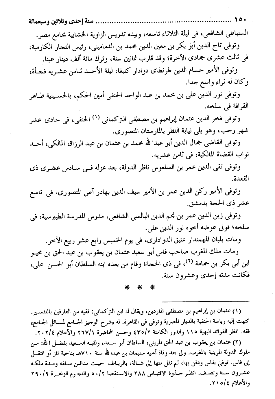السنباطي الشَّافِعِي فِي لَيْلَة الثُّلَاثَاء تاسعه وَبِيَدِهِ تدريس الزاوية الخشابية بجابع مصر. وَتُوفِّي تَاج الدّين أَبُو بكر بن معِين الدّين مُحَمَّد بن الدماميني رَئِيس التُّجَّار الكارمية فِي ثَالِث عشرى جُمَادَى الْآخِرَة وَقد قَارب ثَمَانِينَ سنة وَترك مائَة ألف دِينَار عينا. وَتُوفِّي الْأَمِير حسام الدّين طرنطاي دوادار كتبغا لَيْلَة الْأَحَد ثامن عشريه فَجْأَة وَكَانَ لَهُ ثراء وَاسع جدا. وَتُوفِّي نور الدّين عَليّ بن مُحَمَّد بن عبد الْوَاحِد الْحَنَفِيّ أَمِين الحكم بالحسينية ظَاهر القرافة فِي سلخه. وَتُوفِّي فَخر الدّين عُثْمَان إِبْرَاهِيم بن مصطفى التركماني الْحَنَفِيّ فِي حادي عشر شهر رَجَب وَهُوَ يَلِي نِيَابَة النّظر بالمارستان المنصوري. وَتُوفِّي القَاضِي جمال الدّين أَبُو عبد الله مُحَمَّد بن عُثْمَان بن عبد الرَّزَّاق الْمَالِك أحد نواب الْقُضَاة الْمَالِكِيَّة فِي ثامن عشريه. وَتُوفِّي تَقِيّ الدّين عمر بن السلعوس نَاظر الدولة بعد عَزله فِي سادس عشرى ذِي الْقعدَة. وَتُوفِّي الْأَمِير ركن الدّين عمر بن الْأَمِير سيف الدّين بهادر آص المنصوري فِي تَاسِع عشر ذِي وَتُوفِّي زين الدّين عمر بن نجم الدّين البالسي الشَّافِعِي مدرس الْمدرسَة الطيبرسية فِي سلخه فولي عوضه أَخُوهُ نور الدّين عَليّ. وَمَات بلبان المهمندار عَتيق الدواداري فِي يَوْم الْخَمِيس رَابِع عشر ربيع الآخر. وَمَات ملك الْمغرب صَاحب فاس أَبُو سعيد عُثْمَان بن يَعْقُوب بن عبد الْحق بن محيو ابْن أبي بكر بن حمامة فِي ذِي الْحجَّة وَقَامَ من بعده ابْنه السُّلْطَان أَبُو الْحسن عَليّ فَكَانَت مدَّته إِحْدَى وَعِشْرُونَ سنة.