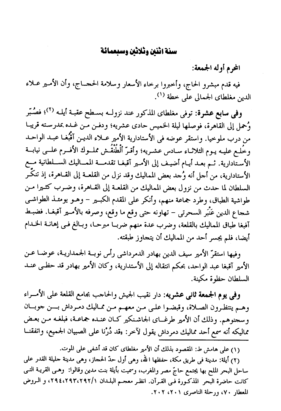 سنة اثْنَيْنِ وَثَلَاثِينَ وَسَبْعمائة الْمحرم أَوله الْجُمُعَة: فِيهِ قدم مبشرو الْحَاج وأخبروا برخاء الأسعار وسلامة الْحجَّاج وَأَن الْأَمِير عَلَاء الدّين مغلطاي الجمالي على خطة. وَفِي سَابِع عشرَة: توفّي مغلطاي الْمَذْكُور عِنْد نُزُوله بسطح عقبَة أيله فَصَبر وَحمل إِلَى الْقَاهِرَة فوصلها لَيْلَة الْخَمِيس حادي عشريه وَدفن من غده بمدرسته قَرِيبا من درب ملوخيا. وَاسْتقر عوضه فِي الأستادارية الْأَمِير عَلَاء الدّين أقبغا عبد الْوَاحِد وخلع عَلَيْهِ يَوْم الثُّلَاثَاء سادس عشريه وَأقر ألطقش مَمْلُوك الأفرم على نِيَابَة الأستادارية. ثمَّ بعد أَيَّام أضيف إِلَى الْأَمِير أقبغا تقدمة المماليك السُّلْطَانِيَّة مَعَ الأستادارية من أجل أَنه وجد بعض المماليك وَقد نزل من القلعة إِلَى الْقَاهِرَة إِذْ تنكر السُّلْطَان لما حدث من نزُول بعض المماليك من القلعة إِلَى الْقَاهِرَة وَضرب كثيرا من طواشية الطاق وطرد جمَاعَة مِنْهُم وَأنكر على الْمُقدم الْكَبِير وَهُوَ يَوْمئِذٍ الطواشي شُجَاع الدّين عنبر السحرتي تهاونه حَتَّى وَقع مَا وَقع وَصَرفه بالأمير أقبغا. فضبط أفبغا طباق المماليك بالقلعة وَضرب عدَّة مِنْهُم ضربا مبرحاً وَبَالغ فِي إهانة الخدام أَيْضا فَلم يَجْسُر أحد من المماليك أَن يتَجَاوَز طبقته. وفيهَا اسْتَقر الْأَمِير سيف الدّين بهادر الدمرداشي رَأس نوبَة الجمدارية عوضا عَن الْأَمِير أقبغا عبد الْوَاحِد بِحكم انْتِقَاله إِلَى الأستدارية وَكَانَ الْأَمِير بهادر قد حظي عِنْد السُّلْطَان حظوة مكينة. وَفِي يَوْم الْجُمُعَة ثَانِي عشريه: دَار نقيب الْجَيْش والحاجب بِجَامِع القلعة على الْأُمَرَاء وهم ينتظرون الصَّلَاة وقبضوا على من مَعَهم من مماليك دمرداش بن جوبان وسجنوهم. وَذَلِكَ أَن الْأَمِير طرغاي الجاشنكير كَانَ عِنْده جمَاعَة فَبَلغهُ من بعض مماليكه أَنه سمع أحد مماليك دمرداش يَقُول لآخر: أقد درنا على الصّبيان الْجَمِيع واتفقنا
