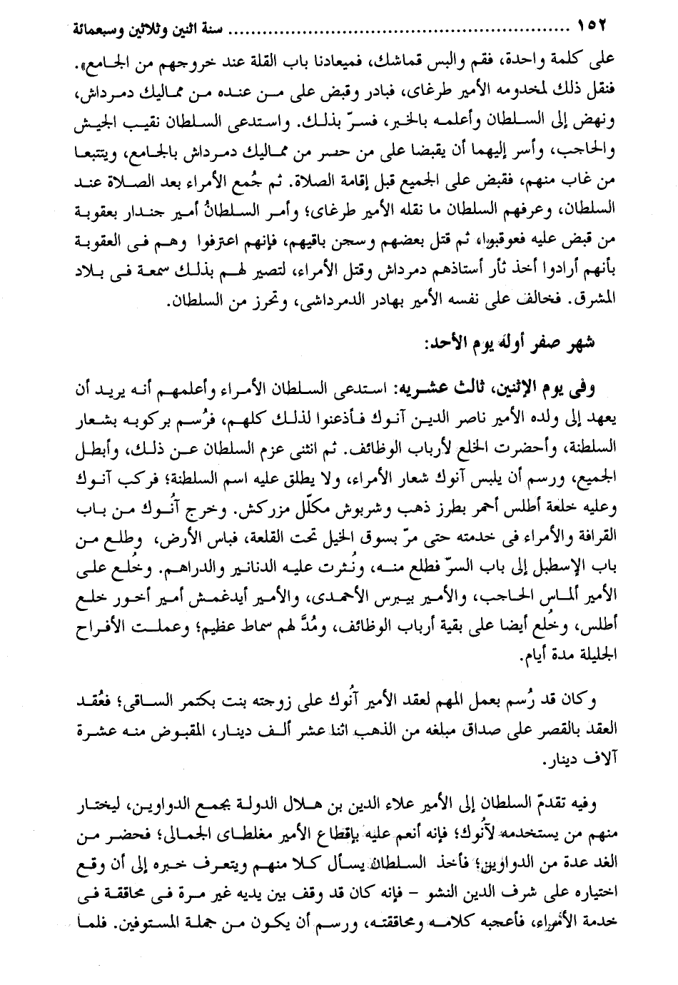 على كلمة وَاحِدَة فَقُمْ والبس قماشك فميعادنا بَاب الْقلَّة عِنْد خُرُوجهمْ من الْجَامِع. فَنقل ذَلِك لمخدومه الْأَمِير طرغاي فبادر وَقبض على من عِنْده من مماليك دمرداش ونهض إِلَى السُّلْطَان وأعلمه بالْخبر فسر بذلك. واستدعى السُّلْطَان نقيب الْجَيْش والحاجب وَأسر إِلَيْهِمَا أَن يقبضا على من حضر من مماليك دمرداش بالجامع ويتتبعا من غَابَ مِنْهُم فَقبض على الْجَمِيع قبل إِقَامَة الصَّلَاة. ثمَّ جمع الْأُمَرَاء بعد الصَّلَاة عِنْد السُّلْطَان وعرفهم السُّلْطَان مَا نَقله الْأَمِير طرغاي وَأمر السُّلْطَان أَمِير جندار بعقوبة من قبص عَلَيْهِ فعوقبوا ثمَّ قتل بَعضهم وسجن باقيهم فَإِنَّهُم اعْتَرَفُوا وهم فِي الْعقُوبَة بِأَنَّهُم أَرَادوا أَخذ ثأر استاذهم دمرداش وَقتل الْأُمَرَاء لتصير لَهُم بذلك سمعة فِي بِلَاد الْمشرق. فَخَالف على نَفسه الْأَمِير بهادر الدمرداش وتحرز من السُّلْطَان. شهر صفر أَوله يَوْم الْأَحَد: وَفِي يَوْم الْإِثْنَيْنِ ثَالِث عشريه: استدعى السُّلْطَان الْأُمَرَاء وأعلمهم أَنه يُرِيد أَن يعْهَد إِلَى وَلَده الإمير نَاصِر الدّين أنوك فأذعنوا لذَلِك كلهم فرسم بركوبه بشعار السلطنة وأحضرت الْخلْع لأرباب الوظالف. ثمَّ انثنى عزم السُّلْطَان عَن ذَلِك وأبطل الْجَمِيع ورسم أَن يلبس آنوك شعار الْأُمَرَاء وَلَا يُطلق عَلَيْهِ اسْم السلطنة فَركب آنوك وَعَلِيهِ خلعة أطلس أَحْمَر بطرز ذهب وشربوش مكلل مزركش. وَخرج آنوك من بَاب القرافة والأمراء فِي خدمته حَتَّى مر بسوق الْخَيل تَحت القلعة فباس الأَرْض وطلع من بَاب الإسطبل إِلَى بَاب السِّرّ فطلع مِنْهُ وَنَثَرت عَلَيْهِ الدَّنَانِير وَالدَّرَاهِم. وخلع على الْأَمِير ألماس الْحَاجِب والأمير بيبرس الأحمد والأمير أيدغمش أَمِير أخور خلع أطلس وخلع أَيْضا على بَقِيَّة أَرْبَاب الْوَظَائِف وَمد لَهُم سماط عَظِيم وعملت الأفراح الجليلة مُدَّة أَيَّام. وَكَانَ قد رسم بِعَمَل المهم لعقد الْأَمِير آنوك على زَوجته بنت بكتمر الساقي فعقد العقد بِالْقصرِ على صدَاق مبلغه من الذَّهَب اثْنَا عشر ألف دِينَار الْمَقْبُوض مِنْهُ عشرَة أُلَّاف دِينَار. وَفِيه تقدم السُّلْطَان إِلَى الْأَمِير عَلَاء الدّين بن هِلَال الدولة بِجمع الدَّوَاوِين ليختار مِنْهُم من يستخدمه لآنوك فَإِنَّهُ أنعم عَلَيْهِ بإقطاع الْأَمِير مغلطاي الجمالي فَحَضَرَ من الْغَد عدَّة من الدَّوَاوِين فَأخذ السُّلْطَان يسْأَل كلا مِنْهُم ويتعرف خَبره إِلَى أَن وَقع اخْتِيَاره على شرف الدّين النشو فَإِنَّهُ كَانَ قد وقف بَين يَدَيْهِ غير مرّة فِي محاققة فِي خدمَة الْأُمَرَاء فأعجبه كَلَامه ومحاققته ورسم أَن يكون من جلة المستوفين. فَلَمَّا