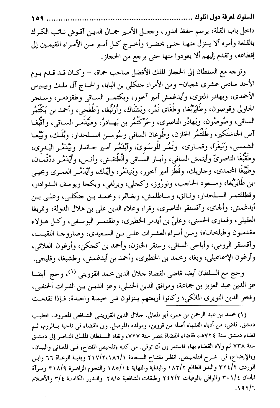 دَاخل بَاب الْقلَّة برسم حفظ الدّور وَجعل الْأَمِير جمال الدّين أقوش نَائِب الكرك بالقلعة وَأمره أَلا ينزل مِنْهَا حَتَّى يحضر وَأخرج كل أَمِير من الْأُمَرَاء المقيمين إِلَى إقطاعه وَتقدم إِلَيْهِم أَلا يعودوا مِنْهَا حَتَّى يرجع من الْحجاز. وَتوجه مَعَ السُّلْطَان إِلَى الْحجاز الْملك الْأَفْضَل صَاحب حماة وَكَانَ قد قدم يَوْم الْأَحَد سادس عشرى شعْبَان وَمن الْأُمَرَاء جنكلي بن البابا والحاج آل ملك وبيبرس الأحمد وبهادر المعزي وأيدغمش أَمِير أخور وبكتمر الساقي وطقزدمر وسنجر الجاولي وقوصون وطايربغا وطغاي تمر وبشتاك وأرنبغا وطغجي وَأحمد بن بكتمر الساقي وصوصون وبهادر النَّاصِر وجركتمر بن بهادر وطيدمر الساقي وأقبغا آص الجاشنكير وطقتمر الخازن وطوغان الساقي وسوسن السلحدار وبلك وبيبغا الشمسي وبيغرا وقماري وتمر الموسوي وأيدمر أَمِير جاندار وبيدمر البدري وطقبغا الناصري وأيتمش الساقي وأياز الساقي وألطقنش وَأنس وأيدمر ددقمان وطبيغا المحمدي وجاريك وقطز أَمِير آخور وبنيدمر وأيبك وأيدمر الْعمريّ ويحيي ابْن طايربغا ومسعود الْحَاجِب ونوروز وكجلي وبرلغي وبكجا ويوسف الدوادار وقطلقتمر السلحدار ونانق وساطلمش وبغاتمر وَمُحَمّد بن جنكل وَعلي بن أيدغمش وألجاي وأقسنقر النَّاصِر وقرا وعلاء الدّين عَليّ بن هِلَال الدولة وتمربغا الْعقيلِيّ وقماري الْحسن وَعلي بن أيدمر الخطيري وطقتمر اليوسفي وكل هَؤُلَاءِ مقدمون وطبلخاناه وَمن أُمَرَاء العشرات عَليّ بن السعيد وصاروجا النَّقِيب وآقسنقر الرُّومِي وأياجي الساقي وسنقر الخازن وَأحمد بن كجكن وأرغون العلائي وأرغون الْإِسْمَاعِيلِيّ وبغا وَمُحَمّد بن الخطير وَأحمد بن أيدغمش وطشبغا وقليجي. وَحج مَعَ السُّلْطَان أَيْضا قَاضِي الْقُضَاة جلال الدّين مُحَمَّد الْقزْوِينِي وَحج أَيْضا عز الدّين عبد الْعَزِيز بن جمَاعَة وموافق الدّين الْحَنْبَلِيّ وَعز الدّين بن الْفُرَات الْحَنَفِيّ وفخر الدّين النويري الْمَالِكِي وَكَانُوا أربعتهم ينزلون فِي خيمة وَاحِدَة فَإِذا تقدّمت