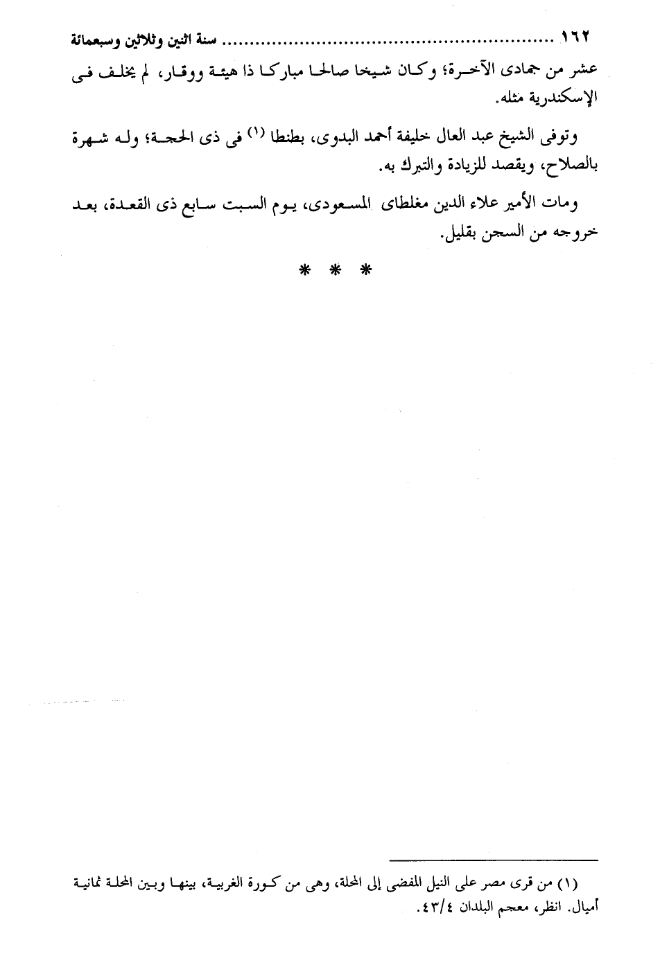 عشر من جُمَادَى الْآخِرَة وَكَانَ شَيخا صَالحا مُبَارَكًا ذَا هَيْئَة ووقار لم يخلف فِي الْإسْكَنْدَريَّة مثله. وَتُوفِّي الشَّيْخ عبد العال خَليفَة أَحْمد البدوي بطنطا فِي ذِي الْحجَّة وَله شهرة بالصلاح ويقصد للزِّيَادَة والتبرك بِهِ. وَمَات الْأَمِير عَلَاء الدّين مغلطاي المَسْعُودِيّ يَوْم السبت سَابِع ذِي الْقعدَة بعد خُرُوجه من السجْن بِقَلِيل.