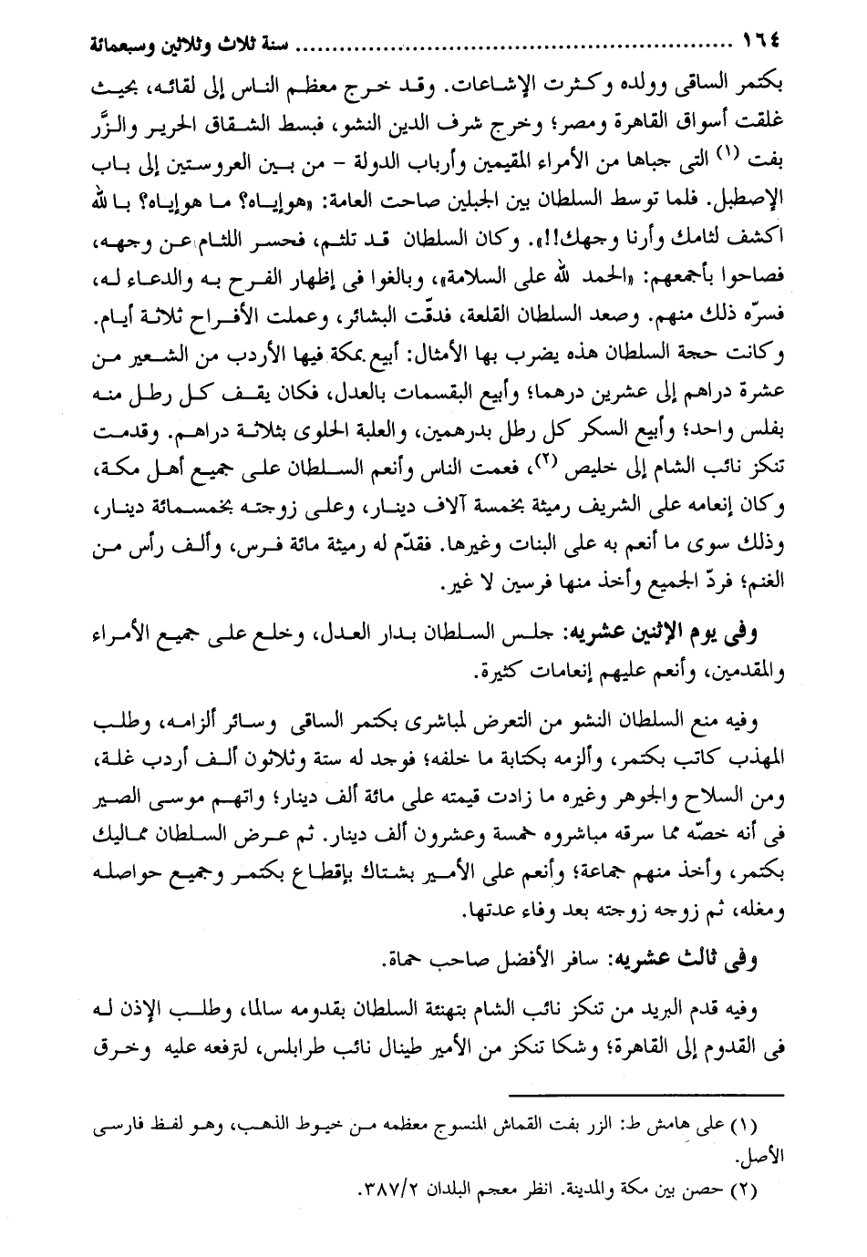 بكتمر الساقي وَولده وَكَثُرت الإشاعات. وَقد خرج مُعظم النَّاس فِي لِقَائِه بِحَيْثُ غلقت أسواق الْقَاهِرَة ومصر وَخرج شرف الدّين النشو فَبسط الشقاق الْحَرِير والزر بفت الَّتِي جباها من الْأُمَرَاء المقيمين وأرباب الدولة من بَين العروستين إِلَى بَاب الإصطبل. فَلَمَّا توَسط السُّلْطَان بَين الجبلين صاحت الْعَامَّة: هوإياه مَا هوإياه بِاللَّه اكشف لثامك وأرنا وَجهك. وَكَانَ السُّلْطَان قد تلثم فحسر اللثام عَن وَجهه فصاحوا بأجمعهم: الْحَمد لله على السَّلامَة وبالغوا فِي إِظْهَار الْفرج بِهِ وَالدُّعَاء لَهُ فسره ذَلِك مِنْهُم. وَصعد السُّلْطَان القلعة فدقت البشائر وعملت الأفراح ثَلَاثَة أَيَّام. وَكَانَت حجَّة السُّلْطَان هَذِه يضْرب بهَا الْأَمْثَال: أبيع بِمَكَّة فِيهَا الأردب من الشّعير من عشرَة دَرَاهِم إِلَى عشْرين درهما وأبيع البقسمات بِالْعَدْلِ فَكَانَ يقف كل رَطْل مِنْهُ بفلس وَاحِد وأبيع السكر كل رَطْل بِدِرْهَمَيْنِ والعلبة الْحَلْوَى بِثَلَاثَة دَرَاهِم. وقدمت تنكز نَائِب الشَّام افي خليص فعمت النَّاس وأنعم السُّلْطَان على جَمِيع أهل مَكَّة وَكَانَ إنعامه على الشريف رميثة بِخَمْسَة أُلَّاف دِينَار وعَلى زَوجته بِخَمْسِمِائَة دِينَار وَذَلِكَ سوى مَا أنعم بِهِ على الْبَنَات وَغَيرهَا. فَقدم لَهُ رميثة مائَة فرس وَألف رَأس من الْغنم فَرد الْجَمِيع وَأخذ مِنْهَا فرسين لَا غير. وَفِي يَوْم الْإِثْنَيْنِ عشريه: جلس السُّلْطَان بدار الْعدْل وخلع على جَمِيع الْأُمَرَاء والمقدمين وأنعم عَلَيْهِم إنعامات كَثِيرَة. وَفِيه منع السُّلْطَان النشو من التَّعَرُّض لمباشري بكتمر الساقي وَسَائِر ألزامه وَطلب الْمُهَذّب كَاتب بكتمر وألزمه بِكِتَابَة مَا خَلفه فَوجدَ لَهُ سِتَّة وَثَلَاثُونَ ألف أردب غلَّة وَمن السِّلَاح والجوهر وَغَيره مَا زَادَت قِيمَته على مائَة ألف دِينَار واتهم مُوسَى الصير فِي أَنه خصّه مِمَّا سَرقه مباشروه خَمْسَة وَعِشْرُونَ ألف دِينَار. ثمَّ عرض السُّلْطَان مماليك بكتمر وأخذلهم جمَاعَة وأنعم على الْأَمِير بشتاك بإقطاع بكتمر وَجَمِيع حواصله ومغله ثمَّ زوجه زَوجته بعد وَفَاء عدتهَا. وَفِي ثَالِث عشريه: سَافر الْأَفْضَل صَاحب حماة. وَفِيه قدم الْبَرِيد من تنكز نَائِب الشَّام بتهنئة السُّلْطَان بقدومه سالما وَطلب الْإِذْن لَهُ فِي الْقدوم إِلَى الْقَاهِرَة وشكا تنكز من الْأَمِير طينال نَائِب طرابلس لترفعه عَلَيْهِ وخرق