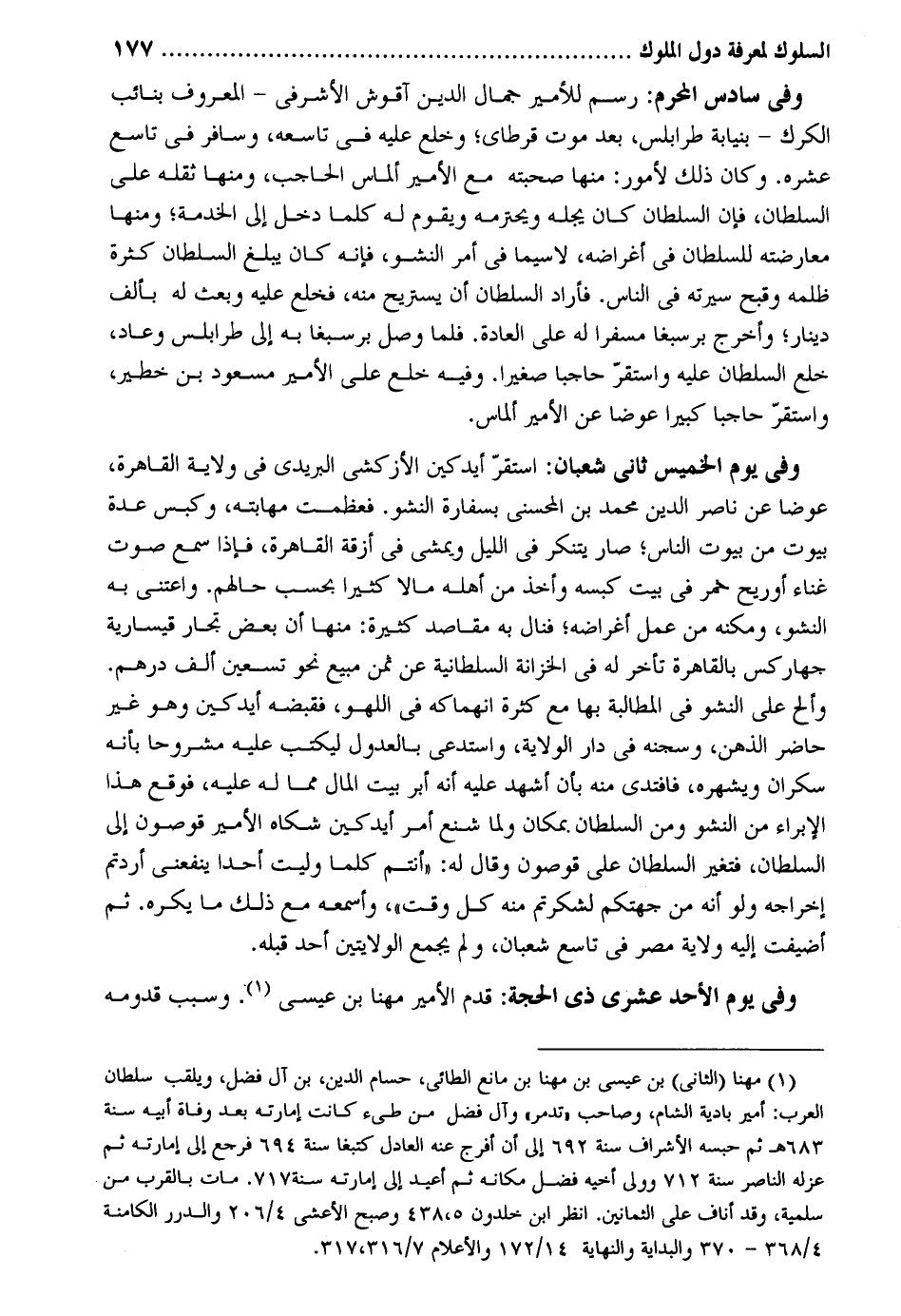 وَفِي سادس الْمحرم: رسم للأمير جمال الدّين آقوش الأشرفي الْمَعْرُوف بنائب الكرك بنيابة طرابلس بعد موت قرطاي وخلع عَلَيْهِ فِي تاسعه وسافر فِي تَاسِع عشره. وَكَانَ ذَلِك لأمور: مِنْهَا صحبته مَعَ الْأَمِير ألماس الْحَاجِب وَمِنْهَا ثقله على السُّلْطَان فَإِن السُّلْطَان كَانَ يجله ويحترمه وَيقوم لَهُ كلما دخل إِلَى الْخدمَة وَمِنْهَا معارضته للسُّلْطَان فِي أغراضه لاسيما فِي أَمر النشو فَإِنَّهُ كَانَ يبلغ السُّلْطَان كَثْرَة ظلمه وقبح سيرته فِي النَّاس. فَأَرَادَ السُّلْطَان أَن يستريح مِنْهُ فَخلع عَلَيْهِ وَبعث لَهُ بِأَلف دِينَار وَأخرج برسبغا مُسْفِرًا لَهُ على الْعَادة. فَلَمَّا وصل برسبغا بِهِ إِلَى طرابلس وَعَاد خلع السُّلْطَان عَلَيْهِ وَاسْتقر حاجباً صَغِيرا. وَفِيه خلع على الْأَمِير مَسْعُود بن خطير وَاسْتقر حاجباً كَبِيرا عوضا عَن الْأَمِير ألماس. وَفِي يَوْم الْخَمِيس ثَانِي شعْبَان: اسْتَقر أيدكين الأزكشي البريدي فِي ولَايَة الْقَاهِرَة عوضا عَن نَاصِر الدّين مُحَمَّد بن المحسني بسفارة النشو. فعظمت مهابته وكبس عدَّة بيُوت من بيُوت النَّاس صَار يتنكر فِي اللَّيْل وَيَمْشي فِي أَزِقَّة الْقَاهِرَة فَإِذا سمع صَوت غناء أَو ريح خمر فِي بَيت كبسه وَأخذ من أَهله مَالا كثيرا بِحَسب حَالهم. واعتنى بِهِ النشو ومكنه من عمل أغراضه فنال بِهِ مَقَاصِد كَثِيرَة. مِنْهَا أَن بعض تجار قيسارية جهاركس بِالْقَاهِرَةِ تَأَخّر لَهُ فِي الخزانة السُّلْطَانِيَّة عَن ثمن مَبِيع نَحْو تسعين ألف دِرْهَم. وألح على النشو فِي الْمُطَالبَة بهَا مَعَ كَثْرَة انهماكه فِي اللَّهْو فَقَبضهُ أيدكين وَهُوَ غير حَاضر الذِّهْن وسجنه فِي دَار الْولَايَة واستدعى بالعدول ليكتب عَلَيْهِ مشروحاً بِأَنَّهُ سَكرَان ويشهره فَافْتدى مِنْهُ بِأَن أشهد عَلَيْهِ أَنه أبر بَيت المَال مِمَّا لَهُ عَلَيْهِ موقع هَذَا الْإِبْرَاء من النشو وَمن السُّلْطَان بمَكَان وَلما شنع أَمر أيدكين شكاه الْأَمِير قوصون إِلَى السُّلْطَان فَتغير السُّلْطَان على قوصون وَقَالَ لَهُ: أَنْتُم كلما وليت أحدا يَنْفَعنِي أردتم إِخْرَاجه وَلَو أَنه من جهتكم لشكرتم مِنْهُ كل وَقت وأسمعه مَعَ ذَلِك مَا يكره. ثمَّ أضيفت إِلَيْهِ ولَايَة مصر وَفِي يَوْم الْأَحَد عشرى ذِي الْحجَّة: قدم الْأَمِير مهنا بن عِيسَى وَسبب قدومه