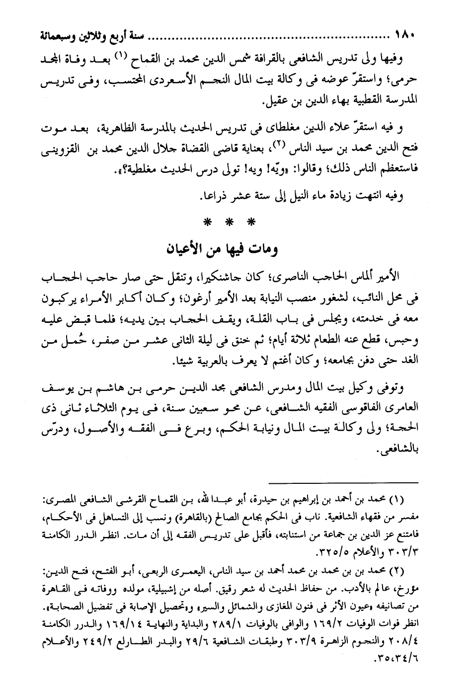 وفيهَا ولى تدريس الشَّافِعِي بالقرافة شمس الدّين مُحَمَّد بن القماح بعد وَفَاة الْمجد حرمي وَاسْتقر عوضه فِي وكَالَة بَيت المَال النَّجْم الأسعردي الْمُحْتَسب وَفِي تدريس الْمدرسَة القطبية بهاء الدّين بن عقيل. وَفِيه اسْتَقر عَلَاء الدّين مغلطاي فِي تدريس الحَدِيث بِالْمَدْرَسَةِ الظَّاهِرِيَّة بعد موت فتح الدّين مُحَمَّد بن سيد النَّاس بعناية قَاضِي الْقُضَاة جلال الدّين مُحَمَّد بن الْقزْوِينِي فاستعظم النَّاس ذَلِك وَفِيه انْتَهَت زِيَادَة مَاء النّيل إِلَى سِتَّة عشر ذِرَاعا. وَمَات فِيهَا من الْأَعْيَان الْأَمِير ألماس الْحَاجِب الناصري كَانَ جاشنكيرا وتنقل حَتَّى صَار حَاجِب الْحجاب فِي مَحل النَّائِب لشغور منصب النِّيَابَة بعد الْأَمِير أرغون وَكَانَ أكَابِر الْأُمَرَاء يركبون مَعَه فِي خدمته وَيجْلس فِي بَاب الْقلَّة وَيقف الْحجاب بَين يَدَيْهِ فَلَمَّا قبض عَلَيْهِ وَحبس قطع عَنهُ الطَّعَام ثَلَاثَة أَيَّام ثمَّ خنق فِي لَيْلَة الثَّانِي عشر من صفر حمل من الْغَد حَتَّى دفن بجامعه وَكَانَ أغتم لَا يعرف بِالْعَرَبِيَّةِ شَيْئا. وَتُوفِّي وَكيل بَيت المَال ومدرس الشَّافِعِي مجد الدّين حرمي بن هَاشم بن يُوسُف العامري الفاقوسي الْفَقِيه الشَّافِعِي عَن محو سبعين سنة فِي يَوْم الثُّلَاثَاء ثَانِي ذِي الْحجَّة ولي وكَالَة بَيت المَال ونيابة الحكم وبرع فِي الْفِقْه وَالْأُصُول ودرس بالشافعي.
