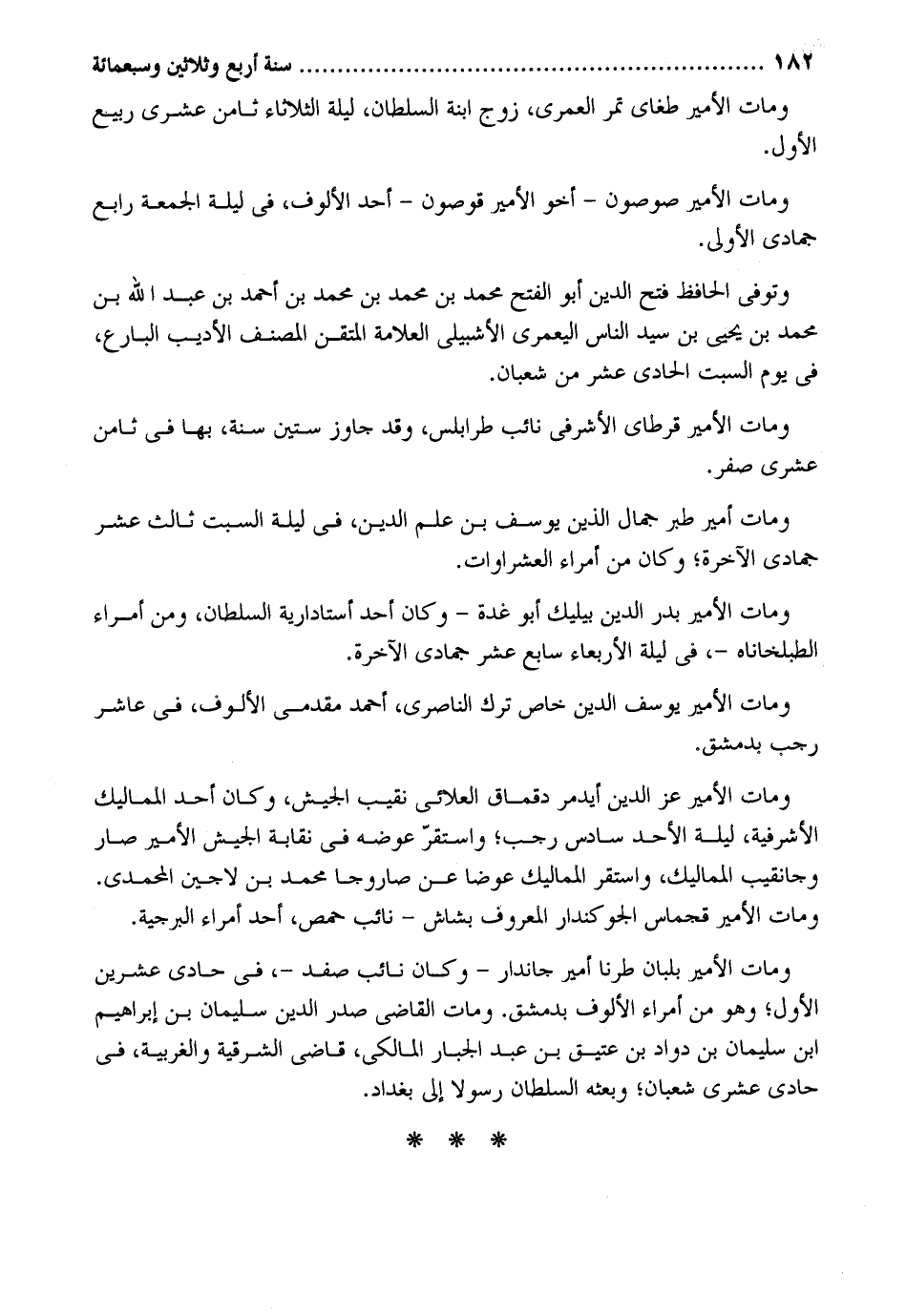 وَمَات الْأَمِير طغاي تمر الْعمريّ زوج ابْنة السُّلْطَان لَيْلَة الثُّلَاثَاء ثامن عشرى ربيع الأول. وَمَات الْأَمِير صوصون أَخُو الْأَمِير قوصون أحد الألوف فِي لَيْلَة الْجُمُعَة رَابِع جُمَادَى الأولى. وَتُوفِّي الْحَافِظ فتح الدّين أَبُو الْفَتْح مُحَمَّد بن مُحَمَّد بن مُحَمَّد بن أَحْمد بن عبد الله بن مُحَمَّد بن يحيى بن سيد النَّاس الْيَعْمرِي الأشبيلي الْعَلامَة المتقن المُصَنّف الأديب البارع فِي يَوْم السبت الْحَادِي عشر من شعْبَان. وَمَات الْأَمِير قرطاي الأشرفي نَائِب طرابلس وَقد جَاوز سِتِّينَ سنة بهَا فِي ثامن عشرى صفر. وَمَات أَمِير طبر جمال الَّذين يُوسُف بن علم الدّين فِي لَيْلَة السبت ثَالِث عشر جُمَادَى الْآخِرَة وَكَانَ من أُمَرَاء العشراوات. وَمَات الْأَمِير بدر الدّين بيليك أَبُو غُدَّة وَكَانَ أحد أستادارية السُّلْطَان وَمن أُمَرَاء الطبلخاناه وَمَات الْأَمِير يُوسُف الدّين خَاص ترك الناصري أَحْمد مقدمي الألوف فِي عَاشر وَجب بِدِمَشْق. وَمَات الْأَمِير عز الدّين أيدمر دقماق العلائي نقيب الْجَيْش وَكَانَ أحد المماليك الأشرفية لَيْلَة الْأَحَد سادس رَجَب وَاسْتقر عوضه فِي نقابة الْجَيْش الْأَمِير صَار وجانقيب المماليك وَاسْتقر المماليك عوضا عَن صاروجا مُحَمَّد بن لاجين المحمدي. وَمَات الْأَمِير قجماس الجوكندار الْمَعْرُوف بشاش نَائِب حمص أحد أُمَرَاء البرجية. وَمَات الْأَمِير بلبان طرنا أَمِير جاندار وَكَانَ نَائِب صفد فِي حادي عشْرين الأول وَهُوَ من أُمَرَاء الألوف بِدِمَشْق. وَمَات القَاضِي صدر الدّين سُلَيْمَان بن إِبْرَاهِيم ابْن سُلَيْمَان بن دواد بن عَتيق بن عبد الْجَبَّار الْمَالِك قَاضِي الشرقية والغربية فِي حادي عشرى شعْبَان وَبَعثه السُّلْطَان رَسُولا إِلَى بَغْدَاد.