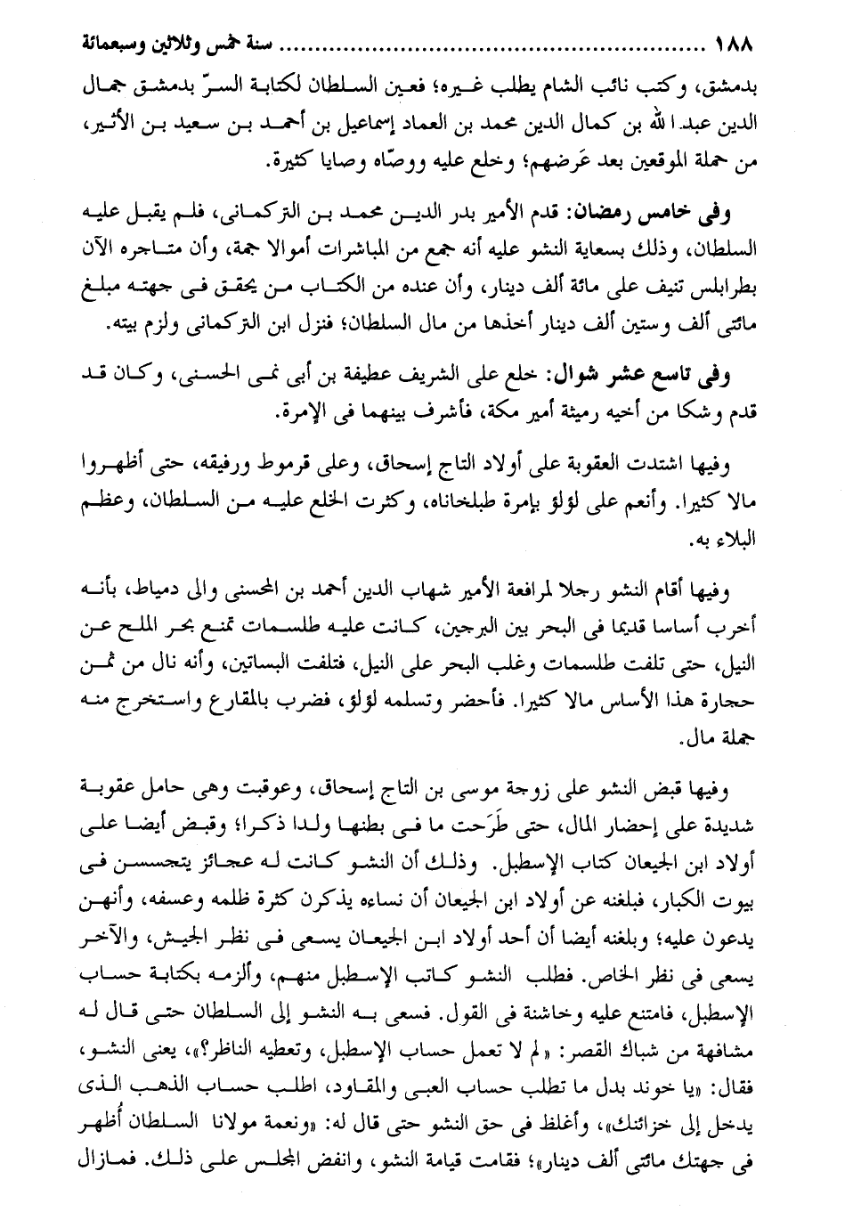 قدم الْأَمِير بدر الدّين مُحَمَّد بن التركماني فَلم يقبل عَلَيْهِ السُّلْطَان وَذَلِكَ بسعاية النشو عَلَيْهِ أَنه جمع من المباشرات أَمْوَالًا جمة وَأَن متاجره الْآن بطرابلس تنيف على مائَة ألف دِينَار وَأَن عِنْده من الْكتاب من يُحَقّق فِي جِهَته مبلغ مِائَتي ألف وَسِتِّينَ ألف دِينَار أَخذهَا من مَال السُّلْطَان فَنزل ابْن التركماني وَلزِمَ بَيته. وَفِي تَاسِع عشر شَوَّال. خلع عَليّ بالشريف عطيفة بن أبي نمي الحسني وَكَانَ قد قدم وشكا من أَخِيه رميثة أَمِير مَكَّة فَأَشْرَف بَينهمَا فِي الإمرة. وفيهَا اشتدت الْعقُوبَة على أَوْلَاد التَّاج إِسْحَاق وعَلى قرموط ورفيقه حَتَّى أظهرُوا مَالا كثيرا. وأنعم على لُؤْلُؤ بإمرة طبلخاناه وَكَثُرت الْخلْع عَلَيْهِ من السُّلْطَان وَعظم الْبلَاء بِهِ. وفيهَا أَقَامَ النشو رجلا لمرافعة الْأَمِير شهَاب الدّين أَحْمد بن المحسني وَالِي دمياط بِأَنَّهُ أخرب أساساً قَدِيما فِي الْبَحْر بَين البرجين كَانَت عَلَيْهِ طلسمات تمنع بَحر الْملح عَن النّيل حَتَّى تلفت طلسمات وَغلب الْبَحْر على النّيل فَتلفت الْبَسَاتِين وَأَنه نَالَ من ثمن حِجَارَة هَذَا الأساس مَالا وفيهَا قبض النشو على زَوْجَة مُوسَى بن التَّاج إِسْحَاق وعوقبت وَهِي حَامِل عُقُوبَة شَدِيدَة على إِحْضَار المَال حَتَّى طرحت مَا فِي بَطنهَا ولدا ذكرا وَقبض أَيْضا على أَوْلَاد ابْن الجيعان كتاب الإسطبل. وَذَلِكَ أَن النشو كَانَت لَهُ عَجَائِز يتجسسن فِي بيُوت الْكِبَار فبلغنه عَن أَوْلَاد ابْن الجيعان أَن نِسَاءَهُ يذكرن كَثْرَة ظلمه وعسفه وأنهن يدعونَ عَلَيْهِ وبلغنه أَيْضا أَن أحد أَوْلَاد ابْن الجيعان يسْعَى فِي نظر الْجَيْش وَالْآخر يسْعَى فِي نظر الْخَاص. فَطلب النشو كَاتب الإسطبل مِنْهُم وألزمه بِكِتَابَة حِسَاب الإسطبل فَامْتنعَ عَلَيْهِ وخاشنة فِي القَوْل. فسعى بِهِ النشو إِلَى السُّلْطَان حَتَّى قَالَ لَهُ مشافهة من شباك الْقصر: لم لَا تعْمل حِسَاب الإسطل وتعطيه النَّاظر يَعْنِي النشو فَقَالَ: يَا خوند بدل مَا تطلب حِسَاب العبي والمقاود اطلب حِسَاب الذَّهَب الَّذِي يدْخل فِي خزائنك وَأَغْلظ فِي حق النشو حَتَّى قَالَ لَهُ: ونعمة مَوْلَانَا السُّلْطَان أظهر فِي جهتك مِائَتي ألف دِينَار فَقَامَتْ قِيَامَة النشو وانفض الْمجْلس على ذَلِك. فمازال