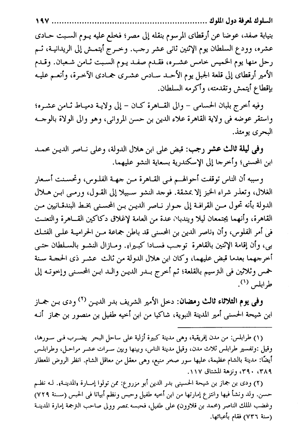 بنيابة صفد عوضا عَن أرقطاي المرسوم بنقله إِلَى مصر فَخلع عَلَيْهِ يَوْم السبت حادي عشره وودع السُّلْطَان يَوْم الْإِثْنَيْنِ ثَانِي عشر رَجَب. وَخرج أيتمش إِلَى الريدانية ثمَّ رَحل مِنْهَا يَوْم الْخَمِيس خَامِس عشره فَقدم صفد يَوْم السبت ثامن شعْبَان. وَقدم الْأَمِير أرقطاي إِلَى قلعة الْجَبَل يَوْم الْأَحَد سادس عشرى جُمَادَى الْآخِرَة وأنعم عَلَيْهِ بإقطاع أيتمش وتقدمته وأكرمه السُّلْطَان. وَفِيه أخرج بلبان الحسامي وَالِي الْقَاهِرَة كَانَ - إِلَى ولَايَة دمياط ثامن عشره وَاسْتقر عوضه فِي ولَايَة الْقَاهِرَة عَلَاء الدّين بن حسن المرواني وَهُوَ وَالِي الْوُلَاة بِالْوَجْهِ البحري يَوْمئِذٍ. وَفِي لَيْلَة ثَالِث عشر رَجَب: قبض على ابْن هِلَال الدولة وعَلى نَاصِر الدّين مُحَمَّد ابْن المحسن وَأَخْرَجَا إِلَى الْإسْكَنْدَريَّة بسعاية النشو عَلَيْهِمَا. وَسَببه أَن النَّاس توقفت أَحْوَالهم فِي الْقَاهِرَة من جِهَة الْفُلُوس وتحسنت أسعار الغلال وَتعذر شِرَاء الْخبز إِلَّا بِمَشَقَّة. فَوجدَ النشو سَبِيلا إِلَى القَوْل وَرمي ابْن هِلَال الدولة بِأَنَّهُ تحول من القرافة إِلَى جوَار نَاصِر الدّين بن المحسني بِخَط البندقانيين من الْقَاهِرَة وأنهما يَجْتَمِعَانِ لَيْلًا ويندبان عدَّة من الْعَامَّة لإغلاق دكاكين الْقَاهِرَة والتعنت فِي أَمر الْفُلُوس وَأَن نَاصِر الدّين بن المحسني قد بَاطِن جمَاعَة من الحرامية على الفتك بِي وَأَن إِقَامَة الْإِثْنَيْنِ بِالْقَاهِرَةِ توجب فَسَادًا كَبِيرا. ومازال النشو بالسلطان حَتَّى إخرجهما بَعْدَمَا قبض عَلَيْهِمَا وَكَانَ ابْن هِلَال الدولة من ثَالِث عشر ذِي الْحجَّة سنة خمس وَثَلَاثِينَ فِي الترسيم بالقلعة ثمَّ أخرج بدر الدّين وَالِد ابْن المحسني وَإِخْوَته إِلَى طرابلس. وَفِي يَوْم الثُّلَاثَاء ثَالِث رَمَضَان: دخل الْأَمِير الشريف بدر الدّين ودي بن جماز ابْن شيحة الحسني أَمِير الْمَدِينَة النَّبَوِيَّة شاكياً من ابْن أَخِيه طفيل بن مَنْصُور بن جماز أَنه