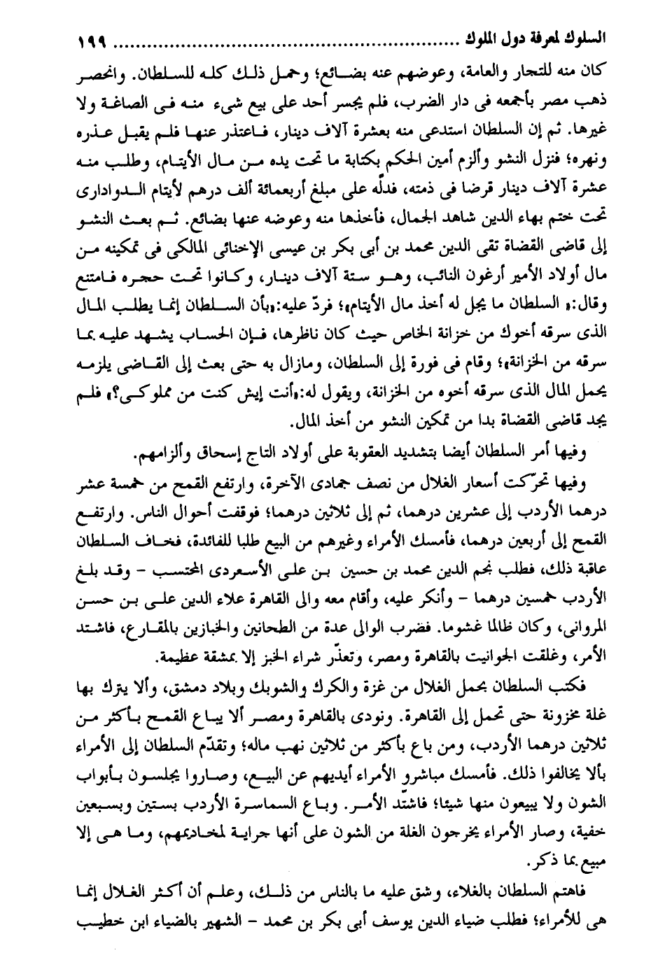 كَانَ مِنْهُ للتجار والعامه وعوضهم عَنهُ بضائع وَحمل ذَلِك كُله للسُّلْطَان. وانحصر ذهب مصر بأجمعه فِي دَار الضَّرْب فَلم يَجْسُر أحد على بيع شَيْء مِنْهُ فِي الصاغة وَلَا غَيرهَا. ثمَّ إِن السُّلْطَان استدعى مِنْهُ بِعشْرَة أُلَّاف دِينَار فَاعْتَذر عَنْهَا فَلم يقبل عذره ونهره فَنزل النشو وألزم أَمِين الحكم بِكِتَابَة مَا تَحت يَده من مَال الْأَيْتَام وَطلب مِنْهُ عشرَة أُلَّاف دِينَار قرضا فِي ذمَّته فدله على مبلغ أَرْبَعمِائَة ألف دِرْهَم لأيتام الدواداري تَحت ختم بهاء الدّين شَاهد الْجمال فَأَخذهَا مِنْهُ وعوضه عَنْهَا بضائع. ثمَّ بعث النشو إِلَى قَاضِي الْقُضَاة تَقِيّ الدّين مُحَمَّد بن أبي بكر بن عِيسَى الإخنائي الْمَالِكِي فِي تَمْكِينه من مَال أَوْلَاد الْأَمِير أرغون النَّائِب وَهُوَ سِتَّة أُلَّاف دِينَار وَكَانُوا تَحت حجره فَامْتنعَ وَقَالَ: السُّلْطَان مَا يجل لَهُ أَخذ مَال الْأَيْتَام فَرد عَلَيْهِ: بِأَن السُّلْطَان إِنَّمَا يطْلب المَال الَّذِي سَرقه أَخُوك من خزانَة الْخَاص حَيْثُ كَانَ ناظرها فَإِن الْحساب يشْهد عَليّ بِمَا سَرقه من الخزانة وَقَامَ فِي فورة إِلَى السُّلْطَان ومازال بِهِ حَتَّى بعث إِلَى القَاضِي يلْزمه يحمل المَال الَّذِي سَرقه أَخُوهُ من الخزانة وَيَقُول لَهُ: أَنْت إيش كنت من مملوكي فَلم يجد قَاضِي الْقُضَاة بدا من تَمْكِين النشو من أَخذ المَال. وفيهَا أَمر السُّلْطَان أَيْضا بتَشْديد الْعقُوبَة على أَوْلَاد التَّاج إِسْحَاق وألزامهم. وفيهَا تحركت أسعار الغلال من نصف جُمَادَى الْآخِرَة وارتفع الْقَمْح من خَمْسَة عشر درهما الأردب إِلَى عشْرين درهما ثمَّ إِلَى ثَلَاثِينَ درهما فوقفت أَحْوَال النَّاس. وارتفع الْقَمْح إِلَى أَرْبَعِينَ درهما فَأمْسك الْأُمَرَاء وَغَيرهم من البيع طلبا للفائدة فخاف السُّلْطَان عَاقِبَة ذَلِك فَطلب نجم الدّين مُحَمَّد بن حُسَيْن بن على الأسعردي الْمُحْتَسب وَقد بلغ الأردب خمسين درهما وَأنكر عَلَيْهِ وَأقَام مَعَه وَالِي الْقَاهِرَة عَلَاء الدّين عَليّ بن حسن المرواني وَكَانَ ظَالِما غشوماً. فَضرب الْوَالِي عدَّة من الطحانين والخبازين بالمقارع فَاشْتَدَّ الْأَمر وغلقت الحوانيت بِالْقَاهِرَةِ ومصر وَتعذر شِرَاء الْخبز إِلَّا بِمَشَقَّة عَظِيمَة. فَكتب السُّلْطَان بِحمْل الغلال من غَزَّة والكرك والشوبك وبلاد دمشق وَألا يتْرك بهَا غلَّة مخزونة حَتَّى تحمل إِلَى الْقَاهِرَة. وَنُودِيَ بِالْقَاهِرَةِ ومصر أَلا يُبَاع الْقَمْح بِأَكْثَرَ من ثَلَاثِينَ درهما الأردب وَمن بَاعَ بِأَكْثَرَ من ثَلَاثِينَ نهب مَاله وَتقدم السُّلْطَان إِلَى الْأُمَرَاء بألا يخالفوا ذَلِك. فَأمْسك مباشرو الْأُمَرَاء أَيْديهم عَن البيع وصاروا يَجْلِسُونَ بِأَبْوَاب الشون وَلَا يبيعون مِنْهَا شَيْئا فَاشْتَدَّ الْأَمر. وَبَاعَ السماسرة الأردب بستين وبسبعين خُفْيَة وَصَارَ الْأُمَرَاء يخرجُون الْغلَّة من الشون على أَنَّهَا جراية لمخاديمهم وَمَا هِيَ إِلَّا مَبِيع بِمَا ذكر. فاهتم السُّلْطَان بالغلاء وشق عَلَيْهِ مَا بِالنَّاسِ من ذَلِك وَعلم أَن أَكثر الغلال إِنَّمَا هِيَ لِلْأُمَرَاءِ فَطلب ضِيَاء الدّين يُوسُف أبي بكر بن مُحَمَّد الشهير بالضياء ابْن خطيب