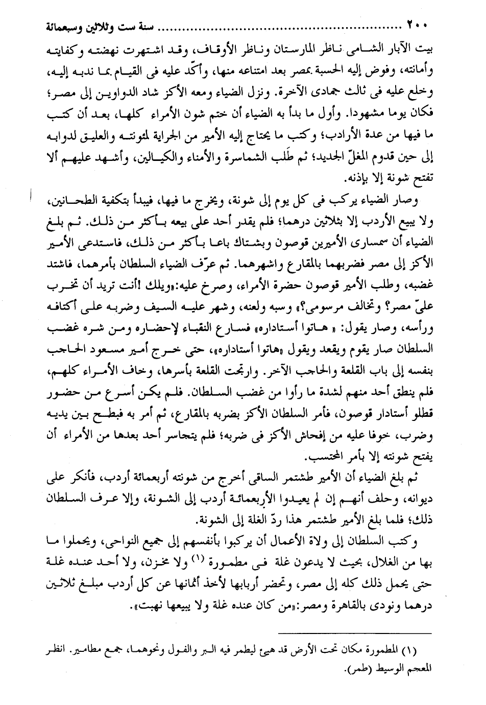 بَيت الْآبَار الشَّامي نَاظر المارستان وناظر الْأَوْقَاف وَقد اشتهرت نهضته وكفايته وأمانته وفوض إِلَيْهِ الْحِسْبَة بِمصْر بعد امْتِنَاعه مِنْهُمَا وأكد عَلَيْهِ فِي الْقيام بِمَا نَدبه إِلَيْهِ وخلع عَلَيْهِ فِي ثَالِث جُمَادَى الْآخِرَة. وَنزل الضياء وَمَعَهُ الأكز شاد الدَّوَاوِين إِلَى مصر فَكَانَ يَوْمًا مشهوداً. وَأول مَا بَدَأَ بِهِ الضياء أَن ختم شون الْأُمَرَاء كلهَا بعد أَن كتب مَا فِيهَا من عدَّة الأرادب وَكتب مَا يحْتَاج إِلَيْهِ الْأَمِير من الجراية لمئونته والعليق لدوابه إِلَى حِين قدوم الْمغل الْجَدِيد ثمَّ طلب الشماسرة والأمناء والكيالين وَأشْهد عَلَيْهِم أَلا تفتح شونة إِلَّا بِإِذْنِهِ. وَصَارَ الضياء يركب فِي كل يَوْم إِلَى شونة وَيخرج مَا فِيهَا فَيبْدَأ بتكفية الطحانين وَلَا يَبِيع الأردب إِلَّا بِثَلَاثِينَ درهما فَلم يقدر أحد على بَيْعه بِأَكْثَرَ من ذَلِك. ثمَّ بلغ الضياء أَن سمساري الأميرين قوصون وبشتاك باعا بِأَكْثَرَ من ذَلِك فاستدعي الْأَمِير الأكز إِلَى مصر فضربهما بالمقارع واشهرهما. ثمَّ عرف الضياء السُّلْطَان بأمرهما فَاشْتَدَّ غَضَبه وَطلب الْأَمِير قوصون حَضْرَة الْأُمَرَاء وصرخ عَلَيْهِ: وَيلك أَنْت تُرِيدُ أَن تخرب على مصر وتخالف مرسومي وسبه ولعنه وَشهر عَلَيْهِ السَّيْف وضربه على أكتافه وَرَأسه وَصَارَ يَقُول: هاتوا أستاداره فسارع النُّقَبَاء لإحضاره وَمن شَره غضب السُّلْطَان صَار يقوم وَيقْعد وَيَقُول هاتوا أستاداره حَتَّى خرج أَمِير مَسْعُود الْحَاجِب بِنَفسِهِ إِلَى بَاب القلعة والحاجب الآخر. وارتجت القلعة بأسرها وَخَافَ الْأُمَرَاء كلهم فَلم ينْطق أحد مِنْهُم لشدَّة مَا رَأَوْا من غضب السُّلْطَان. فَلم يكن أسْرع من حُضُور قطلو أستادار قوصون فَأمر السُّلْطَان الأكز بضربه بالمقارع ثمَّ أَمر بِهِ فبطح بَين يَدَيْهِ وَضرب خوفًا عَلَيْهِ من إفحاش الأكز فِي ضربه فَلم يتجاسر أحد بعْدهَا من الْأُمَرَاء أَن يفتح شونته إِلَّا بِأَمْر ثمَّ بلغ الضياء أَن الْأَمِير طشتمر الساقي أخرج من شونته أَرْبَعمِائَة أردب فَأنْكر على ديوانه وَحلف أَنهم إِن لم يُعِيدُوا الأربعمائة أردب إِلَى الشونة وَإِلَّا عرف السُّلْطَان ذَلِك فَلَمَّا بلغ الْأَمِير طشتمر هَذَا رد الْغلَّة إِلَى الشونة. وَكتب السُّلْطَان إِلَى وُلَاة الْأَعْمَال أَن يركبُوا بِأَنْفسِهِم إِلَى جَمِيع النواح ويحملوا مَا بهَا من الغلال بِحَيْثُ لَا يدعونَ غلَّة فِي مطمورة وَلَا مخزن وَلَا أحد عِنْده غلَّة حَتَّى يحمل ذَلِك كُله إِلَى مصر وتحضر أَرْبَابهَا لأخذ أثمانها عَن كل أردب مبلغ ثلانين درهما وَنُودِيَ بِالْقَاهِرَةِ ومصر: من كَانَ عِنْده غلَّة وَلَا يَبِيعهَا نهبت.