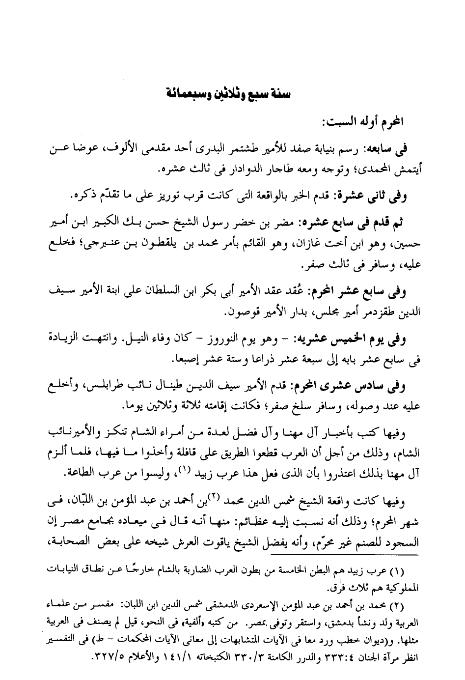 سنة سبع وَثَلَاثِينَ وَسَبْعمائة الْمحرم أَوله السبت: فِي سابعه: رسم بنيابة صفد للأمير طشتمر البدري أحد مقدمي الألوف عوضا عَن أيتمش المحمدي وَتوجه وَمَعَهُ طاجار الدوادار فِي ثَالِث عشره. وَفِي ثَانِي عشرَة: قدم الْخَبَر بالواقعة الَّتِي كَانَت قرب توريز على مَا تقدم ذكره. ثمَّ قدم فِي سَابِع عشره: مُضر بن خضر رَسُول الشَّيْخ حسن بك الْكَبِير ابْن أَمِير حُسَيْن وَهُوَ ابْن أُخْت غازان وَهُوَ الْقَائِم بِأَمْر مُحَمَّد بن يلقطون بن عنبرجي فَخلع عَلَيْهِ وسافر فِي ثَالِث صفر. وَفِي سَابِع عشر الْمحرم: عقد عقد الْأَمِير أبي بكر ابْن السُّلْطَان على ابْنة الْأَمِير سيف الدّين طقزدمر أَمِير مجْلِس بدار الْأَمِير قوصون. وَفِي يَوْم الْخَمِيس عشريه: وَهُوَ يَوْم النوروز كَانَ وَفَاء النّيل. وانتهت الزِّيَادَة فِي سَابِع عشر بَابه إِلَى سَبْعَة عشر ذِرَاعا وَسِتَّة عشر إصبعاً. وَفِي سادس عشرى الْمحرم: قدم الْأَمِير سيف الدّين طينال نَائِب طرابلس وأخلع عَلَيْهِ عِنْد وفيهَا كتب بأخبار آل مهنا وَآل فضل لعدة من أُمَرَاء الشَّام تنكز والأمير نَائِب الشَّام وَذَلِكَ من أجل أَن الْعَرَب قطعُوا الطَّرِيق على قافلة وَأخذُوا مَا فِيهَا فَلَمَّا ألزم آل مهنا بذلك اعتذروا بِأَن الَّذِي فعل هَذَا عرب زبيد وَلَيْسوا من عرب الطَّاعَة. وفيهَا كَانَت وَاقعَة الشَّيْخ شمس الدّين مُحَمَّد بن أَحْمد بن عبد الْمُؤمن بن اللبان فِي شهر الْمحرم وَذَلِكَ أَنه نسبت إِلَيْهِ عظائم: مِنْهَا أَنه قَالَ فِي ميعاده بِجَامِع مصر إِن السُّجُود للصنم غير محرم وَأَنه يفضل الشَّيْخ ياقوت الْعَرْش شَيْخه على بعض الصَّحَابَة