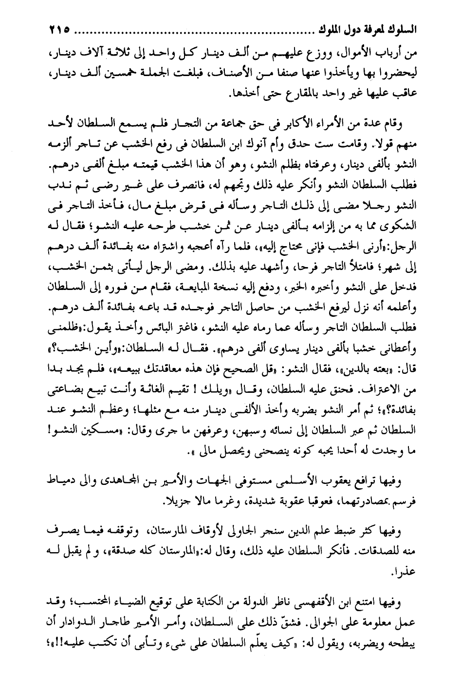 من أَرْبَاب الآموال ووزع عَلَيْهِم من ألف دِينَار كل وَاحِد إِلَى ثَلَاثَة أُلَّاف دِينَار ليحضروا بهَا ويأخذوا عَنْهَا صنفا من الْأَصْنَاف فبلغت الْجُمْلَة خمسين ألف دِينَار عاقب عَلَيْهَا غير وَاحِد بالمقارع حَتَّى أَخذهَا. وَقَامَ عدَّة من الْأُمَرَاء الأكابر فِي حق جمَاعَة من التُّجَّار فَلم يسمع السُّلْطَان لأحد مِنْهُم قولا. وَقَامَت سِتّ حدق وَأم آنوك ابْن السُّلْطَان فِي رفع الْخشب عَن تَاجر ألزمهُ النشو بألفي دِينَار وعرفتاه بظُلْم النشو وَهُوَ أَن هَذَا الْخشب قِيمَته مبلغ ألفي دِرْهَم. فَطلب السُّلْطَان النشو وَأنكر عَلَيْهِ ذَلِك وتجهم لَهُ فَانْصَرف على غير رضى ثمَّ ندب النشو رجلا مضى إِلَى ذَلِك التَّاجِر وَسَأَلَهُ فِي قرض مبلغ مَال فَأخذ التَّاجِر فِي الشكوى مِمَّا بِهِ من إِلْزَامه بألفي دِينَار عَن ثمن خشب طَرحه عَلَيْهِ النشو فَقَالَ لَهُ الرجل: أَرِنِي الْخشب فَإِنِّي مُحْتَاج إِلَيْهِ فَلَمَّا رأه أعجبه وَاشْتَرَاهُ مِنْهُ بفائدة ألف دِرْهَم إِلَى شهر فَامْتَلَأَ التَّاجِر فَرحا وَأشْهد عَلَيْهِ بذلك. وَمضى الرجل ليَأْتِي بِثمن الْخشب فَدخل على النشو وَأخْبرهُ الْخَبَر وَدفع إِلَيْهِ نُسْخَة الْمُبَايعَة فَقَامَ من فوره إِلَى السُّلْطَان وأعلمه أَنه نزل ليرْفَع الْخشب من حَاصِل التَّاجِر فَوَجَدَهُ قد بَاعه بفائدة ألف دِرْهَم. فَطلب السُّلْطَان التَّاجِر وَسَأَلَهُ عَمَّا رَمَاه عَلَيْهِ النشو فاغتر البائس وَأخذ يَقُول: ظَلَمَنِي وَأَعْطَانِي خشباً بألفي دِينَار يُسَاوِي ألفي دِرْهَم. فَقَالَ لَهُ السُّلْطَان: وَأَيْنَ الْخشب قَالَ: بِعته بِالدّينِ فَقَالَ النشو: قل الصَّحِيح فَإِن هَذِه معاقدتك بِبيعِهِ فَلم يجد بدا من الِاعْتِرَاف. فحنق عَلَيْهِ السُّلْطَان وَقَالَ وَيلك تقيم الغاثة وَأَنت تبيع بضاعتي بفائدة ثمَّ أَمر النشو بضربه وَأخذ الألفي دِينَار مِنْهُ مَعَ مثلهَا وَعظم النشو عِنْد السُّلْطَان ثمَّ عبر السُّلْطَان إِلَى نِسَائِهِ وسبهن وعرفهن مَا جرى وَقَالَ: مِسْكين النشو مَا وجدت لَهُ أحدا يُحِبهُ كَونه ينصحني وَيحصل مَالِي. وفيهَا ترافع يَعْقُوب الْأَسْلَمِيّ مُسْتَوْفِي الْجِهَات والأمير بن المجاهدي وَالِي دمياط فرسم بمصادرتهما فعوقبا عُقُوبَة شَدِيدَة وغرما مَالا جزيلاً. وفيهَا كثر ضبط علم الدّين سنجر الجاولي لأوقاف المارستان وتوقفه فِيمَا يصرف مِنْهُ للصدقات. فَأنْكر السُّلْطَان عَلَيْهِ ذَلِك وَقَالَ لَهُ: المارستان كُله صَدَقَة وَلم يقبل لَهُ عذرا. وفيهَا امْتنع ابْن الأقفهسي نَاظر الدولة من الْكِتَابَة على توقيع الضياء الْمُحْتَسب وَقد عمل مَعْلُومَة على الجوالي فشق ذَلِك على السُّلْطَان وَأمر الْأَمِير طاجار الدوادار أَن يبطحه ويضربه وَيَقُول لَهُ: كَيفَ يعلم السُّلْطَان على شَيْء وتأبى أَن تكْتب عَلَيْهِ {}
