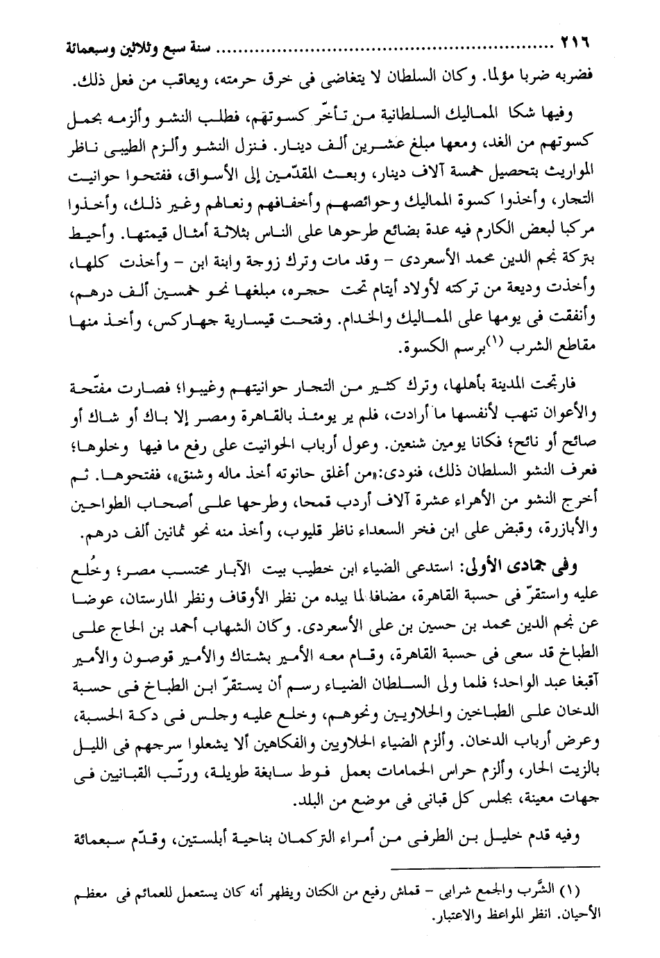 فَضَربهُ ضربا مؤلماً. وَكَانَ السُّلْطَان لَا يتغاضي فِي خرق حرمته ويعاقب من فعل ذَلِك. وفيهَا شكا المماليك السُّلْطَانِيَّة من تَأَخّر كسوتهم فَطلب النشو وألزمه بِحمْل كسوتهم من الْغَد وَمَعَهَا مبلغ عشْرين ألف دِينَار. فَنزل النشو وألزم الطَّيِّبِيّ نَاظر الْمَوَارِيث بتحصيل خَمْسَة أُلَّاف دِينَار وَبعث المقدمين إِلَى الْأَسْوَاق ففتحوا حوانيت التُّجَّار وَأخذُوا كسْوَة المماليك وحوائصهم وأخفافهم ونعالهم وَغير ذَلِك وَأخذُوا مركبا لبَعض الكارم فِيهِ عدَّة بضائع طرحوها على النَّاس بِثَلَاثَة أَمْثَال قيمتهَا. وأحيط بتركة نجم الدّين مُحَمَّد الأسعردي - وَقد مَاتَ وَترك زَوْجَة وَابْنَة ابْن - وَأخذت كلهَا. وَأخذت وَدِيعَة من تركته لأَوْلَاد أَيْتَام تَحت حجره مبلغها نَحْو خمسين ألف دِرْهَم وأنفقت فِي يَوْمهَا على المماليك والخدام. وَفتحت قيسارية جهاركس وَأخذ مِنْهَا مقاطع الشّرْب برسم الْكسْوَة. فارتجت الْمَدِينَة بِأَهْلِهَا وَترك كثير من التُّجَّار حوانيتهم وغيبوا فَصَارَت مفتحة والأعوان تنهب لأنفسها مَا أَرَادَت فَلم ير يَوْمئِذٍ بِالْقَاهِرَةِ ومصر إِلَّا باك أَو شَاك أَو صائح أَو نائح فَكَانَا يَوْمَيْنِ شنعين. وعول أَرْبَاب الحوانيت على وَقع مَا فِيهَا وخلوها فَعرف النشو السُّلْطَان ذَلِك فَنُوديَ: من أغلق حانوته أَخذ مَاله وشنق ففتحوها. ثمَّ أخرج النشو من الأهراء عشرَة أُلَّاف أردب قمحاً وطرحها على أَصْحَاب الطواحين والأبازرة وَقبض على ابْن فَخر السُّعَدَاء نَاظر قليوب وَأخذ مِنْهُ نَحْو ثَمَانِينَ ألف دِرْهَم. وَفِي جُمَادَى الأولى: استدعى الضياء ابْن خطيب بَيت الْآبَار محتسب مصر وخلع عَلَيْهِ وَاسْتقر فِي حسبَة الْقَاهِرَة مُضَافا لما بِيَدِهِ من نظر الْأَوْقَاف وَنظر المارستان عوضا عَن نجم الدّين مُحَمَّد بن حُسَيْن بن عَليّ الأسعردي. وَكَانَ الشهَاب أَحْمد بن الْحَاج عَليّ الطباخ قد سعى فِي حسبَة الْقَاهِرَة وَقَامَ مَعَه الْأَمِير بشتاك والأمير قوصون والأمير أقبغا عبد الْوَاحِد فَلَمَّا ولي السُّلْطَان الضياء رسم أَن يسْتَقرّ ابْن الطباخ فِي حسبَة الدُّخان على الطباخين والحلاويين وَنَحْوهم وخلع عَلَيْهِ وَجلسَ فِي دكة الْحِسْبَة وَعرض أَرْبَاب الدُّخان. وَأنزل الضياء الحلاويين والفكاهين أَلا يشعلوا سرجهم فِي اللَّيْل بالزيت الْحَار وألزم حواس الحمامات بِعَمَل فوط سابغة طَوِيلَة ورتب القبانيين فِي جِهَات مُعينَة بجلس كل قباني فِي مَوضِع من الْبَلَد. وَفِيه قدم خَلِيل بن الطرفي من أُمَرَاء التركمان بِنَاحِيَة أبلستين وَقدم سَبْعمِائة