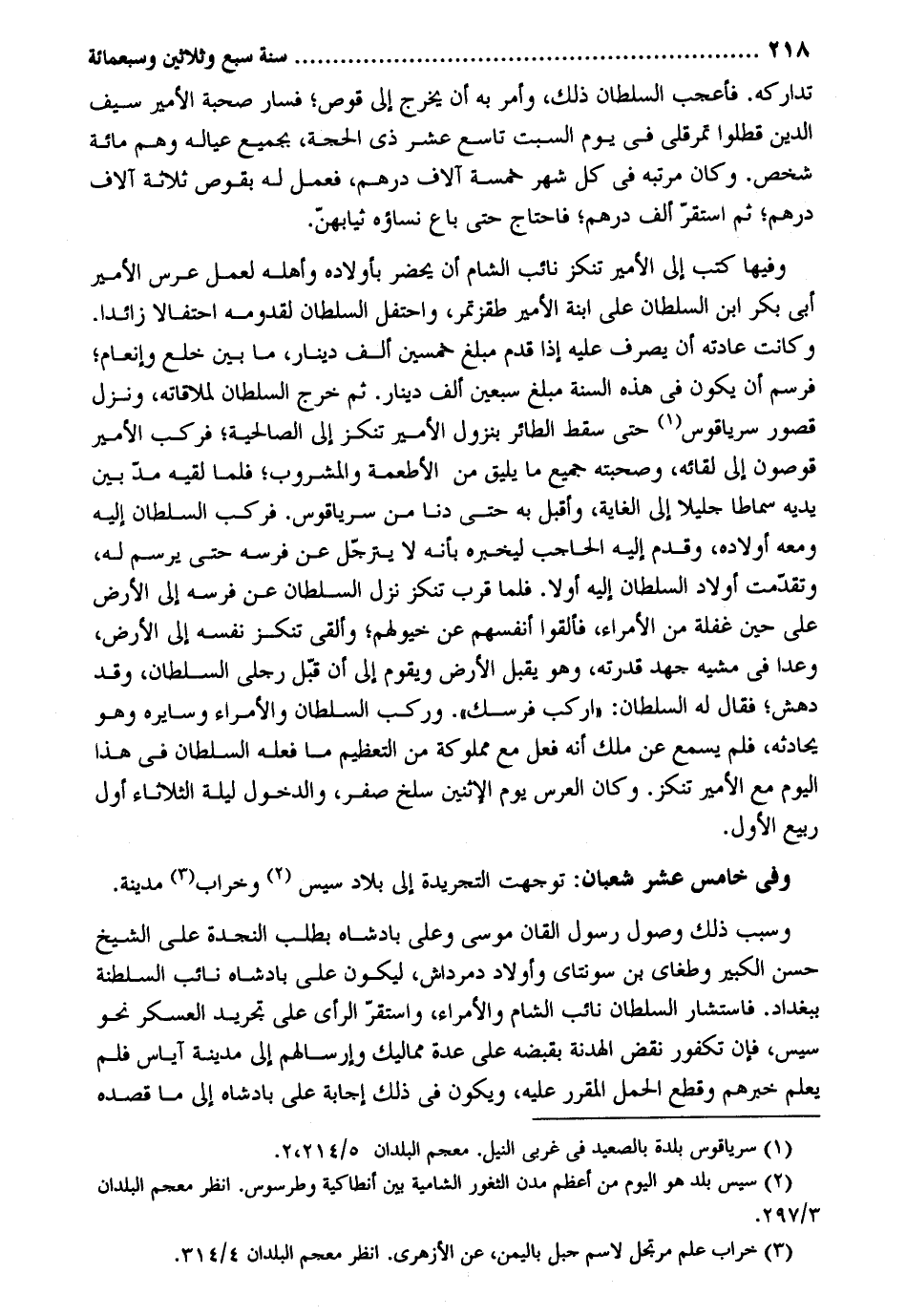 تَدَارُكه. فأعجب السُّلْطَان ذَلِك وَأمر بِهِ أَن يخرج إِلَى قوص فَسَار صُحْبَة الْأَمِير سيف الدّين قطلوا تمرقلي فِي يَوْم السبت تَاسِع عشر ذِي الْحجَّة بِجَمِيعِ عِيَاله وهم مائَة شخص. وَكَانَ مرتبه فِي كل شهر خَمْسَة أُلَّاف دِرْهَم فَعمل لَهُ بقوص ثَلَاثَة أُلَّاف دِرْهَم ثمَّ اسْتَقر ألف دِرْهَم فَاحْتَاجَ حَتَّى بَاعَ نساؤه ثيابهن. وفيهَا كتب إِلَى الْأَمِير تنكز نَائِب الشَّام أَن يحضر بأولاده وَأَهله لعمل عرس الْأَمِير أبي بكر ابْن السُّلْطَان على ابْنة الْأَمِير طقزتمر واحتفل السُّلْطَان لقدومه احتفالاً زَائِدا. وَكَانَت عَادَته أَن يصرف عَلَيْهِ إِذا قدم مبلغ خمسين ألف دِينَار مَا بَين خلع وإنعام فرسم أَن يكون فِي هَذِه السّنة مبلغ سبعين ألف دِينَار. ثمَّ خرج السُّلْطَان لملاقاته وَنزل قُصُور سرياقوس حَتَّى سقط الطَّائِر بنزول الْأَمِير تنكز إِلَى الصالحية فَركب الْأَمِير قوصون إِلَى لِقَائِه وصحبته جَمِيع مَا يَلِيق من الْأَطْعِمَة والمشروب فَلَمَّا لقِيه مد بَين يَدَيْهِ سماطاً جَلِيلًا إِلَى الْغَايَة وَأَقْبل بِهِ حَتَّى دنا من سرياقوس. فَركب السُّلْطَان إِلَيْهِ وَمَعَهُ أَوْلَاده وَقدم إِلَيْهِ الحاحب ليخبره بِأَنَّهُ لَا يترجل عَن فرسه حَتَّى يرسم لَهُ وَتَقَدَّمت أَوْلَاد السُّلْطَان إِلَيْهِ أَولا. فَلَمَّا قرب تنكز نزل السُّلْطَان عَن فرسه إِلَى الأَرْض على حِين غَفلَة من الْأُمَرَاء فَألْقوا أنفسهم عَن خيولهم وَأُلْقِي تنكز نَفسه إِلَى الأَرْض وَعدا فِي مَشْيه جهد قدرته وَهُوَ يقبل الأَرْض وَيقوم إِلَى أَن قبل رجْلي السُّلْطَان وَقد دهش فَقَالَ لَهُ السُّلْطَان: اركب فرسك. وَركب السُّلْطَان والأمراء وسايره وَهُوَ يحادثه فَلم يسمع عَن ملك أَنه فعل مَعَ مَمْلُوكَة من التَّعْظِيم مَا فعله السُّلْطَان فِي هَذَا الْيَوْم مَعَ الْأَمِير تنكز. وَكَانَ الْعرس يَوْم الْإِثْنَيْنِ سلخ صفر وَالدُّخُول لَيْلَة الثُّلَاثَاء أول ربيع الأول. وَفِي خَامِس عشر شعْبَان: تَوَجَّهت التجريدة إِلَى بِلَاد سيس وخراب مَدِينَة. وَسبب ذَلِك وُصُول رَسُول القان مُوسَى وَعلي بادشاه بِطَلَب النجدة على الشَّيْخ حسن الْكَبِير وطغاي بن سونتاي وَأَوْلَاد دمرداش ليَكُون عَليّ بادشاه نَائِب السلطنة بِبَغْدَاد. فَاسْتَشَارَ السُّلْطَان نَائِب الشَّام والأمراء وَاسْتقر الرَّأْي على تَجْرِيد الْعَسْكَر نَحْو سيس فَإِن تكفور نقض الْهُدْنَة بِقَبْضِهِ على عدَّة مماليك وإرسالهم إِلَى مَدِينَة آياس فَلم يعلم خبرهم وَقطع الْحمل الْمُقَرّر عَلَيْهِ وَيكون فِي ذَلِك إِجَابَة عَليّ بادشاه إِلَى مَا قَصده