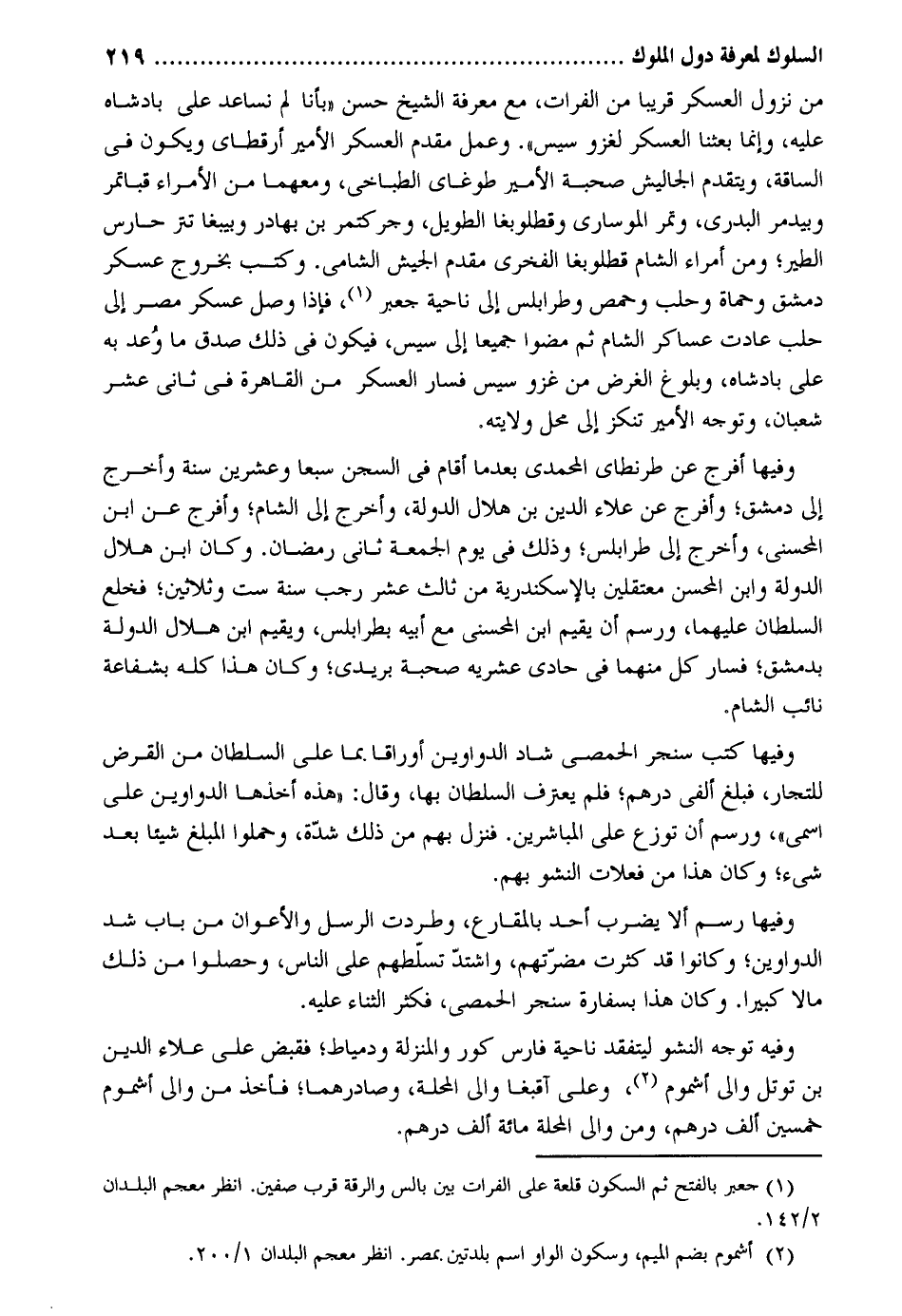 من نزُول الْعَسْكَر قَرِيبا من الْفُرَات مَعَ معرفَة الشَّيْخ حسن بِأَنا لم نساعد عَليّ بادشاه عَلَيْهِ وَإِنَّمَا بعثنَا الْعَسْكَر لغزو سيس. وَعمل مقدم الْعَسْكَر الْأَمِير أرقطاي وَيكون فِي السَّاقَة ويتقدم الجاليش صُحْبَة الْأَمِير طوغاي الطباخ ومعهما من الْأُمَرَاء قباتمر وبيدمر البدري وتمر الموساري وقطلوبغا الطَّوِيل وجوكتمر بن بهادو وبيبغا تتر حارس الطير وَمن أُمَرَاء الشَّام قطلوبغا الفخري مقدم الْجَيْش الشَّامي. وَكتب بِخُرُوج عَسْكَر دمشق وحماة وحلب وحمص وطرابلس إِلَى نَاحيَة جعبر فَإِذا وصل عَسْكَر مصر إِلَى حلب عَادَتْ عَسَاكِر الشَّام ثمَّ مضوا جَمِيعًا إِلَى سيس فَيكون فِي ذَلِك صدق مَا وعد بِهِ عَليّ بادشاه وبلوغ الغرص من غَزْو سيس فَسَار الْعَسْكَر من الْقَاهِرَة فِي ثَانِي عشر شعْبَان وَتوجه الْأَمِير تنكز إِلَى مَحل ولَايَته. وفيهَا أفرج عَن طرنطاي المحمدي بَعْدَمَا أَقَامَ فِي السجْن سبعا وَعشْرين سنة وَأخرج إِلَى دمشق وَأَفْرج عَن عَلَاء الدّين بن هِلَال الدولة وَأخرج إِلَى الشَّام وَأَفْرج عَن ابْن المحسني وَأخرج إِلَى طرابلس وَذَلِكَ فِي يَوْم الْجُمُعَة ثَانِي رَمَضَان. وَكَانَ ابْن هِلَال الدولة وَابْن المحسني معتقلين بالإسكندرية من ثَالِث عشر رَجَب سنة سِتّ وَثَلَاثِينَ فَخلع السُّلْطَان عَلَيْهِمَا ورسم أَن يُقيم ابْن المحسني مَعَ أَبِيه بطرابلس وَيُقِيم ابْن هِلَال الدولة بِدِمَشْق فَسَار كل مِنْهُمَا فِي حادي عشريه صُحْبَة بريدي وَكَانَ هَذَا كُله بشفاعة نَائِب الشَّام. وفيهَا كتب سنجر الْحِمصِي شاد الدَّوَاوِين أوراقاً بِمَا على السُّلْطَان من الْقَرْض للتجار فَبلغ ألفي دِرْهَم فَلم يعْتَرف السُّلْطَان بهَا وَقَالَ: هَذِه أَخذهَا الدَّوَاوِين على اسْمِي ورسم أَن توزع على المباشرين فَنزل بهم من ذَلِك شدَّة وحملوا الْمبلغ شَيْئا بعد شَيْء وَكَانَ هَذَا من فعلات النشو بهم. وفيهَا رسم أَلا يضْرب أحد بالمقارع وطردت الرُّسُل والأعوان من بَاب شدّ الدَّوَاوِين وَكَانُوا قد كثرت مضرتهم وَاشْتَدَّ تسلطهم على النَّاس وحصلوا من ذَلِك مَالا كَبِيرا. وَكَانَ هَذَا بسفارة سنجر الْحِمصِي فَكثر الثَّنَاء عَلَيْهِ. وَفِيه توجه النشو ليتفقد نَاحيَة فَارس كور والمنزلة ودمياط فَقبض على عَلَاء الدّين بن توتل وَالِي أشوم وعَلى أقبغا وَالِي الْمحلة وصادرهما فَأخذ من وَالِي أشوم خمسين ألف دِرْهَم وَمن وَالِي الْمحلة مائَة ألف دِرْهَم.