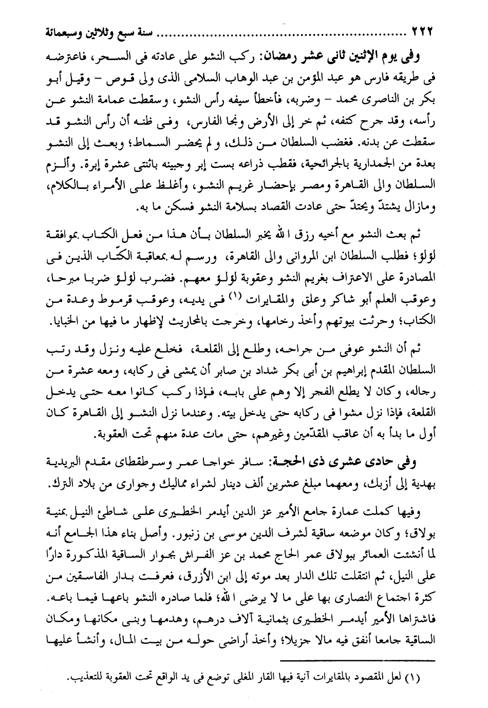 وَفِي يَوْم الْإِثْنَيْنِ ثَانِي عشر رَمَضَان: ركب النشو على عَادَته فِي السحر فاعترضه فِي طَرِيقه فَارس هُوَ عبد الْمُؤمن بن عبد الْوَهَّاب السلَامِي الَّذِي ولي قوص وَقيل أَبُو بكر بن الناصري مُحَمَّد وضربه فَأَخْطَأَ سَيْفه رَأس النشو وَسَقَطت عِمَامَة النشو عَن رَأسه وَقد جرح كتفه ثمَّ خر إِلَى الأَرْض وَنَجَا الْفَارِس وَفِي ظَنّه أَن رَأس النشو قد سَقَطت عَن بدنه. فَغَضب السُّلْطَان من ذَلِك وَلم يحضر السماط وَبعث إِلَى النشو بعدة من الجمدارية بالجرائحية فقطب ذراعه بست إبر وجبينه باثنتي عشرَة إبرة. وألزم السُّلْطَان وَالِي الْقَاهِرَة ومصر بإحضار غَرِيم النشو وَأَغْلظ على الْأُمَرَاء بالْكلَام ومازال يشْتَد ويحتد حَتَّى عَادَتْ القصاد بسلامة النشو فسكن مَا بِهِ ثمَّ بعث النشو مَعَ أَخِيه رزق الله يخبر السُّلْطَان بِأَن هَذَا من فعل الْكتاب بموافقة لُؤْلُؤ فَطلب السُّلْطَان ابْن المرواني وَالِي الْقَاهِرَة ورسم بمعاقبة الْكتاب الَّذين فِي المصادرة على الِاعْتِرَاف بغريم النشو وعقوبة لُؤْلُؤ مَعَهم. فَضرب لُؤْلُؤ ضربا مبرحاً وعوقب الْعلم أَبُو شَاكر وعلق والمقايرات فِي يَدَيْهِ وعوقب قرموط وعدة من الْكتاب وحرثت بُيُوتهم وَأخذ رخامها وَخرجت بالمحاريث لإِظْهَار مَا فِيهَا من الخبايا. ثمَّ أَن النشو عوفي من جراحه وطلع إِلَى القلعة فَخلع عَلَيْهِ وَنزل وَقد رتب السُّلْطَان الْمُقدم إِبْرَاهِيم بن أبي بكر شَدَّاد بن صابر أَن يمشي فِي ركابه وَمَعَهُ عشرَة من رِجَاله وَكَانَ لَا يطلع الْفجْر إِلَّا وهم على بَابه فَإِذا ركب كَانُوا مَعَه حَتَّى يدْخل القلعة فَإِذا نزل مَشوا فِي ركابه حَتَّى يدْخل بَيته. وعندما نزل النشو إِلَى الْقَاهِرَة كَانَ أول مَا بَدَأَ بِهِ أَن عاقب المقدمين وَغَيرهم حَتَّى مَاتَ عدَّة مِنْهُم تَحت الْعقُوبَة. وَفِي حادي عشرى ذِي الْحجَّة: سَافر خواجا عمر وسرطقطاي مقدم البريدية بهدية إِلَى أزبك ومعهما مبلغ عشْرين ألف دِينَار لشراء مماليك وجواري من بِلَاد التّرْك. وفيهَا كملت عمَارَة جَامع الْأَمِير عز الدّين أيدمر الخطيري على شاطئ النّيل بمنية بولاق وَكَانَ مَوْضِعه ساقية لشرف الدّين مُوسَى بن زنبور. وأصل بِنَاء هَذَا الْجَامِع أَنه لما أنشئت العمائر ببولاق عمر الْحَاج مُحَمَّد بن عز الْفراش بجوار الساقية المذكوره دَارا على النّيل ثمَّ انْتَقَلت تِلْكَ الدَّار بعد مَوته إِلَى ابْن الْأَزْرَق فَعرفت بدار الْفَاسِقين من كَثْرَة اجْتِمَاع النَّصَارَى بهَا على مَا لَا يرضى الله فَلَمَّا صادره النشو بَاعهَا فِيمَا بَاعه. فاشتراها الْأَمِير أيدمر الخطيري بِثمَانِيَة أُلَّاف دِرْهَم وهدمها وَبنى مَكَانهَا وَمَكَان الساقية جَامعا أنْفق فِيهِ مَالا جزيلاً وَأخذ أَرَاضِي حوله من بَيت المَال وَأَنْشَأَ عَلَيْهَا