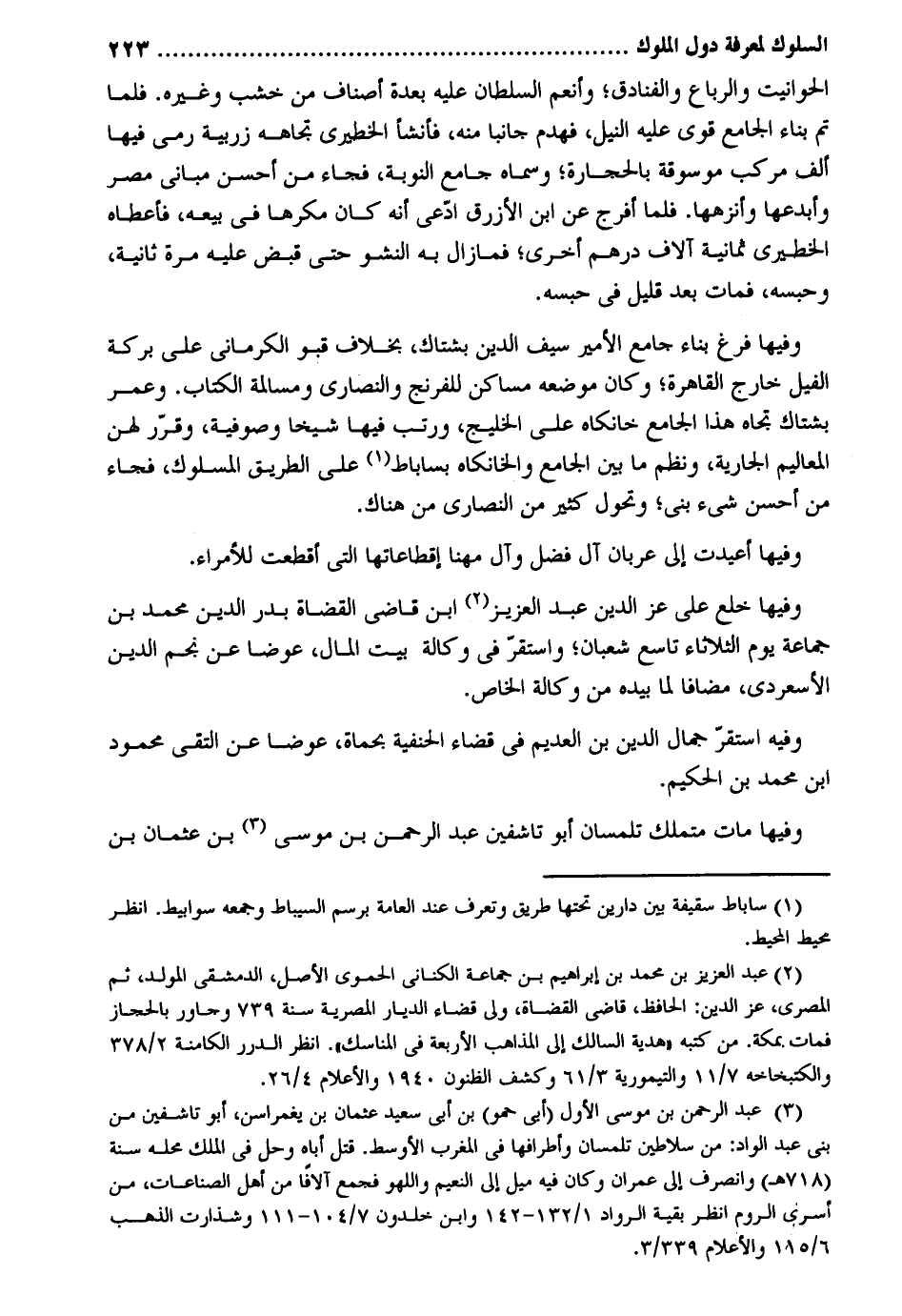 الحوانيت والرباع والفنادق وأنعم السُّلْطَان عَلَيْهِ بعدة أَصْنَاف من خشب وَغَيره. فَلَمَّا تمّ بِنَاء الْجَامِع قوي عَلَيْهِ النّيل فهدم جانباً مِنْهُ فَأَنْشَأَ الخطيري تجاهه زريبة رمى بهَا ألف مركب موسوقة بِالْحِجَارَةِ وَسَماهُ جَامع النّوبَة فجَاء من أحسن مباني مصر وأبدعها وأنزهها. فَلَمَّا أفرج عَن ابْن الْأَزْرَق ادعِي أَنه كَانَ مكْرها فِي بَيْعه فَأعْطَاهُ الخطيري ثَمَانِيَة أُلَّاف دِرْهَم أُخْرَى فمازال بِهِ النشو حَتَّى قبض عَلَيْهِ مرّة ثَانِيَة وحبسه فَمَاتَ بعد قَلِيل فِي حَبسه. وفيهَا فرغ بِنَاء جَامع الْأَمِير سيف الدّين بشتاك بِخِلَاف قبو الْكرْمَانِي على بركَة الْفِيل خَارج الْقَاهِرَة وَكَانَ مَوْضِعه مسَاكِن للفرنج وَالنَّصَارَى ومسالمة الْكتاب. وَعمر بشتاك تجاه هَذَا الْجَامِع خانكاه على الخليج ورتب فِيهَا شَيخا وصوفية وَقرر لَهُنَّ المعاليم الْجَارِيَة ونظم مَا بَين الْجَامِع والخانكاه بساباط على الطَّرِيق المسلوك فجَاء من أحسن شَيْء بنى وتحول كثير من النَّصَارَى من هُنَاكَ. وفيهَا أُعِيدَت إِلَى عربان آل فضل وَآل مهنا إقطاعاتها الَّتِي أقطعت لِلْأُمَرَاءِ. وفيهَا خلع عَليّ عز الدّين عبد الْعَزِيز ابْن قَاضِي الْقُضَاة بدر الدّين مُحَمَّد بن جمَاعَة يَوْم الثُّلَاثَاء تَاسِع شعْبَان وَاسْتقر فِي وكَالَة بَيت المَال عوضا عَن نجم الدّين الأسعردي مُضَافا لما بِيَدِهِ من وكَالَة الْخَاص. وَفِيه اسْتَقر جمال الدّين بن العديم فِي قَضَاء الْحَنَفِيَّة بحماة عوضا عَن التقي مَحْمُود ابْن مُحَمَّد بن الْحَكِيم. وفيهَا مَاتَ متملك تلمسان أَبُو تاشفين عبد الرَّحْمَن بن مُوسَى بن عُثْمَان بن