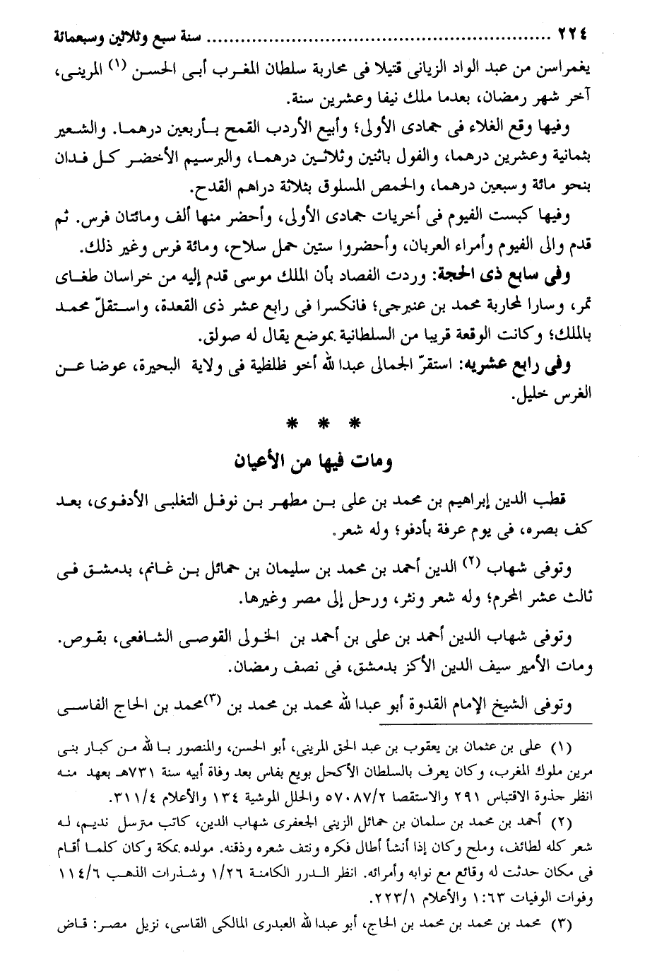 يغمراسن من عبد الواد الزياني قَتِيلا فِي محاربة سُلْطَان الْمغرب أبي الْحسن المريني أخر شهر رَمَضَان بَعْدَمَا ملك نيفا وَعشْرين سنة. وفيهَا وَقع الغلاء فِي جُمَادَى الأولى وأبيع الأردب الْقَمْح بِأَرْبَعِينَ درهما. وَالشعِير بِثمَانِيَة وَعشْرين درهما والفول بِاثْنَيْنِ وَثَلَاثِينَ درهما والبرسيم الْأَخْضَر كل فدان بِنَحْوِ مائَة وَسبعين درهما والحمص المسلوق بِثَلَاثَة دَرَاهِم الْقدح. وفيهَا كبست الفيوم فِي أخريات جُمَادَى الأولى وأحضر مِنْهَا ألف ومائتان فرس. ثمَّ قدم وَالِي الفيوم وأمراء العربان وأحضروا سِتِّينَ حمل سلَاح وَمِائَة فرس وَغير ذَلِك. وَفِي سَابِع ذِي الْحجَّة: وَردت الفصاد بِأَن الْملك مُوسَى قدم إِلَيْهِ من خُرَاسَان طغاي تمر وسارا لمحاربة مُحَمَّد بن عنبرجي فانكسرا فِي رَابِع عشر ذِي الْقعدَة واستقل مُحَمَّد بِالْملكِ وَكَانَت الْوَقْعَة قَرِيبا من السُّلْطَانِيَّة بِموضع يُقَال لَهُ صولق. وَفِي رَابِع عشريه: اسْتَقر الجمالي عبد الله أَخُو ظلظية فِي ولَايَة الْبحيرَة عوضا عَن الْغَرْس خَلِيل. وَمَات فِيهَا من الْأَعْيَان قطب الدّين إِبْرَاهِيم بن مُحَمَّد بن عَليّ بن مطهر بن نَوْفَل التغلبي الأدفوي بعد كف بَصَره فِي يَوْم عَرَفَة بأدفو وَله شعر. وَتُوفِّي شهَاب الدّين أَحْمد بن مُحَمَّد بن سُلَيْمَان بن حمائل بن غَانِم بِدِمَشْق فِي ثَالِث عشر الْمحرم وَله شعر ونثر ورحل إِلَى مصر وَغَيرهَا. وَتُوفِّي شهَاب الدّين أَحْمد بن عَليّ بن أَحْمد بن الخولي القوصي الشَّافِعِي بقوص. وَمَات الْأَمِير سيف الدّين الأكز بِدِمَشْق فِي نصف رَمَضَان. وَتُوفِّي الشَّيْخ الإِمَام الْقدْوَة أَبُو عبد الله مُحَمَّد بن مُحَمَّد بن مُحَمَّد بن الْحَاج الفاسي