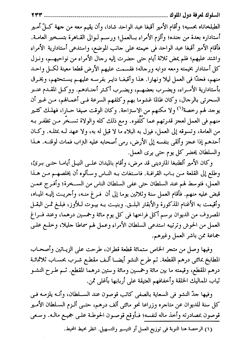 الطبلخاناه بِحَسبِهِ وَأقَام الْأَمِير قبغا عبد الْوَاحِد شادا وَأَن يُقيم مَعَه من جِهَة كل أَمِير أستاداره بعدة من جنده وألزم الْأُمَرَاء بِالْعَمَلِ ورسم لوالي الْقَاهِرَة بتسخير الْعَامَّة. فَأَقَامَ الْأَمِير أقبغا عبد الْوَاحِد فِي خيمته على جَانب الْموضع واستدعى أستادارية الْأُمَرَاء وَاشْتَدَّ عَلَيْهِم فَلم يمض ثَلَاثَة أَيَّام حَتَّى حضرت إِلَيْهِ رجال الْأُمَرَاء من نواحيهم وَنزل كل أستادار بخيمته وَمَعَهُ دوابه وَرِجَاله فقسمت عَلَيْهِم الأرص قطعا مُعينَة لكل وَاحِد مِنْهُم فجدا فِي الْعَمَل لَيْلًا وَنَهَارًا. هَذَا وأقبغا داير بفرسه عَلَيْهِم يستحثهم ويخرق بأستادارية الْأُمَرَاء وَيضْرب بَعضهم وَيضْرب أَكثر أجنادهم. ووكل الْمُقدم عنبر السحرتي بِالرِّجَالِ وَكَانَ ظَالِما غشوماً بهم وكلفهم السرعة فِي أَعْمَالهم من غير أَن يُوجد لَهُم رخصَة وَلَا مكنهم من الاسْتِرَاحَة. وَكَانَ الْوَقْت صيفاً حاراً فَهَلَك كثير مِنْهُم فِي الْعَمَل لعجز قدرتهم عَمَّا كلفوه. وَمَعَ ذَلِك كُله والولاة تسخر من تظفر بِهِ من الْعَامَّة وتسوقه إِلَى الْعَمَل فيزل بِهِ الْبلَاء مَا لَا قبل لَهُ بِهِ وَلَا عهد لَهُ بِمثلِهِ. وَكَانَ أحدهم إِذا عجز وَألقى بِنَفسِهِ إِلَى الأَرْض رمى أَصْحَابه عَلَيْهِ التُّرَاب فَمَاتَ لوقته هَذَا وَالسُّلْطَان يحضر كل يَوْم حَتَّى يرى الْعَمَل. وَكَانَ الْأَمِير ألطنبغا المارديني قد مرض وَأقَام بالميدان على النّيل أَيَّامًا حَتَّى برِئ وطلع إِلَى القلعة من بَاب القرافة. فاستغاث بِهِ النَّاس وسألوه أَن يخلصهم من هَذَا الْعَمَل فتوسط لَهُم عِنْد السُّلْطَان حَتَّى عفى السُّلْطَان النَّاس من السخرة وَأَفْرج عَمَّن قبض عَلَيْهِ مِنْهُم. فَأَقَامَ الْعَمَل سنة وَثَلَاثِينَ يَوْمًا إِلَى أَن فرغ مِنْهُ وأجريت إِلَيْهِ الْمِيَاه وأقيمت بِهِ الأغنام الْمَذْكُورَة والأبقار البلق. وبنيت بِهِ بيُوت للأوز فَبلغ ثمن البقل المصروف من الدِّيوَان برسم أكل فراخها فِي كل يَوْم مائَة وَخمسين درهما وَعند فرَاغ الْعَمَل من الحوش وترتيبه استدعى السُّلْطَان الْأُمَرَاء وَعمل لَهُم سماطاً جَلِيلًا وخلع على جمَاعَة مِمَّن بَاشر الْعَمَل وَغَيرهم. وفيهَا وصل من متجر الْخَاص سِتّمائَة قِطْعَة قطران طرحت على الزياتين وَأَصْحَاب المطابخ بِمِائَتي دِرْهَم الْقطعَة. ثمَّ طرح النشو أَيْضا ألف مقطع شرب بِحِسَاب ثَلَاثمِائَة دِرْهَم المقطع وَقِيمَته مَا بَين مائَة وَخمسين وَمِائَة وَسِتِّينَ درهما المقطع. ثمَّ طرح النشو ثِيَاب المماليك الْخلقَة وأخفافهم العتيقة على أَرْبَابهَا بأغلى ثمن. وفيهَا جد النشو فِي السّعَايَة بالصفي كَاتب قوصون عِنْد السُّلْطَان وَأَنه يلْزمه فِي كل سنة للديوان عَن متاجره وزراعاً نَحْو مِائَتي ألف دِرْهَم حَتَّى ألزم السُّلْطَان الْأَمِير قوصون بمصادرته وَأخذ مَاله لنَفسِهِ فأوقع قوصون الحوطة على جَمِيع مَاله. وسعى