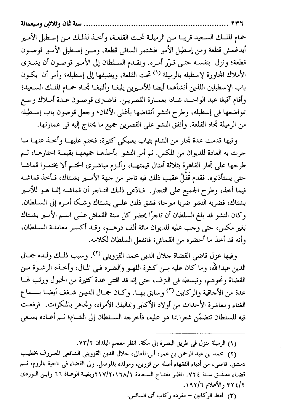 حمام الْملك السعيد قَرِيبا من الرميلة تَحت القلعة وَأخذ لذَلِك من إسطبل الْأَمِير أيدغمش قِطْعَة وَمن إسطبل الْأَمِير طشتمر الساقي قِطْعَة وَمن إسطبل الْأَمِير قوصون قِطْعَة وَنزل بِنَفسِهِ حَتَّى مرر أمره. وَتقدم السُّلْطَان إِلَى الْأَمِير قوصون أَن يَشْتَرِي الْأَمْلَاك الْمُجَاورَة لإسطبله بالرميلة تَحت القلعة ويضيفها إِلَى إسطبله وَأمر أَن يكون بَاب الإسطبلين اللَّذين أنشأهما أَيْضا للأميرين يلبغا وألنبغا تجاه حمام الْملك السعيد وَأقَام آقبغا عبد الْوَاحِد شادا بعمارة القصرين. فَاشْترى قوصون عدَّة أَمْلَاك وسع بمواضعها فِي اسطبله وَطرح النشو أنقاضها بأغلى الْأَثْمَان وَجعل قوصون بَاب إسطبله من الرميلة تجاه القلعة. وَأنْفق النشو على القصرين جَمِيع مَا يحْتَاج إِلَيْهِ فِي عمارتها. وفيهَا قدمت عدَّة تجار من الشَّام بِثِيَاب بعلبكي كَثِيرَة فختم عَلَيْهَا وَأخذ عَنْهَا مَا جرت بِهِ الْعَادة للديوان من المكس. ثمَّ أَمر النشو بأخذها جَمِيعهَا بِقِيمَة اخْتَارَهَا ثمَّ طرحها على تجار الْقَاهِرَة بِثَلَاثَة أَمْثَال قيمتهَا وألزم مباشري الْخَتْم أَلا يختموا قماشاً حَتَّى يستأذنوه. فَقدم قفل عقيب ذَلِك فِيهِ تَاجر من جِهَة الْأَمِير بشتاك فَأخذ قماشه فِيمَا أَخذ وَطرح الْجَمِيع على التُّجَّار. فَادّعى ذَلِك التَّاجِر أَن قماشه إِنَّمَا هُوَ للأمير بشتاك فَضَربهُ النشو ضربا مبرحاً فشق ذَلِك على بشتاك وشكا أمره إِلَى السُّلْطَان. وَكَانَ النشو قد بلغ السُّلْطَان أَن تَاجِرًا يحضر كل سنة القماش على اسْم الْأَمِير بشتاك بِغَيْر مكس حَتَّى وَجب عَلَيْهِ للديوان مائَة ألف دِرْهَم وَقد أكسر مُعَاملَة السُّلْطَان وَأَنه قد أَخذ مَا أحضرهُ من القماش فانفعل السُّلْطَان لكَلَامه. وفيهَا عزل قَاضِي الْقُضَاة جلال الدّين مُحَمَّد الْقزْوِينِي. وَسبب ذَلِك وَلَده جمال الدّين عبد الله وَمَا كَانَ عَلَيْهِ من كَثْرَة اللَّهْو والشره فِي المَال وَأَخذه الرِّشْوَة من الْقُضَاة وَنَحْوهم وتبسطه فِي الترف حَتَّى إِنَّه قد اقتنى عدَّة كَثِيرَة من الْخُيُول ورتب لَهَا عدَّة من الأجاقية والركابين وسابق بهَا. وَكَانَ جمال الدّين شغف أَيْضا بِسَمَاع الْغناء ومعاشرة الْأَحْدَاث من أَوْلَاد الأكابر ومماليك الْأُمَرَاء وتجاهر بالمنكرات. فرمعت فِيهِ للسُّلْطَان تَتَضَمَّن شعرًا بِمَا هُوَ عَلَيْهِ فَأخْرجهُ السُّلْطَان إِلَى الشَّام ثمَّ أَعَادَهُ بسعي