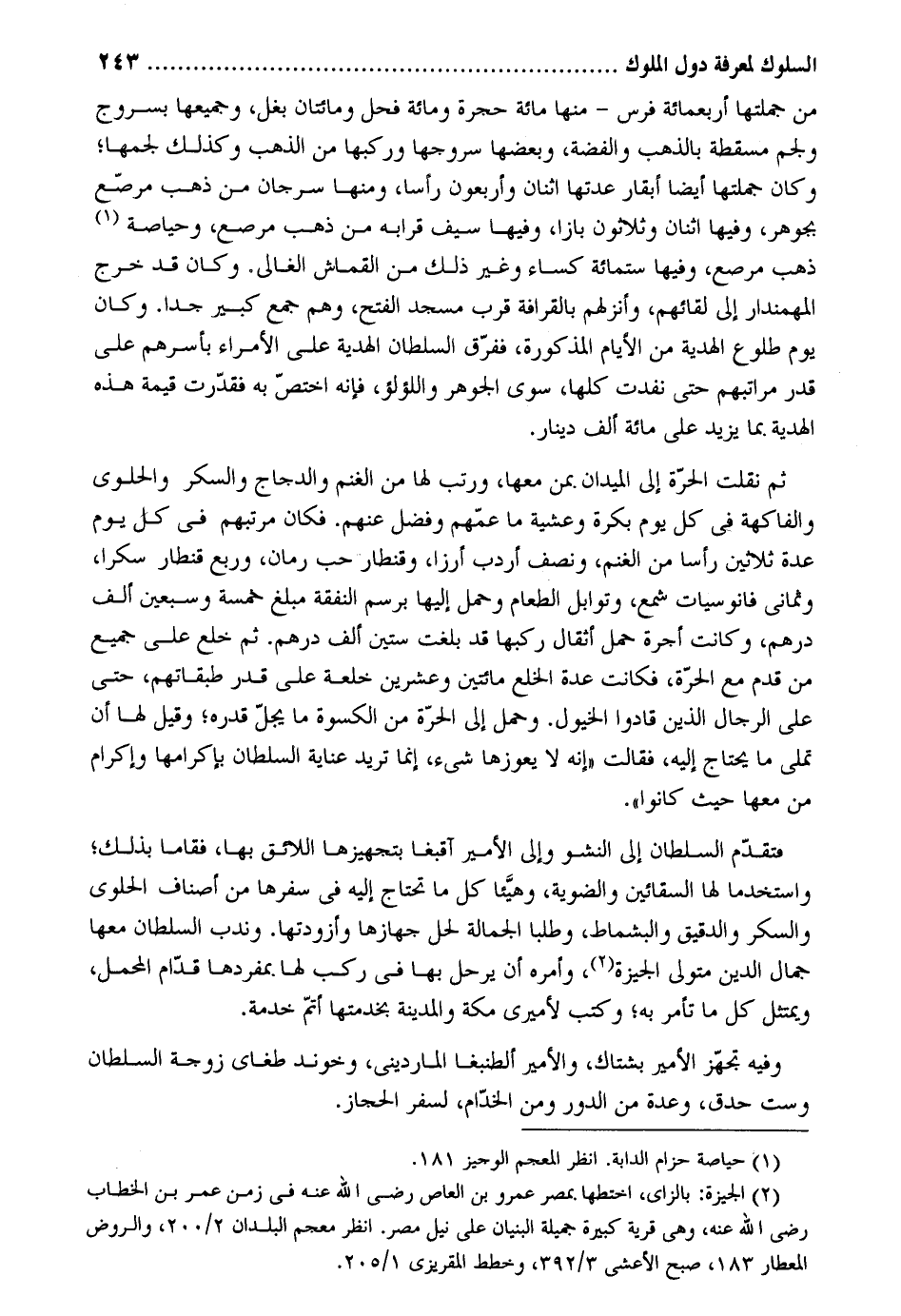 من جُمْلَتهَا أَرْبَعمِائَة فرس مِنْهَا مائَة حجرَة وَمِائَة فَحل ومائتان بغل وجميعها بسروج ولجم مسقطة بِالذَّهَب وَالْفِضَّة وَبَعضهَا سُرُوجهَا وركبها من الذَّهَب وَكَذَلِكَ لجمها وَكَانَ جُمْلَتهَا أَيْضا أبقار عدتهَا اثْنَان وَأَرْبَعُونَ رَأْسا وَمِنْهَا سرجان من ذهب مرصع بجوهر وفيهَا اثْنَان وَثَلَاثُونَ بازاً وفيهَا سيف قرَابه من ذهب مرصع وحياصة ذهب مرصع وفيهَا سِتّمائَة كسَاء وَغير دلك من القماش الغالي. وَكَانَ قد خرج المهمندار إِلَى لقائهم وأنزلهم بالقرافة قرب مَسْجِد الْفَتْح وهم جمع كَبِير جدا. وَكَانَ يَوْم طُلُوع الْهَدِيَّة من الْأَيَّام الْمَذْكُورَة فَفرق السُّلْطَان الْهَدِيَّة على الْأُمَرَاء بأسرهم على قدر مَرَاتِبهمْ حَتَّى نفدت كلهَا سوى الْجَوْهَر واللؤلؤ فَإِنَّهُ اخْتصَّ بِهِ فقدرت قيمَة هَذِه الْهَدِيَّة بِمَا يزِيد على مائَة ألف دِينَار. ثمَّ نقلت الْحرَّة إِلَى الميدان بِمن مَعهَا ورتب لَهَا من الْغنم والدجاج وَالسكر والحلوى والفاكهة فِي كل يَوْم بكرَة وَعَشِيَّة مَا عمهم وَفضل عَنْهُم. فَكَانَ مرتبهم فِي كل يَوْم عدَّة ثَلَاثِينَ رَأْسا من الْغنم وَنصف أردب أرزاً وقنطار حب رمان وَربع قِنْطَار سكرا وثماني فانوسيات شمع وتوابل الطَّعَام وَحمل إِلَيْهَا برسم النَّفَقَة مبلغ خَمْسَة وَسبعين ألف دِرْهَم وَكَانَت أُجْرَة حمل أثقال ركبهَا قد بلغت سِتِّينَ ألف دِرْهَم. ثمَّ خلع على جَمِيع من قدم مَعَ الْحرَّة فَكَانَت عدَّة الْخلْع مِائَتَيْنِ وَعشْرين خلعة على قدر طبقاتهم حَتَّى على الرِّجَال الَّذين قادوا الْخُيُول. وَحمل إِلَى الْحرَّة من الْكسْوَة مَا يجل قدره وَقيل لَهَا أَن تملي مَا يحْتَاج إِلَيْهِ فَقَالَت إِنَّه لَا يعوزها شَيْء إِنَّمَا تُرِيدُ عناية السُّلْطَان بإكرامها وإكرام من مَعهَا حَيْثُ كَانُوا. فَتقدم السُّلْطَان إِلَى النشو وَالِي الْأَمِير آقبغا بتجهيزها اللَّائِق بهَا فقاما بذلك واستخدما لَهَا السقائين والضوية وهيئا كل مَا تحْتَاج إِلَيْهِ فِي سفرها من أَصْنَاف الْحَلْوَى وَالسكر والدقيق والبشماط وطلبا الجمالة لحل جهازها وأزودتها. وَندب السُّلْطَان مَعهَا جمال الدّين مُتَوَلِّي الجيزة وَأمره أَن يرحل بهَا فِي ركب لَهَا بمفردها قُدَّام الْمحمل ويمتثل كل مَا تَأمر بِهِ وَكتب لأميري مَكَّة وَالْمَدينَة بخدمتها أتم خدمَة. وَفِيه تجهز الْأَمِير بشتاك والأمير ألطنبغا المارديني وخوند طغاي زَوْجَة السُّلْطَان وست حدق وعدة من الدّور وَمن الخدام لسفر الْحجاز.