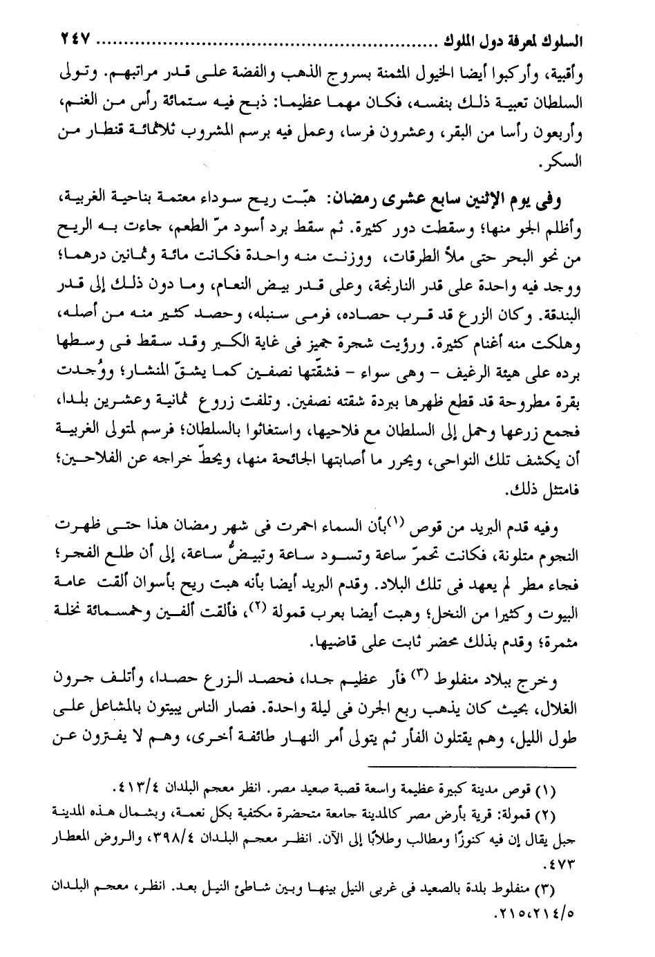 وأقبية وأركبوا أَيْضا الْخُيُول المثمنة بسروج الذَّهَب وَالْفِضَّة على قدر مَرَاتِبهمْ. وَتَوَلَّى السُّلْطَان تعبية ذَلِك بِنَفسِهِ فَكَانَ مهما عَظِيما: ذبح فِيهِ سِتّمائَة رَأس من الْغنم وَأَرْبَعُونَ رَأْسا من الْبَقر وَعِشْرُونَ فرسا وَعمل فِيهِ برسم المشروب ثَلَاثمِائَة قِنْطَار من السكر. وَفِي يَوْم الْإِثْنَيْنِ سَابِع عشرى رَمَضَان: هبت ريح سَوْدَاء معتمة بِنَاحِيَة الغربية وأظلم الجو مِنْهَا وَسَقَطت دور كَثِيرَة. ثمَّ سقط برد أسود مر الطّعْم حاءت بِهِ الرّيح من نَحْو الْبَحْر حَتَّى مَلأ الطرقات ووزنت مِنْهُ وَاحِدَة فَكَانَت مائَة وَثَمَانِينَ درهما وَوجد فِيهِ وَاحِدَة على قدر النارنجة وعَلى قدر بيض النعام وَمَا دون ذَلِك إِلَى قدر البندقة. وَكَانَ الزَّرْع قد قرب حَصَاده فَرمى سنبله وحصد كثير مِنْهُ من أَصله وَهَلَكت مِنْهُ أَغْنَام كَثِيرَة. ورؤيت شَجَرَة جميز فِي غَايَة الْكبر وَقد سقط فِي وَسطهَا برده على هَيْئَة الرَّغِيف وَهِي سَوَاء - فشقتها نِصْفَيْنِ كَمَا يشق الْمِنْشَار وَوجدت بقرة مطروحة قد قطع ظهرهَا بِبُرْدَةٍ شقته نِصْفَيْنِ. وَتَلفت زروع ثَمَانِيَة وَعشْرين بَلَدا فَجمع زَرعهَا وَحمل إِلَى السُّلْطَان مَعَ فلاحيها واستغاثوا بالسلطان فرسم لمتولي الغربية أَن يكْشف تِلْكَ النواح وَيُحَرر مَا أصابتها الْجَائِحَة مِنْهَا ويحط خراجه عَن وَفِيه قدم الْبَرِيد من قوص بِأَن السَّمَاء احْمَرَّتْ فِي شهر رَمَضَان هَذَا حَتَّى ظَهرت النُّجُوم متلونة فَكَانَت تحمر سَاعَة وَتسود سَاعَة وتبيض سَاعَة إِلَى أَن طلع الْفجْر فجَاء مطر لم يعْهَد فِي تِلْكَ الْبِلَاد. وَقدم الْبَرِيد أَيْضا بِأَنَّهُ هبت ريح بأسوان أَلْقَت عَامَّة الْبيُوت وَكَثِيرًا من النّخل وهبت أَيْضا بعرب قمولة فَأَلْقَت أَلفَيْنِ وَخَمْسمِائة نَخْلَة مثمرة وَقدم بذلك محْضر ثَابت على قاضيها. وَخرج بِبِلَاد منفلوط فأر عَظِيم جدا فحصد الزَّرْع حصداً وأتلف جرون الغلال بِحَيْثُ كَانَ يذهب ربع الجرن فِي لَيْلَة وَاحِدَة. فَصَارَ النَّاس يبيتُونَ بالمشاعل على طول اللَّيْل وهم يقتلُون الفأر ثمَّ يتَوَلَّى أَمر النَّهَار طَائِفَة أخر وهم لَا يفترون عَن