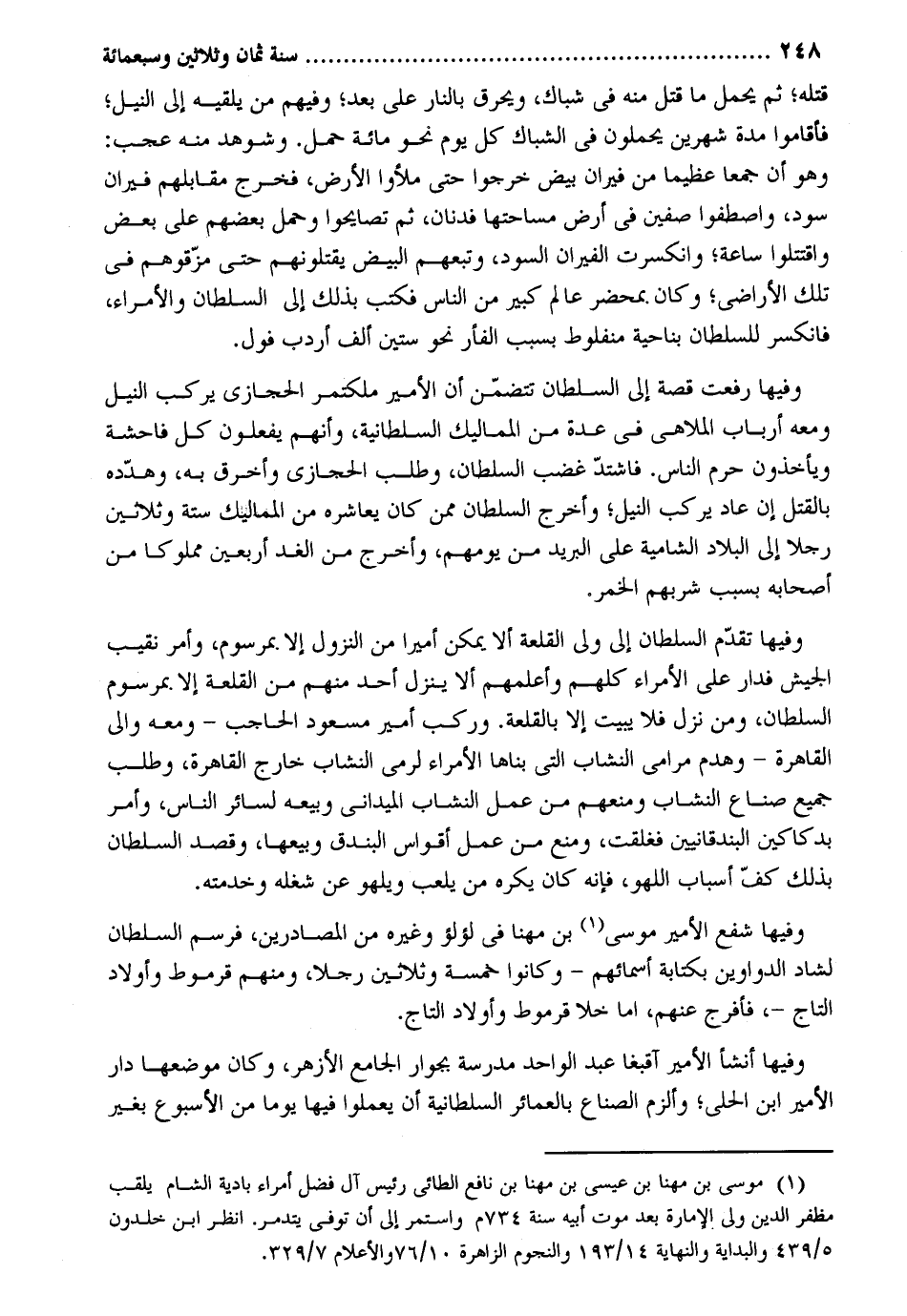 قَتله ثمَّ يحمل مَا قتل مِنْهُ فِي شباك وَيحرق بالنَّار على بعد وَفِيهِمْ من يلقيه إِلَى النّيل فأفاموا مُدَّة شَهْرَيْن يحملون فِي الشباك كل يرم نو مائَة حمل. وشوهد مِنْهُ عجب: وَهُوَ أَن جمعا عَظِيما من فيران بيض خَرجُوا حَتَّى ملاوا الأَرْض فَخرج مقابلهم فيران سود وَاصْطَفُّوا صفّين فِي أَرض مساحتها فدنان ثمَّ تصايحوا وَحمل بَعضهم على بعض واقتتلوا سَاعَة وانكسرت الفيران السود وتبعهم الْبيض يَقْتُلُونَهُمْ حَتَّى مزقوهم فِي تِلْكَ الْأَرَاضِي وَكَانَ بِمحضر عَالم كَبِير من النَّاس فَكتب بذلك إِلَى السُّلْطَان والأمراء فانكسر للسُّلْطَان بِنَاحِيَة منفلوط بِسَبَب الفأر نَحْو سِتِّينَ ألف أردب فول. وفيهَا رفعت قصَّة إِلَى السُّلْطَان تَتَضَمَّن أَن الْأَمِير ملكتمر الْحِجَازِي يركب النّيل وَمَعَهُ أَرْبَاب الملاهي فِي عدَّة من المماليك السُّلْطَانِيَّة وَأَنَّهُمْ يَفْعَلُونَ كل فَاحِشَة وَيَأْخُذُونَ حرم النَّاس. فَاشْتَدَّ غضب السُّلْطَان وَطلب الْحِجَازِي وأخرق بِهِ وهدده بِالْقَتْلِ إِن عَاد يركب النّيل وَأخرج السُّلْطَان مِمَّن كَانَ يعاشره من المماليك سِتَّة وَثَلَاثِينَ رجلا إِلَى الْبِلَاد الشامية على الْبَرِيد من يومهم وَأخرج من الْغَد أَرْبَعِينَ مَمْلُوكا من أَصْحَابه بِسَبَب شربهم الْخمر وفيهَا تقدم السُّلْطَان إِلَى ولي القلعة أَلا يُمكن أَمِيرا من النُّزُول إِلَّا بمرسوم وَأمر نقيب الْجَيْش فدار على الْأُمَرَاء كلهم وأعلمهم أَلا ينزل أحد مِنْهُم من القلعة إِلَّا بمرسوم السُّلْطَان وَمن نزل فَلَا يبيت إِلَّا بالقلعة. وَركب أَمِير مَسْعُود الْحَاجِب - وَمَعَهُ وَالِي الْقَاهِرَة - وَهدم مرامي النشاب الَّتِي بناها الْأُمَرَاء لرمي النشاب خَارج الْقَاهِرَة وَطلب جَمِيع صناع النشاب ومنعهم من عمل النشاب الميداني وَبيعه لسَائِر النَّاس وَأمر بدكاكين البندقانيين فغلقت وَمنع من عمل أقواس البندق وَبَيْعهَا وَقصد السُّلْطَان بذلك كف أَسبَاب اللَّهْو فَإِنَّهُ كَانَ يكره من يلْعَب ويلهو عَن شغله وخدمته. وفيهَا شفع الْأَمِير مُوسَى بن مهنا فِي لُؤْلُؤ وَغَيره من المصادرين فرسم السُّلْطَان لشاد الدَّوَاوِين بِكِتَابَة أسمائهم - وَكَانُوا خَمْسَة وَثَلَاثِينَ رجلا وَمِنْهُم قرموط وَأَوْلَاد التَّاج فأفرج عَنْهُم أما خلا قرموط وَأَوْلَاد التَّاج. وفيهَا أنشأ الْأَمِير أقبغا عبد الْوَاحِد مدرسة بجوار الْجَامِع الْأَزْهَر وَكَانَ موضعهَا دَار الْأَمِير ابْن الْحلِيّ وألزم الصناع بالعمائر السُّلْطَانِيَّة أَن يعملوا فِيهَا يَوْمًا من الْأُسْبُوع بِغَيْر