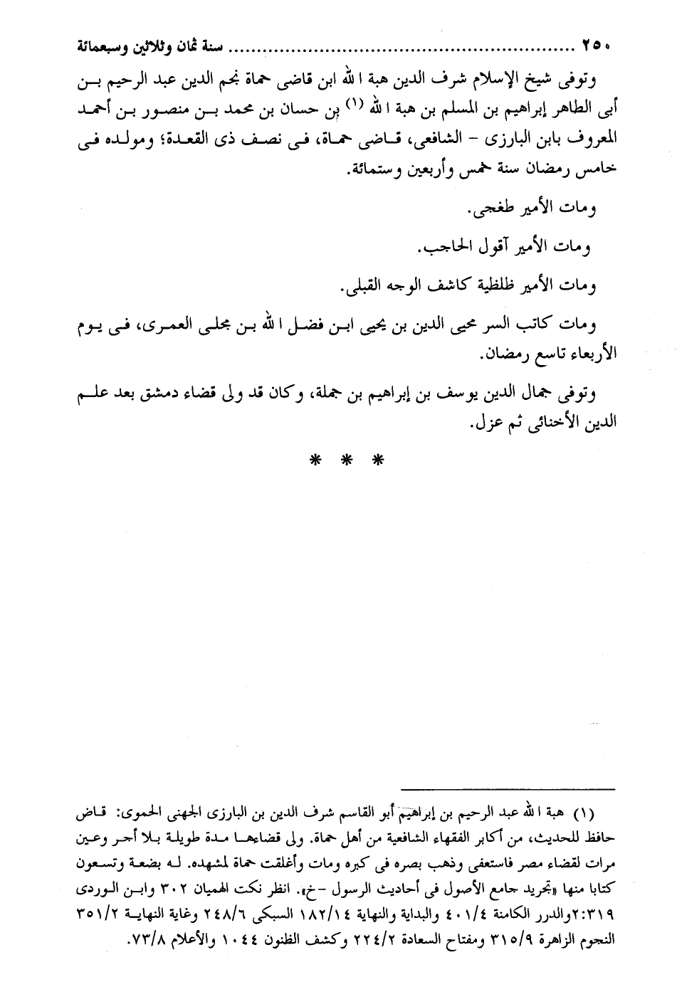 وَتُوفِّي شيخ الْإِسْلَام شرف الدّين هبة الله ابْن قَاضِي حماة نجم الدّين عبد الرَّحِيم بن أبي الطَّاهِر إِبْرَاهِيم بن الْمُسلم بن هبة الله بن حسان بن مُحَمَّد بن مَنْصُور بن أَحْمد الْمَعْرُوف بِابْن الْبَارِزِيّ الشَّافِعِي قَاضِي حماة فِي نصف ذِي الْقعدَة ومولده فِي خَامِس رَمَضَان سنة خمس وَمَات الْأَمِير طغجي. وَمَات الْأَمِير أَقُول الْحَاجِب. وَمَات الْأَمِير ظلظية كاشف الْوَجْه القبلي. وَمَات كَاتب السِّرّ محيي الدّين بن يحيى ابْن فضل الله بن مجلي الْعمريّ فِي يَوْم الْأَرْبَعَاء تَاسِع رَمَضَان. وَتُوفِّي جمال الدّين يُوسُف بن إِبْرَاهِيم بن جملَة وَكَانَ قد ولي قَضَاء دمشق بعد علم الدّين الأخنائي ثمَّ عزل.