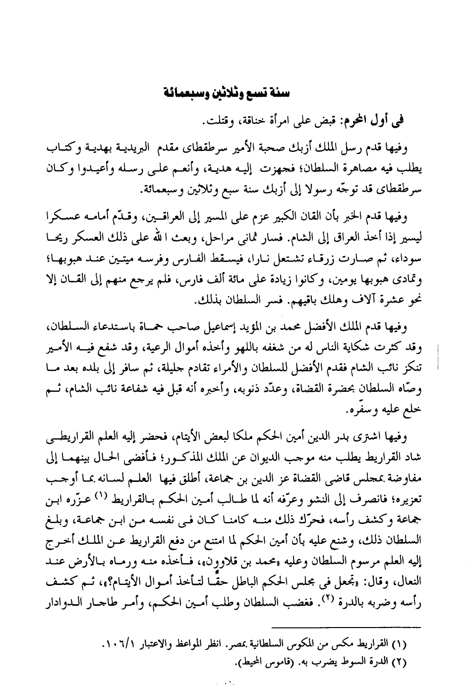 سنة تسع وَثَلَاثِينَ وَسَبْعمائة فِي أول الْمحرم: قبض على امْرَأَة خناقة وَقتلت. وفيهَا قدم رسل الْملك أزبك صُحْبَة الْأَمِير سرطقطاي مقدم البريدية بهدية وَكتاب يطْلب فِيهِ مصاهرة السُّلْطَان فجهزت إِلَيْهِ هَدِيَّة وأنعم على رسله وأعيدوا وَكَانَ سرطقطاي قد توجه رَسُولا إِلَى أزبك سنة سبع وَثَلَاثِينَ وَسَبْعمائة. وفيهَا قدم الْخَبَر بِأَن القان الْكَبِير عزم على الْمسير إِلَى العراقين وَقدم أَمَامه عسكراً ليسير إِذا أَخذ الْعرَاق إِلَى الشَّام. فَسَار ثَمَانِي مراحل وَبعث الله على ذَلِك الْعَسْكَر ريحًا سَوْدَاء ثمَّ صَارَت زرقاء تشتعل نَارا فَيسْقط الْفَارِس وفرسه ميتين عِنْد هبوبها وَتَمَادَى هبوبها يَوْمَيْنِ وَكَانُوا زِيَادَة على مائَة ألف فَارس فَلم يرجع مِنْهُم إِلَى القان إِلَّا نَحْو عشرَة آلَاف وَهلك باقيهم. فسر السُّلْطَان بذلك. وفيهَا قدم الْملك الْأَفْضَل مُحَمَّد بن الْمُؤَيد إِسْمَاعِيل صَاحب حماة باستدعاء السُّلْطَان وَقد كثرت شكاية النَّاس لَهُ من شغفه باللهو وَأَخذه أَمْوَال الرّعية وَقد شفع فِيهِ الْأَمِير تنكز نَائِب الشَّام فَقدم الْأَفْضَل للسُّلْطَان والأمراء تقادم جليلة ثمَّ سَافر إِلَى بَلَده بعد مَا وصاه السُّلْطَان بِحَضْرَة الْقُضَاة وَعدد ذنُوبه وَأخْبرهُ أَنه قبل فِيهِ شَفَاعَة نَائِب الشَّام ثمَّ خلع عَلَيْهِ وسفره. وفيهَا اشْترى بدر الدّين أَمِين الحكم ملكا لبعص الْأَيْتَام فَحَضَرَ إِلَيْهِ الْعلم القراريطي شاد القراريط يطْلب مِنْهُ مُوجب الدِّيوَان عَن الْملك الْمَذْكُور فأفضي الْحَال بَينهمَا إِلَى مُفَاوَضَة. بِمَجْلِس قَاضِي الْقُضَاة عز الدّين بن جمَاعَة أطلق فِيهَا الْعلم لِسَانه بِمَا أوجب تعزيره فَانْصَرف إِلَى النشو وعرفه أَنه لما طَالب أَمِين الحكم بالقراريط عزره ابْن جمَاعَة وكشف رَأسه فحرك ذَلِك مِنْهُ كامناً كَانَ فِي نَفسه من ابْن جمَاعَة وَبلغ السُّلْطَان ذَلِك وشنع عَلَيْهِ بِأَن أَمِين الحكم لما امْتنع من دفع القراريط عَن الْملك أخرج إِلَيْهِ الْعلم مرسوم السُّلْطَان وَعَلِيهِ مُحَمَّد بن قلاوون فَأَخذه مِنْهُ ورماه بِالْأَرْضِ عِنْد النِّعَال وَقَالَ: أَتجْعَلُ فِي مجْلِس الحكم الْبَاطِل حَقًا لتأْخذ أَمْوَال الْأَيْتَام ثمَّ كشف رَأسه وضربه بِالدرةِ. فَغَضب السُّلْطَان وَطلب أَمِين الحكم وَأمر طاجار الدوادار