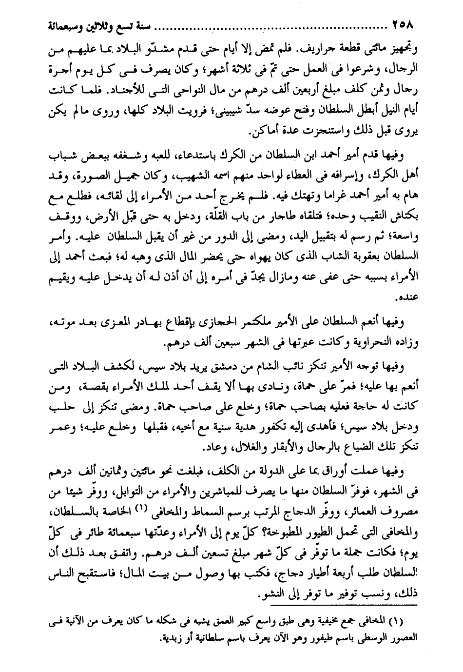 وتجهيز مِائَتي قِطْعَة جراريف. فَلم تمض إِلَّا أَيَّام حَتَّى قدم مشدو الْبِلَاد بِمَا عَلَيْهِم من الرِّجَال وشرعوا فِي الْعَمَل حَتَّى تمّ فِي ثَلَاثَة أشهر وَكَانَ يصرف فِي كل يَوْم أُجْرَة رجال وَثمن كلف مبلغ أَرْبَعِينَ ألف دِرْهَم من مَال النواحي الَّتِي للأجناد. فَلَمَّا كَانَت أَيَّام النّيل أبطل السُّلْطَان وَفتح عوضه سد شيبيني فرويت الْبِلَاد كلهَا وَرُوِيَ مَا لم يكن يرْوى قبل ذَلِك واستنجزت عدَّة أَمَاكِن. وفيهَا قدم أَمِير أَحْمد ابْن السُّلْطَان من الكرك باستدعاء للعبه وشغفه بِبَعْض شباب أهل الكرك وإسرافه فِي الْعَطاء لوَاحِد مِنْهُم اسْمه الشهيب وَكَانَ جميل الصُّورَة وَقد هام بِهِ أَمِير أَحْمد غراماً وتهتك فِيهِ. فَلم يخرج أحد من الْأُمَرَاء إِلَى لِقَائِه فطلع مَعَ بكتاش النَّقِيب وَحده فَتَلقاهُ طاجار من بَاب الْقلَّة وَدخل بِهِ حَتَّى قبل الأَرْض ووقف وَاسِعَة ثمَّ رسم لَهُ بتقبيل الْيَد وَمضى إِلَى الدّور من غير أَن يقبل السُّلْطَان عَلَيْهِ. وَأمر السُّلْطَان بعقوبة الشَّاب الَّذِي كَانَ يهواه حَتَّى يحضر المَال الَّذِي وهبه لَهُ فَبعث أَحْمد إِلَى الْأُمَرَاء بِسَبَبِهِ حَتَّى عفى عَنهُ ومازال يجد فِي أمره إِلَى أَن أذن لَهُ أَن يدْخل عَلَيْهِ وَيُقِيم عِنْده. وفيهَا أنعم السُّلْطَان على الْأَمِير ملكتمر الْحِجَازِي بإقطاع بهادر المعزي بعد مَوته وزاده النحراوية وَكَانَت عبرتها فِي الشَّهْر سبعين ألف دِرْهَم. وفيهَا توجه الْأَمِير تنكز نَائِب الشَّام من دمشق يُرِيد بِلَاد سيس لكشف الْبِلَاد الَّتِي أنعم بهَا عَلَيْهِ فَمر على حماة ونادى بهَا أَلا يقف أحد لملك الْأُمَرَاء بِقصَّة وَمن كَانَت لَهُ حَاجَة فَعَلَيهِ بِصَاحِب حماة وخلع على صَاحب حماة. وَمضى تنكز إِلَى حلب وَدخل بِلَاد سيس فأهدى إِلَيْهِ تكفور هَدِيَّة سنية مَعَ أَخِيه فقبلها وخلع عَلَيْهِ وَعمر تنكز تِلْكَ الضّيَاع بِالرِّجَالِ والأبقار والغلال وَعَاد. وفيهَا عملت أوراق بِمَا على الدولة من الكلف فبلغت نَحْو مِائَتَيْنِ وَثَمَانِينَ ألف دِرْهَم فِي الشَّهْر فوفر السُّلْطَان مِنْهَا مَا يصرف للمباشرين والأمراء من التوابل ووفر شَيْئا من مَصْرُوف العمائر ووفر الدَّجَاج الْمُرَتّب برسم السماط والمخافي الْخَاصَّة بالسلطان والمخافي الَّتِي تحمل الطُّيُور المطبوخة كل يَوْم إِلَى الْأُمَرَاء وعدتها سَبْعمِائة طَائِر فِي كل يَوْم فَكَانَت جملَة مَا توفر فِي كل شهر مبلغ تسعين ألف دِرْهَم. وَاتفقَ بعد ذَلِك أَن السُّلْطَان طلب أَرْبَعَة أطيار دَجَاج فَكتب بهَا وُصُول من بَيت المَال فاستقبح النَّاس ذَلِك وَنسب توفير مَا توفر إِلَى النشو.