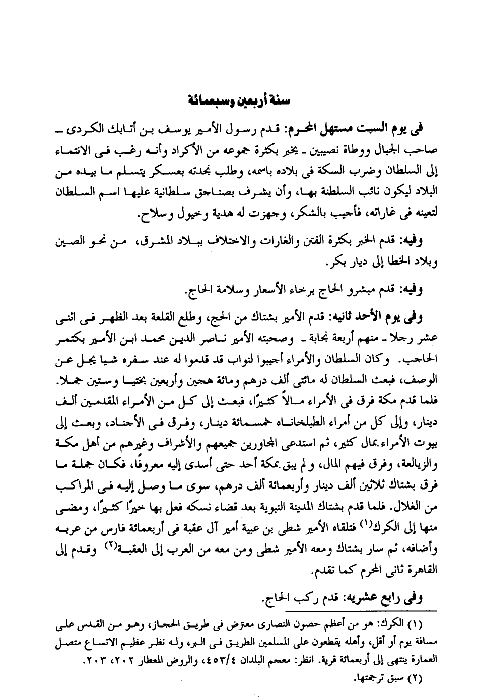 فِي يَوْم السبت مستهل الْمحرم: قدم رَسُول الْأَمِير يُوسُف بن أتابك الْكرْدِي صَاحب الْجبَال ووطاة نَصِيبين يخبر بِكَثْرَة جموعه من الأكراد وَأَنه رغب فِي الانتماء إِلَى السُّلْطَان وَضرب السِّكَّة فِي بِلَاده باسمه وَطلب نجدته بعسكر يتسلم مَا بِيَدِهِ من الْبِلَاد ليَكُون نَائِب السلطنة بهَا وَأَن يشرف بصناجق سلطانية عَلَيْهَا اسْم السُّلْطَان لتعينه فِي غاراته فأحيب بالشكر وجهزت لَهُ هَدِيَّة وخيول وَسلَاح. وَفِيه: قدم الْخَبَر بِكَثْرَة الْفِتَن والغارات وَالِاخْتِلَاف بِبِلَاد الْمشرق من نَحْو الصين وبلاد الخطا إِلَى ديار بكر. وَفِيه: قدم مبشرو الْحَاج برخاء الأسعار وسلامة الْحَاج. وَفِي يَوْم الْأَحَد ثَانِيه: قدم الْأَمِير بشتاك من الْحَج وطلع القلعة بعد الظّهْر فِي اثْنَي عشر رجلا مِنْهُم أَرْبَعَة نجابة وصحبته الْأَمِير نَاصِر الدّين مُحَمَّد ابْن الْأَمِير بكتمر الْحَاجِب. وَكَانَ السُّلْطَان والأمراء أجِيبُوا لنواب قد قدمُوا لَهُ عِنْد سَفَره شَيْئا يجل عَن الْوَصْف فَبعث السُّلْطَان لَهُ مِائَتي ألف دِرْهَم وَمِائَة هجين وَأَرْبَعين بختياً وَسِتِّينَ جملا. فَلَمَّا قدم مَكَّة فرق فِي الْأُمَرَاء مَالا كثيرا فَبعث إِلَى كل من الْأُمَرَاء المقدمين ألف دِينَار وَإِلَى كل من أُمَرَاء الطبلخاناه خَمْسمِائَة دِينَار وَفرق فِي الأجناد وَبعث إِلَى بيُوت الْأُمَرَاء بِمَال كثير ثمَّ استدعى المجاورين جَمِيعهم والأشراف وَغَيرهم من أهل مَكَّة والزيالعة وَفرق فيهم المَال وَلم يبْق بِمَكَّة أحد حَتَّى أسدى إِلَيْهِ مَعْرُوفا فَكَانَ جملَة مَا فرق بشتاك ثَلَاثِينَ ألف دِينَار وَأَرْبَعمِائَة ألف دِرْهَم سوى مَا وصل إِلَيْهِ فِي المراكب من الغلال. فَلَمَّا قدم بشتاك الْمَدِينَة النَّبَوِيَّة بعد قَضَاء نُسكه فعل بهَا خيرا كثيرا وَمضى مِنْهَا إِلَى الكرك فَتَلقاهُ الْأَمِير شطى بن عبِّيَّة أَمِير آل عقبَة فِي أَرْبَعمِائَة فَارس من عربه وأضافه ثمَّ سَار بشتاك وَمَعَهُ الْأَمِير شطى وَمن مَعَه من الْعَرَب إِلَى الْعقبَة وَقدم إِلَى الْقَاهِرَة ثَانِي الْمحرم كَمَا تقدم. وَفِي رَابِع عشريه: قدم ركب الْحَاج.