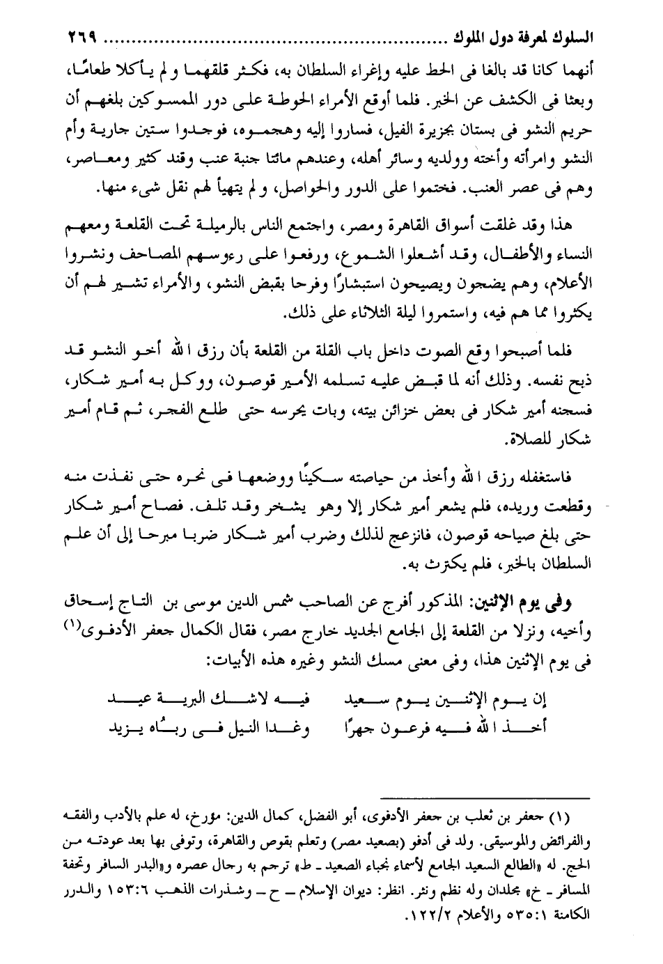 أَنَّهُمَا كَانَا قد بَالغا فِي الْحَط عَلَيْهِ وإغراء السُّلْطَان بِهِ فَكثر قلقهما وَلم يأكلا طَعَاما وبعثا فِي الْكَشْف عَن الْخَبَر. فَلَمَّا أوقع الْأُمَرَاء الحوطة على دور الممسوكين بَلغهُمْ أَن حَرِيم النشو فِي بُسْتَان بِجَزِيرَة الْفِيل فَسَارُوا إِلَيْهِ وهجموه فوجدوا سِتِّينَ جَارِيَة وَأم النشو وَامْرَأَته وَأُخْته وولديه وَسَائِر أَهله وَعِنْدهم مِائَتَا جنبة عِنَب وقند كثير ومعاصر وهم فِي عصر الْعِنَب. فختموا على الدّور والحواصل وَلم يتهيأ لَهُم نقل شَيْء مِنْهَا. هَذَا وَقد غلقت أسواق الْقَاهِرَة ومصر وَاجْتمعَ النَّاس بالرميلة تَحت القلعة وَمَعَهُمْ النِّسَاء والأطفال وَقد أشعلوا الشموع ورفمعوا على رُءُوسهم الْمَصَاحِف ونشروا الْأَعْلَام وهم يضجون ويصيحولن استبشاراً وفرحاً بِقَبض النشو والأمراء تُشِير لَهُم أَن يكثروا مِمَّا هم فِيهِ واستمروا لَيْلَة الثُّلَاثَاء على ذَلِك. فَلَمَّا أَصْبحُوا وَقع الصَّوْت دَاخل بَاب الْقلَّة من القلعة بِأَن رزق الله أَخُو النشو قد ذبح نَفسه. وَذَلِكَ أَنه لما قبض عَلَيْهِ تسلمه الْأَمِير قوصون ووكل بِهِ أَمِير شكار فسجنه أَمِير شكار فِي بعض خَزَائِن بَيته وَبَات يَحْرُسهُ حَتَّى طلع الْفجْر ثمَّ قَامَ أَمِير شكار للصَّلَاة. فاستغفله رزق الله وَأخذ من حياصته سكيناً ووضعها فِي نَحره حَتَّى نفذت مِنْهُ وَقطعت وريده فَلم يشْعر أَمِير شكار إِلَّا وَهُوَ يشخر وَقد تلف. فصاح أَمِير شكار حَتَّى بلغ صياحه قوصون فانزعج لذَلِك وَضرب أَمِير شكار ضربا مبرحاً إِلَى أَن علم السُّلْطَان بالْخبر فَلم يكترث بِهِ. وَفِي يَوْم الْإِثْنَيْنِ: الْمَذْكُور أفرج عَن الصاحب شمس الدّين مُوسَى بن التَّاج إِسْحَاق وأخيه وَنزلا من القلعة إِلَى الْجَامِع الْجَدِيد خَارج مصر فَقَالَ الْكَمَال جَعْفَر الأدفوي فِي يَوْم الْإِثْنَيْنِ هَذَا وَفِي معنى مسك النشو وَغَيره هَذِه الأبيات: إِن يَوْم الْإِثْنَيْنِ يَوْم سعيد فِيهِ لاشك الْبَريَّة عيد أَخذ الله فِيهِ فِرْعَوْن جَهرا وَغدا النّيل فِي رباه يزِيد