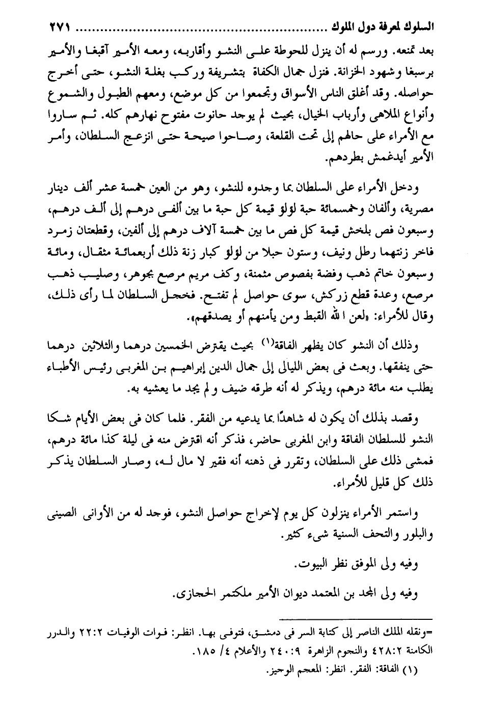 بعد تَمنعهُ. ورسم لَهُ أَن ينزل للحوطة على النشو وأقاربه وَمَعَهُ الْأَمِير آقبغا والأمير برسبغا وشهود الخزانة. فَنزل جمال الكفاة بتشريفة وَركب بغلة النشو حَتَّى أخرج حواصله. وَقد أغلق النَّاس الْأَسْوَاق وتجمعوا من كل موصع وَمَعَهُمْ الطبول والشموع وأنواع الملاهي وأرباب الخيال بِحَيْثُ لم يُوجد حَانُوت مَفْتُوح نهارهم كُله. ثمَّ سَارُوا مَعَ الْأُمَرَاء على حَالهم إِلَى تَحت القلعة وصاحوا صَيْحَة حَتَّى انزعج وَدخل الْأُمَرَاء على السُّلْطَان بِمَا وجدوه للنشو وَهُوَ من الْعين خَمْسَة عشر ألف دِينَار مصرية والفان وَخَمْسمِائة حَبَّة لُؤْلُؤ قيمَة كل حَبَّة مَا بَين ألفي دِرْهَم إِلَى ألف دِرْهَم وَسَبْعُونَ فص بلخش قيمَة كل فص مَا بَين خَمْسَة أُلَّاف دِرْهَم إِلَى أَلفَيْنِ وقطعتان زمرد فاخر زنتهما رَطْل ونيف وَسِتُّونَ حبلاً من لُؤْلُؤ كبار زنة ذَلِك أَرْبَعمِائَة مِثْقَال وَمِائَة وَسَبْعُونَ خَاتم ذهب وَفِضة بفصوص مثمنة وكف مَرْيَم مرصع بجوهر وصليب ذهب مرصع وعدة قطع زركش سوى حواصل لم تفتح. فَخَجِلَ السُّلْطَان لما رأى ذَلِك وَقَالَ لِلْأُمَرَاءِ: لعن الله القبط وَمن يأمنهم أَو يُصدقهُمْ. وَذَلِكَ أَن النشو كَانَ يظْهر الْفَاقَة بِحَيْثُ يقترض الْخمسين درهما وَالثَّلَاثِينَ درهما حَتَّى ينفقها. وَبعث فِي بعض اللَّيَالِي إِلَى جمال الدّين إِبْرَاهِيم بن المغربي رَئِيس الْأَطِبَّاء يطْلب مِنْهُ مائَة دِرْهَم وَيذكر لَهُ أَنه طرقه ضيف وَلم يجد مَا يعشيه بِهِ. وَقصد بذلك أَن يكون لَهُ شَاهدا بِمَا يَدعِيهِ من الْفقر. فَلَمَّا كَانَ فِي بعض الْأَيَّام شكا النشو للسُّلْطَان الْفَاقَة وَابْن المغربي حَاضر فَذكر أَنه اقترص مِنْهُ فِي لَيْلَة كَذَا مائَة دِرْهَم فَمشى ذَلِك على السُّلْطَان وتقرر فِي ذهنه أَنه فَقير لَا مَال لَهُ وَصَارَ السُّلْطَان يذكر ذَلِك كل قَلِيل لِلْأُمَرَاءِ. وَاسْتمرّ الْأُمَرَاء ينزلون كل يَوْم لإِخْرَاج حواصل النشو فَوجدَ لَهُ من الْأَوَانِي الصيني والبلور وَفِيه ولي الْمُوفق نظر الْبيُوت. وَفِيه ولي الْمجد بن الْمُعْتَمد ديوَان الْأَمِير ملكتمر الْحِجَازِي.