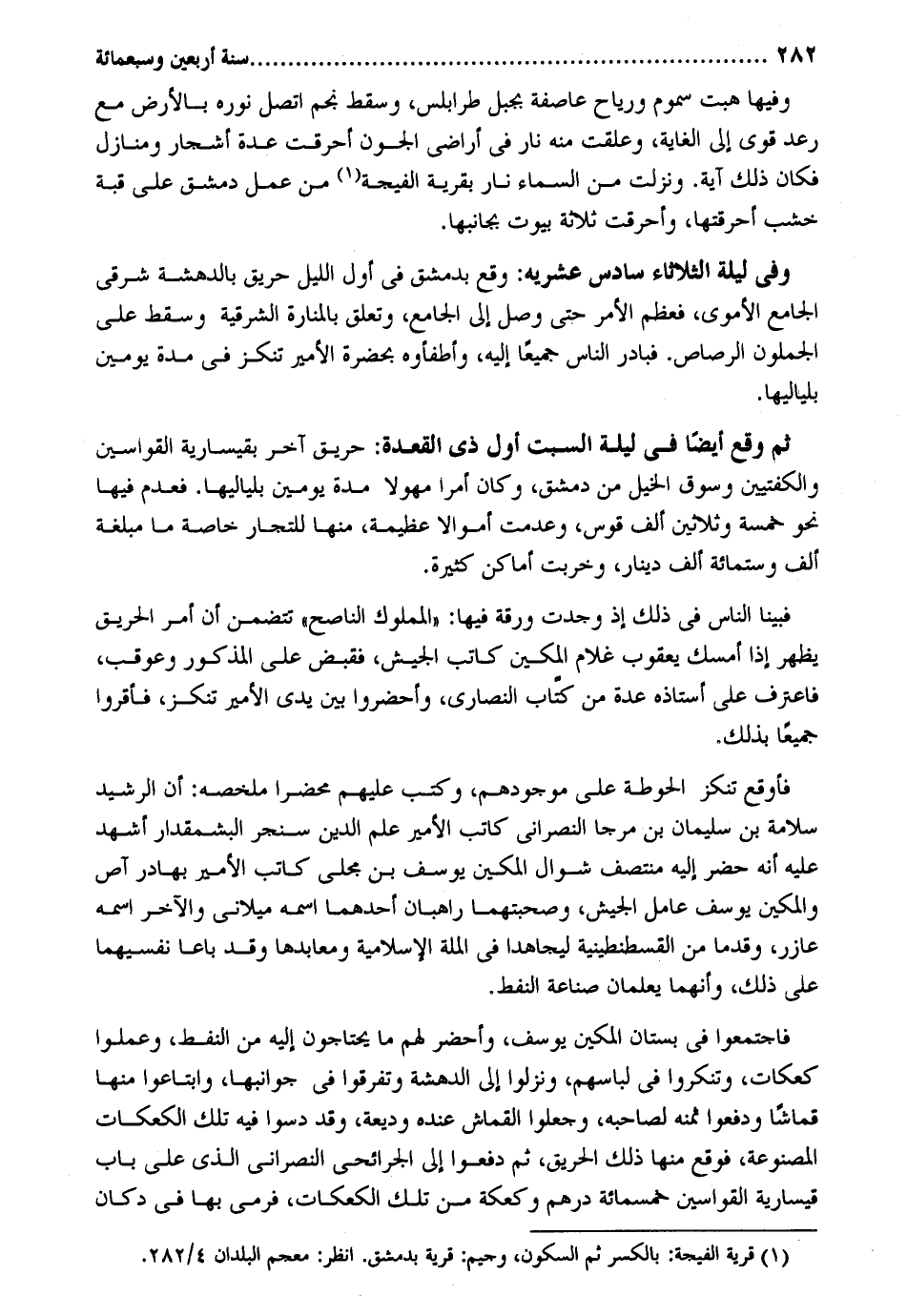 وفيهَا هبت سموم ورياح عَاصِفَة بجبل طرابلس وَسقط نجم اتَّصل نوره بِالْأَرْضِ مَعَ رعد قوي إِلَى الْغَايَة وعلقت مِنْهُ نَار فِي أَرَاضِي الجون أحرقت عدَّة أَشجَار ومنازل فَكَانَ ذَلِك آيَة. وَنزلت من السَّمَاء نَار بقرية الفيجة من عمل دمشق على قبَّة خشب أحرقتها وأحرقت ثَلَاثَة بيُوت بجانبها. وَفِي لَيْلَة الثُّلَاثَاء سادس عشريه: وَقع بِدِمَشْق فِي أول اللَّيْل حريق بالدهشة شَرْقي الْجَامِع الْأمَوِي فَعظم الْأَمر حَتَّى وصل إِلَى الْجَامِع وَتعلق بالمنارة الشرقية وَسقط على الجملون الرصاص. فبادر النَّاس جَمِيعًا إِلَيْهِ وأطفأوه بِحَضْرَة الْأَمِير تنكز فِي مُدَّة يَوْمَيْنِ بلياليها. ثمَّ وَقع أَيْضا فِي لَيْلَة السبت أول ذِي الْقعدَة: حريق أخر بقيسارية القواسين والكفتيين وسوق الْخَيل من دمشق وَكَانَ أمرا مهولاً مُدَّة يَوْمَيْنِ بلياليها. فَعدم فِيهَا نَحْو خَمْسَة وَثَلَاثِينَ ألف قَوس وعدمت أَمْوَالًا عَظِيمَة مِنْهَا للتجار خَاصَّة مَا مبلغة ألف وسِتمِائَة ألف دِينَار وَخَربَتْ أَمَاكِن كَثِيرَة. فَبينا النَّاس فِي ذَلِك إِذْ وجدت ورقة فِيهَا: الْمَمْلُوك الناصح تَتَضَمَّن أَن أَمر الْحَرِيق يظْهر إِذا أمسك يَعْقُوب غُلَام المكين كَاتب الْجَيْش فَقبض على الْمَذْكُور وعوقب فاعترف على أستاذه عدَّة من كتاب النَّصَارَى وأحضروا بَين يَدي الْأَمِير تنكز فأقروا جَمِيعًا بذلك. فأوقع تنكز الحوطة على موجودهم وَكتب عَلَيْهِم محضراً ملخصه: أَن الرشيد سَلامَة بن سُلَيْمَان بن مرجا النَّصْرَانِي كَاتب الْأَمِير علم الدّين سنجر البشمقدار أشهد عَلَيْهِ أَنه حضر إِلَيْهِ منتصف شَوَّال المكين يُوسُف بن مجلي كَاتب الْأَمِير بهادر آص والمكين يُوسُف عَامل الْجَيْش وصحبتهما راهبان أَحدهمَا اسْمه ميلاني وَالْآخر اسْمه عازر وفدما من الْقُسْطَنْطِينِيَّة ليجاهدا فِي الْملَّة الإسلامية ومعابدها وَقد باعا نفسيهما على ذَلِك وأنهما يعلمَانِ صناعَة النفط. فَاجْتمعُوا فِي بُسْتَان المكين يُوسُف وأحضر لَهُم مَا يَحْتَاجُونَ إِلَيْهِ من النفط وَعمِلُوا كعكات وتنكروا فِي لباسهم ونزلوا إِلَى الدهشة وَتَفَرَّقُوا فِي جوانبها وابتاعوا مِنْهَا قماشاً ودفعوا ثمنه لصَاحبه وَجعلُوا القماش عِنْده وَدِيعَة وَقد دسوا فِيهِ تِلْكَ الكعكات المصنوعة فَوَقع مِنْهَا ذَلِك الْحَرِيق ثمَّ دفعُوا إِلَى الجرائحي النَّصْرَانِي الَّذِي على بَاب قيسارية القواسين خَمْسمِائَة دِرْهَم وكعكة من تِلْكَ الكعكات فَرمي بهَا فِي دكان