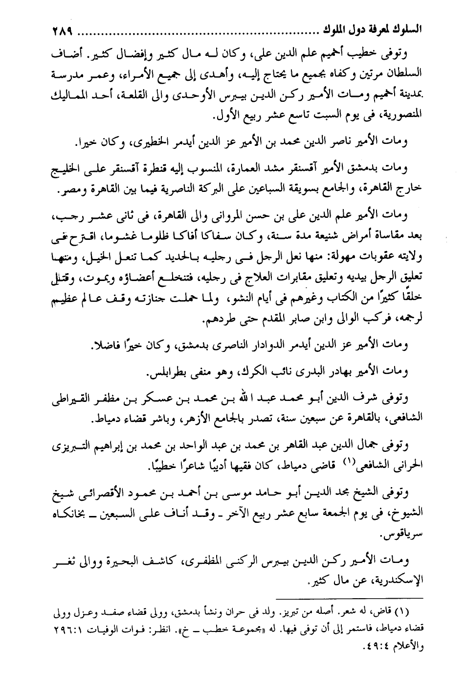 وَتُوفِّي خطيب أحميم علم الدّين عَليّ وَكَانَ لَهُ مَال كثير وإفضال كثير. أضَاف السُّلْطَان مرَّتَيْنِ وَكَفاهُ بِجَمِيعِ مَا يحْتَاج إِلَيْهِ وَأهْدى إِلَى جَمِيع الْأُمَرَاء وَعمر مدرسة بِمَدِينَة أحميم وَمَات الْأَمِير ركن الدّين بيبرس الأوحدي وَالِي القلعة أحد المماليك المنصورية فِي يَوْم السبت تَاسِع عشر ربيع الأول. وَمَات الْأَمِير نَاصِر الدّين مُحَمَّد بن الْأَمِير عز الدّين أيدمر الخطيري وَكَانَ خيرا. وَمَات بِدِمَشْق الْأَمِير آقسنقر مشد الْعِمَارَة الْمَنْسُوب إِلَيْهِ قنطرة آقسنقر على الخليج خَارج الْقَاهِرَة وَالْجَامِع بسويقة السباعين على الْبركَة الناصرية فِيمَا بَين الْقَاهِرَة ومصر وَمَات الْأَمِير علم الدّين عَليّ بن حسن المرواني وَالِي الْقَاهِرَة فِي ثَانِي عشر رَجَب بعد مقاساة أمراض شنيعة مُدَّة سنة وَكَانَ سفاكاً أفاكاً ظلوماً غشوماً اقترح فِي ولَايَته عقوبات مهولة: مِنْهَا نعل الرجل فِي رجلَيْهِ بالحديد كَمَا تنعل الْخَيل وَمِنْهَا تَعْلِيق الرجل بيدَيْهِ وَتَعْلِيق مقابرات العلاج فِي رجلَيْهِ فتنخلع أعضاؤه وَيَمُوت وَقتل خلقا كثيرا من الْكتاب وَغَيرهم فِي أَيَّام النشو وَلما حملت جنَازَته وقف عَالم عَظِيم لرجمه فَركب الْوَالِي وَابْن صابر الْمُقدم حَتَّى طردهم. وَمَات الْأَمِير بهادر البدري نَائِب الكرك وَهُوَ منفي بطرابلس. وَتُوفِّي شرف الدّين أَبُو مُحَمَّد عبد الله بن مُحَمَّد بن عَسْكَر بن مظفر القيراطي الشَّافِعِي بِالْقَاهِرَةِ عَن سبعين سنة تصدر بالجامع الْأَزْهَر وباشر قَضَاء دمياط. وَتُوفِّي جمال الدّين عبد القاهر بن مُحَمَّد بن عبد الْوَاحِد بن مُحَمَّد بن إِبْرَاهِيم التبريزي الْحَرَّانِي الشَّافِعِي قَاضِي دمياط كَانَ فَقِيها أديباً شَاعِرًا خَطِيبًا. وَتُوفِّي الشَّيْخ مجد الدّين أَبُو حَامِد مُوسَى بن أَحْمد بن مَحْمُود الأقصرائي شيخ الشُّيُوخ فِي يَوْم الْجُمُعَة سَابِع عشر ربيع الآخر وَقد أناف على السّبْعين بخانكاه سرياقوس. وَمَات الْأَمِير ركن الدّين بيبرس الركني المظفري كاشف الْبحيرَة ووالي ثغر الْإسْكَنْدَريَّة عَن مَال كثير.