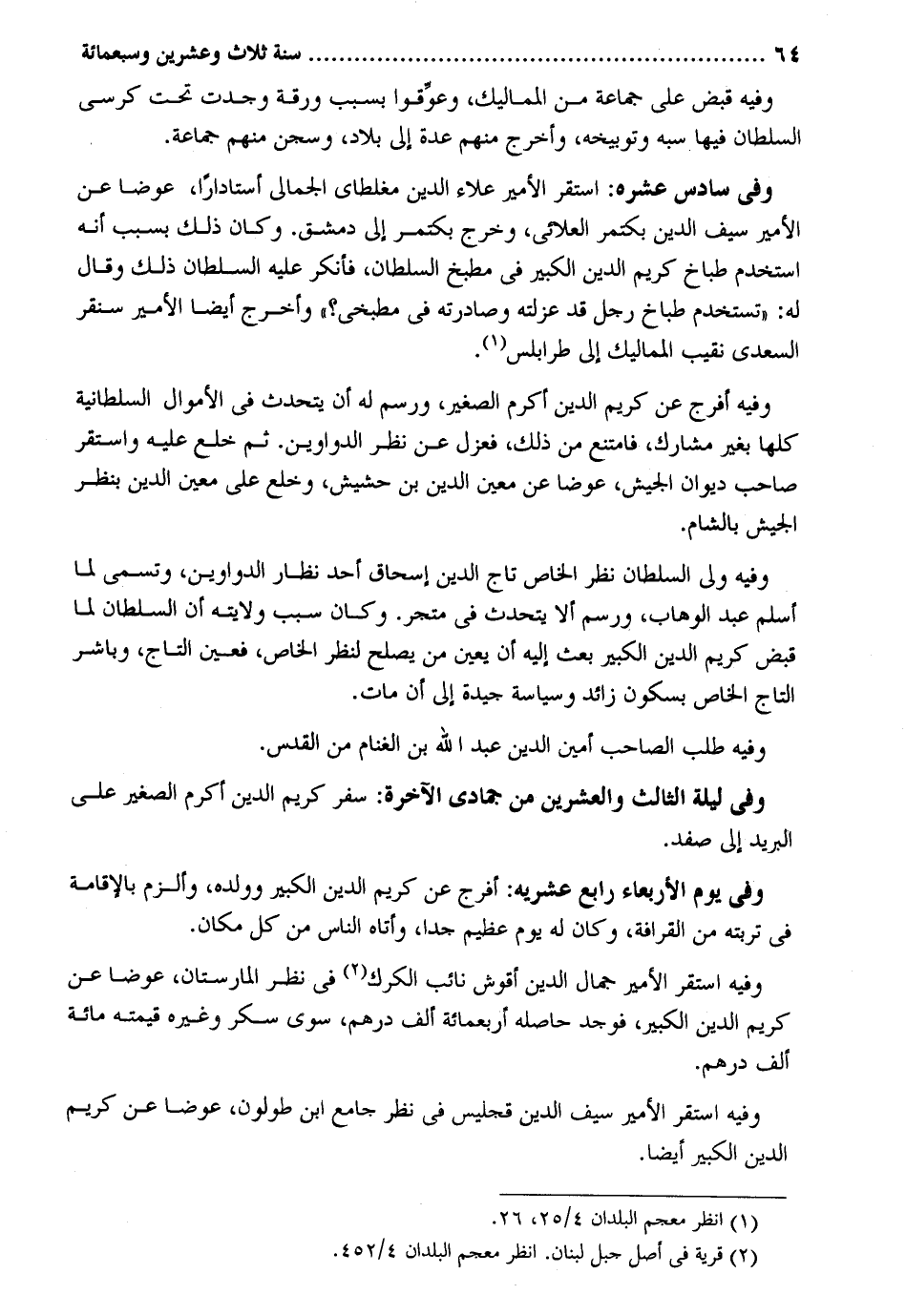 وَفِيه قبض على جمَاعَة من المماليك وعوقوا بِسَبَب ورقة وجدت تَحت كرْسِي السُّلْطَان فِيهَا سبه وتوبيخه وَأخرج مِنْهُم عدَّة إِلَى بِلَاد وسجن مِنْهُم جمَاعَة. وَفِي سادس عشره: اسْتَقر الْأَمِير عَلَاء الدّين مغلطاي الجمالي أستاداراً عوضا عَن الْأَمِير سيف الدّين بكتمر العلائي وَخرج بكتمر إِلَى دمشق. وَكَانَ ذَلِك بِسَبَب أَنه استخدم طباخ كريم الدّين الْكَبِير فِي مطبخ السُّلْطَان فَأنْكر عَلَيْهِ السُّلْطَان ذَلِك وَقَالَ لَهُ: تستخدم طباخ رجل قد عزلته وصادرته فِي مطبخي وَأخرج أَيْضا الْأَمِير سنقر السَّعْدِيّ نقيب المماليك إِلَى طرابلس. وَفِيه أفرج عَن كريم الدّين أكْرم الصَّغِير ورسم لَهُ أَن يتحدث فِي الْأَمْوَال السُّلْطَانِيَّة كلهَا بِغَيْر مشارك فَامْتنعَ من ذَلِك فعزل عَن نظر الدَّوَاوِين. ثمَّ خلع عَلَيْهِ وَاسْتقر صَاحب ديوَان الْجَيْش عوضا عَن معِين الدّين بن حشيش وخلع على معِين الدّين بِنَظَر الْجَيْش بِالشَّام. وَفِيه ولى السُّلْطَان نظر الْخَاص تَاج الدّين اسحاق أحد نظار الدَّوَاوِين وَتسَمى لما أسلم عبد الْوَهَّاب ورسم أَلا يتحدث فِي متجر. وَكَانَ سَبَب ولَايَته أَن السُّلْطَان لما قبض كريم الدّين الْكَبِير بعث إِلَيْهِ أَن يعين من يصلح لنظر الْخَاص فعين التَّاج وباشر التَّاج الْخَاص بِسُكُون زَائِد وسياسة جَيِّدَة إِلَى أَن مَاتَ. وَفِيه طلب الصاحب أَمِين الدّين عبد الله بن الغنام من الْقُدس. وَفِي لَيْلَة الثَّالِث وَالْعِشْرين من جُمَادَى الْآخِرَة: سفر كريم الدّين أكْرم الصَّغِير على الْبَرِيد إِلَى صفد. وَفِي يَوْم الْأَرْبَعَاء رَابِع عشريه: أفرج عَن كريم الدّين الْكَبِير وَولده وألزم بِالْإِقَامَةِ فِي تربته من القرافة وَكَانَ لَهُ يَوْم عَظِيم جدا وَأَتَاهُ النَّاس من كل مَكَان. وَفِيه اسْتَقر الْأَمِير جمال الدّين أقوش نَائِب الكرك فِي نظر المارستان عوضا عَن كريم الدّين الْكَبِير فَوجدَ حَاصله أَرْبَعمِائَة ألف دِرْهَم سوي سكر وَغَيره قِيمَته مائَة ألف دِرْهَم. وَفِيه اسْتَقر الْأَمِير سيف الدّين قجليس فِي نظر جَامع ابْن طولون عوضا عَن كريم الدّين الْكَبِير أَيْضا.