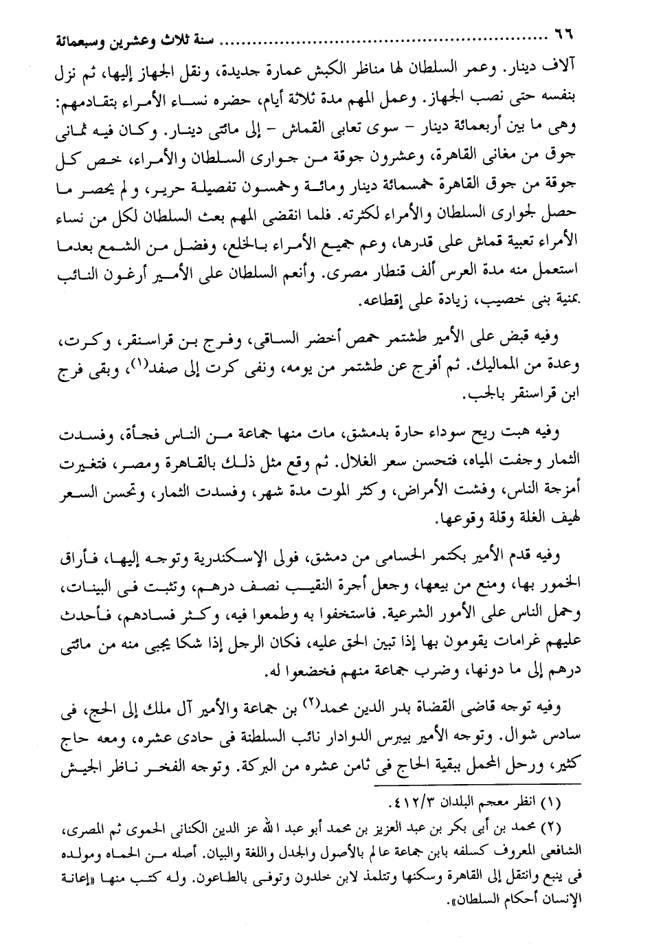 أُلَّاف دِينَار. وَعمر السُّلْطَان لَهَا مناظر الْكَبْش عمَارَة جَدِيدَة وَنقل الجهاز إِلَيْهَا ثمَّ نزل بِنَفسِهِ حَتَّى نصب الجهاز. وَعمل المهم مُدَّة ثَلَاثَة أَيَّام حَضَره نسَاء الْأُمَرَاء بتقادمهم: وَهِي مَا بَين أَرْبَعمِائَة دِينَار سوى تعابي القماش إِلَى مِائَتي دِينَار. وَكَانَ فِيهِ ثَمَانِي جوق من مغاني الْقَاهِرَة وَعِشْرُونَ جوقة من جواري السُّلْطَان والأمراء خص كل جوقة من جَوف الْقَاهِرَة خَمْسمِائَة دِينَار وَمِائَة وَخَمْسُونَ تفصيلة حَرِير وَلم يحصو مَا حصل لجواري السُّلْطَان والأمراء لكثرته. فَلَمَّا انْقَضى المهم بعث السُّلْطَان لكل من نسَاء الْأُمَرَاء تعبية قماش على قدرهَا وَعم جَمِيع الْأُمَرَاء بِالْخلْعِ وَفضل من الشممع بَعْدَمَا اسْتعْمل مِنْهُ مُدَّة الْعرس ألف قِنْطَار مصري. وأنعم السُّلْطَان على الْأَمِير أرغون النَّائِب بمنية بني خصيب زِيَادَة على إقطاعه. وَفِيه قبض على الْأَمِير طشتمر حمص أَخْضَر الساقي وَفرج بن قراسنقر وكرت وعدة من المماليك. ثمَّ أفرج عَن طشتمر من يَوْمه وَنفي كرت إِلَى صفد وَبَقِي فرج ابْن قراسنقر بالجب. وَفِيه هبت ريح سَوْدَاء حارة بِدِمَشْق مَاتَ مِنْهَا جمَاعَة من النَّاس فَجْأَة وفسدت الثِّمَار وجفت الْمِيَاه فتحسن سعر الغلال. ثمَّ وَقع مثل ذَلِك بِالْقَاهِرَةِ ومصر فتغيرت أمزجة النَّاس وفشت الْأَمْرَاض وَكثر الْمَوْت مُدَّة شهر وفسدت الثِّمَار وتحسن السّعر لهيف الْغلَّة وَقلة وُقُوعهَا. وَفِيه قدم الْأَمِير بكتمر الحسامي من دمشق فولي الْإسْكَنْدَريَّة وَتوجه إِلَيْهَا فأراق الْخُمُور بهَا وَمنع من بيعهَا وَجعل أُجْرَة النَّقِيب نصف دِرْهَم وَتثبت فِي الْبَينَات وَحمل النَّاس على الْأُمُور الشَّرْعِيَّة. فاستخفوا بِهِ وطمعوا فِيهِ وَكثر فسادهم فأحدث عَلَيْهِم غرامات يقومُونَ بهَا إِذا تبين الْحق عَلَيْهِ فَكَانَ الرجل إِذا شكا يجبى مِنْهُ من مِائَتي دِرْهَم إِلَى مَا دونهَا وَضرب جمَاعَة مِنْهُم وَفِيه توجه قَاضِي الْقُضَاة بدر الدّين مُحَمَّد بن جمَاعَة والأمير آل ملك إِلَى الْحَج فِي سادس شَوَّال. وَتوجه الْأَمِير بيبرس الدوادار نَائِب السلطنة فِي حادي عشره وَمَعَهُ حَاج كثير ورحل الْمحمل بِبَقِيَّة الْحَاج فِي ثامن عشره من الْبركَة. وَتوجه الْفَخر نَاظر الْجَيْش