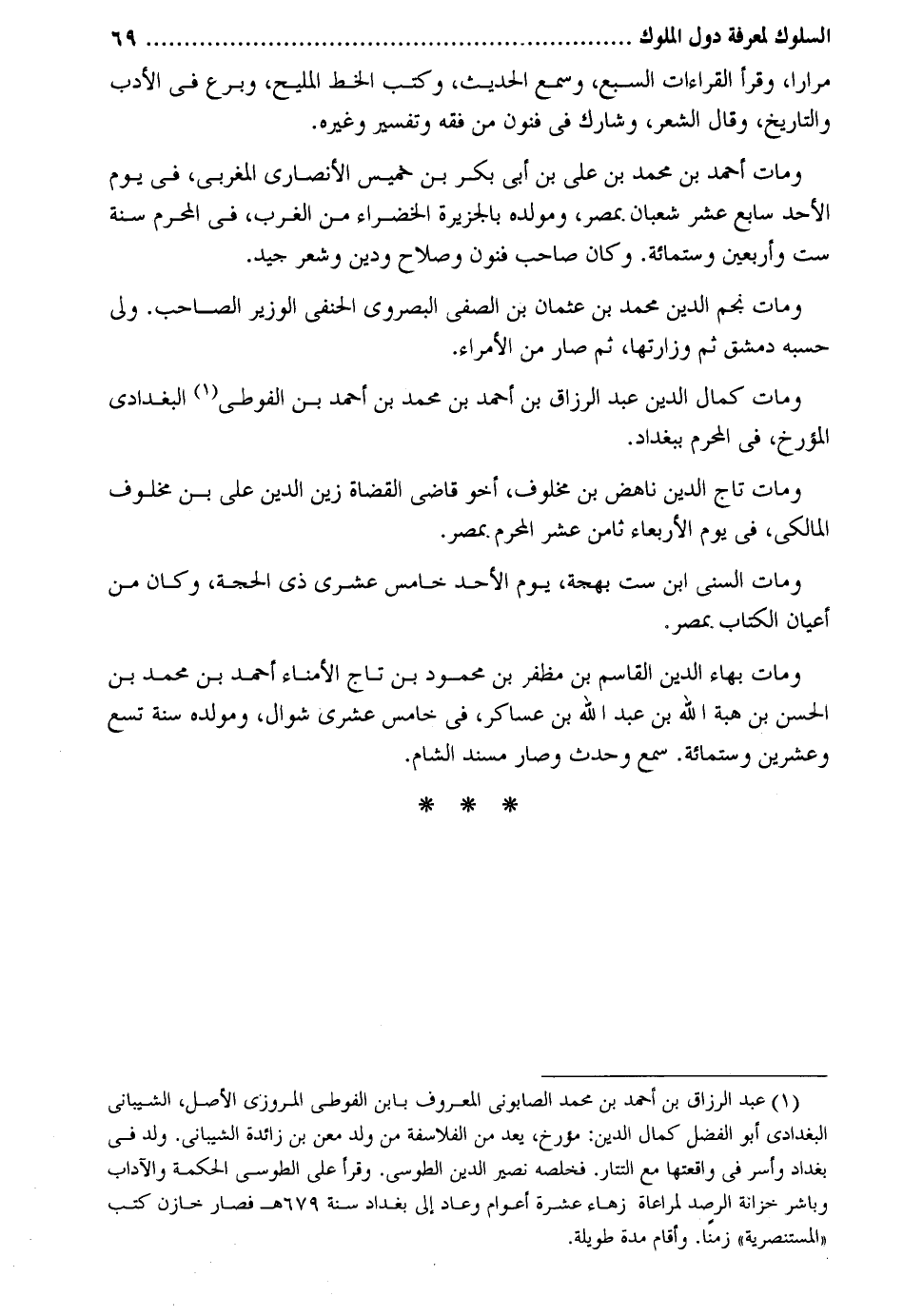 مرَارًا وَقَرَأَ الْقرَاءَات السَّبع وَسمع الحَدِيث وَكتب الْخط الْمليح وبرع فِي الْأَدَب والتاريخ وَقَالَ الشّعْر وشارك فِي فنون من فقه وَتَفْسِير وَغَيره. وَمَات أَحْمد بن مُحَمَّد بن عَليّ بن أبي بكر بن خَمِيس الْأنْصَارِيّ المغربي فِي يَوْم الْأَحَد سَابِع عشر شعْبَان بِمصْر ومولده بالجزيرة الخضراء من الغرب فِي الْمحرم سنة سِتّ وَأَرْبَعين وسِتمِائَة. وَكَانَ صَاحب فنون وَصَلَاح وَدين وَشعر جيد. وَمَات نجم الدّين مُحَمَّد بن عُثْمَان بن الصفي البصروي الْحَنَفِيّ الْوَزير الصاحب. ولي حَسبه دمشق ثمَّ وزارتها ثمَّ صَار من الْأُمَرَاء. وَمَات كَمَال الدّين عبد الرَّزَّاق بن أَحْمد بن مُحَمَّد بن أَحْمد بن الفوطي الْبَغْدَادِيّ المؤرخ فِي الْمحرم بِبَغْدَاد. وَمَات تَاج الدّين ناهض بن مخلوف أَخُو قَاضِي الْقُضَاة زين الدّين عَليّ بن مخلوف الْمَالِكِي فِي يَوْم الْأَرْبَعَاء ثامن عشر الْمحرم بِمصْر. وَمَات السّني ابْن سِتّ بهجة يَوْم الْأَحَد خَامِس عشرى ذِي الْحجَّة وَكَانَ من أَعْيَان الْكتاب بِمصْر. وَمَات بهاء الدّين الْقَاسِم بن مظفر بن مَحْمُود بن تَاج الْأُمَنَاء أَحْمد بن مُحَمَّد بن الْحسن بن هبة الله بن عبد الله بن عَسَاكِر فِي خَامِس عشرى شَوَّال ومولده سنة تسع وَعشْرين وسِتمِائَة. سمع وَحدث وَصَارَ مُسْند الشَّام.